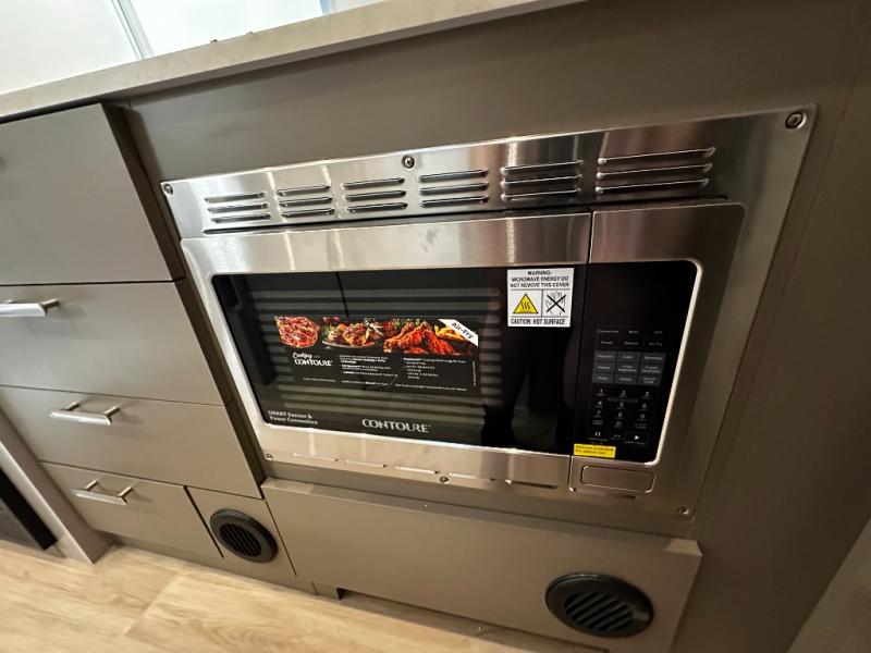 The fully equipped galley kitchen includes a two-burner cooktop, microwave, refrigerator, and stainless-steel sink, making meal prep easy no matter where your adventures take you. The wet bath is compact yet functional, providing all the convenience you need while preserving living space. High-quality finishes, durable materials, and thoughtful lighting make the interior both welcoming and practical.