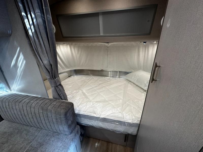 The Caravel 20FB features Airstream’s signature aluminum exterior and panoramic front windows, delivering both durability and timeless style. Inside, the front bedroom suite offers a private retreat for restful nights, while the rear dinette converts into additional sleeping space for family or guests. Smart storage solutions throughout maximize space and keep your gear organized.