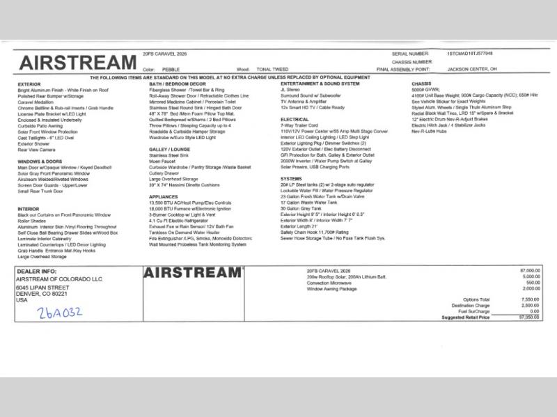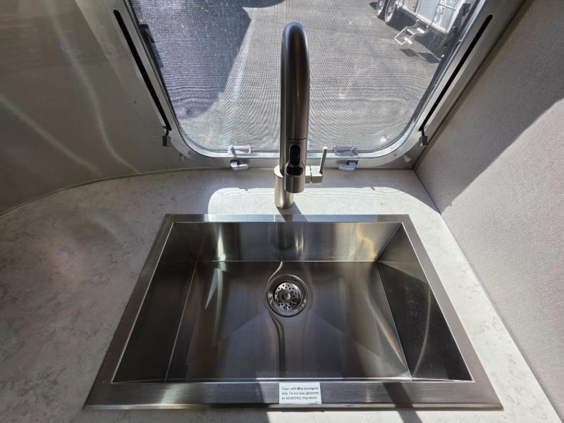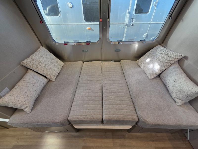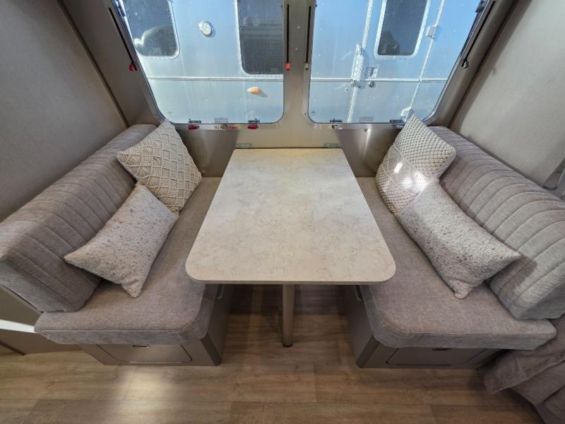 You'll always have a stylish and comfortable place to stay with the Airstream Caravel travel trailer! The manual Zip Dee patio awning can be paired with matching optional window awnings that can help keep the interior cool and private. The rear polished bumper with storage will help you keep your tools, cords, and more hidden away in a bonus storage space, and the JL Audio stereo with Bluetooth connectivity and four speakers, surround sound, and subwoofer will play your music throughout the trailer. You can stay powered while off the grid If you add the optional solar package, depending on the model you choose, and the blackout curtains will let you have privacy when you head to bed. The stainless steel front stone guard protection will prevent damage to the body of your trailer while towing, and the panoramic windows will make the interior fresh and bright with natural sunlight.