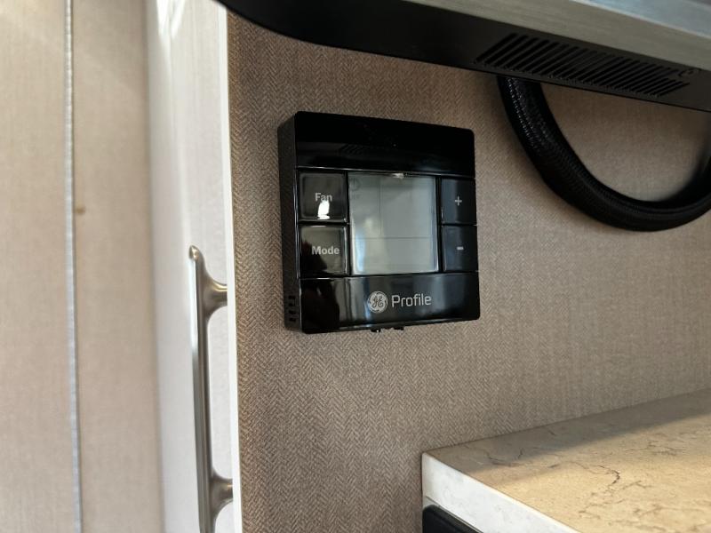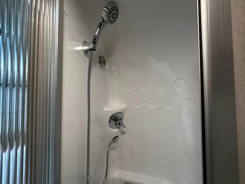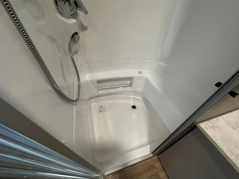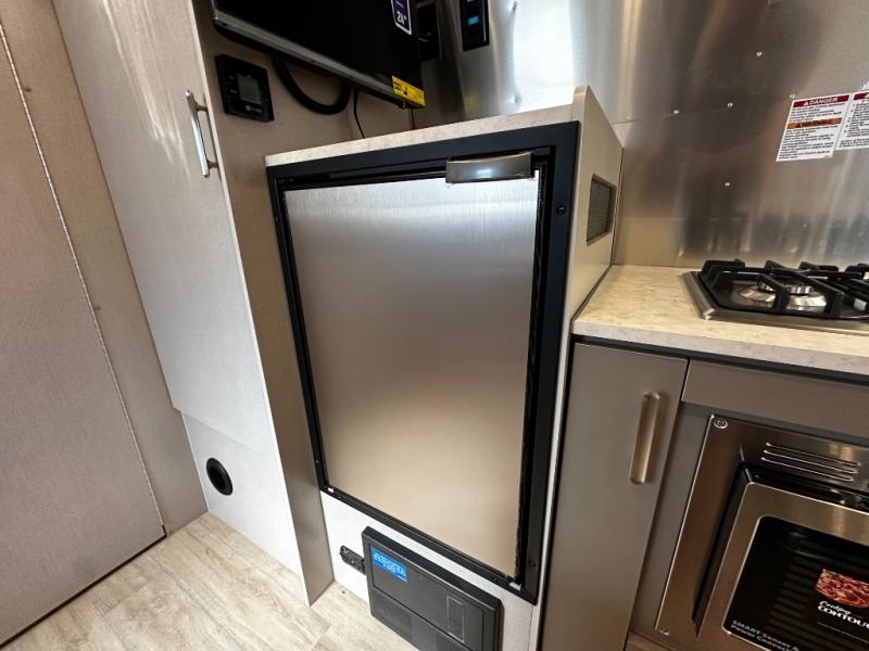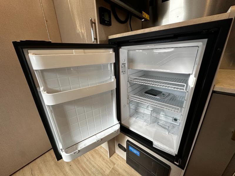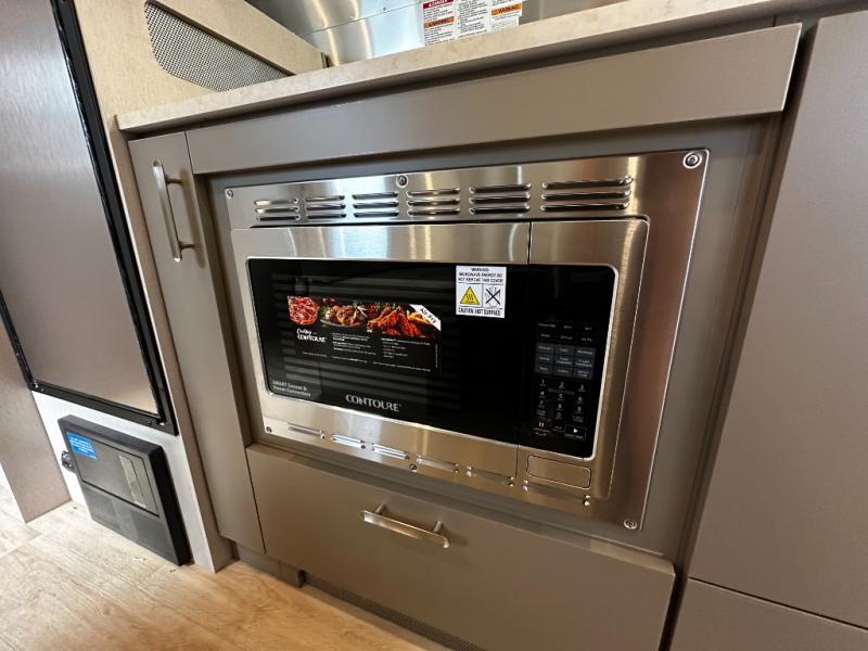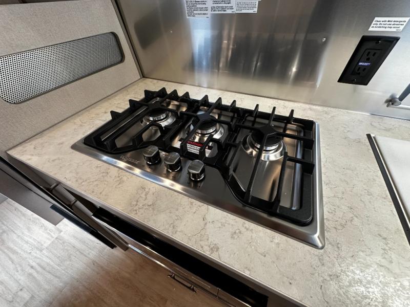 The fully equipped galley kitchen includes a two-burner cooktop, microwave, refrigerator, and stainless-steel sink, making meal preparation easy on the go. The wet bath provides a compact yet functional space for showers and personal care. Premium finishes, durable materials, and thoughtful lighting enhance the overall living experience.