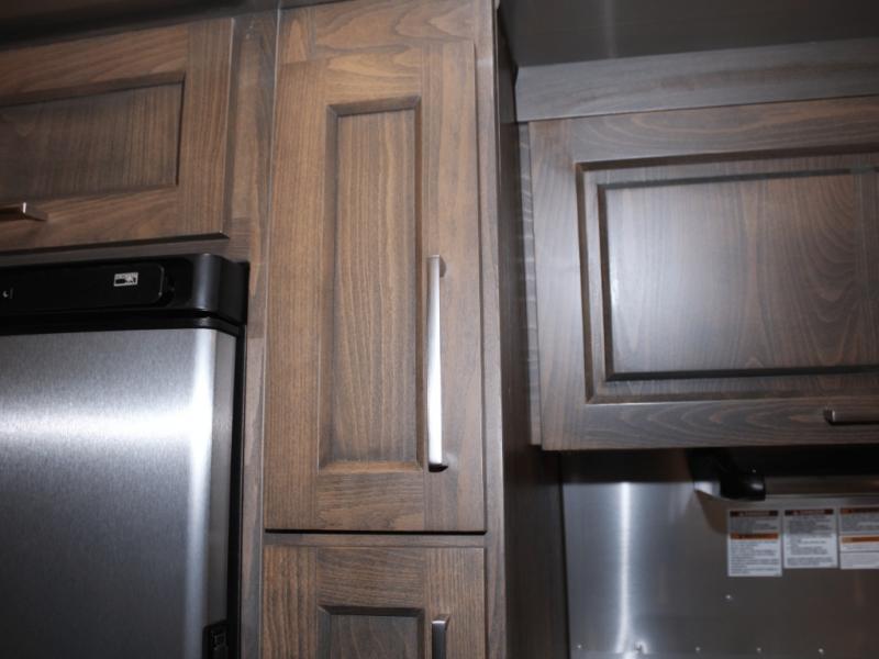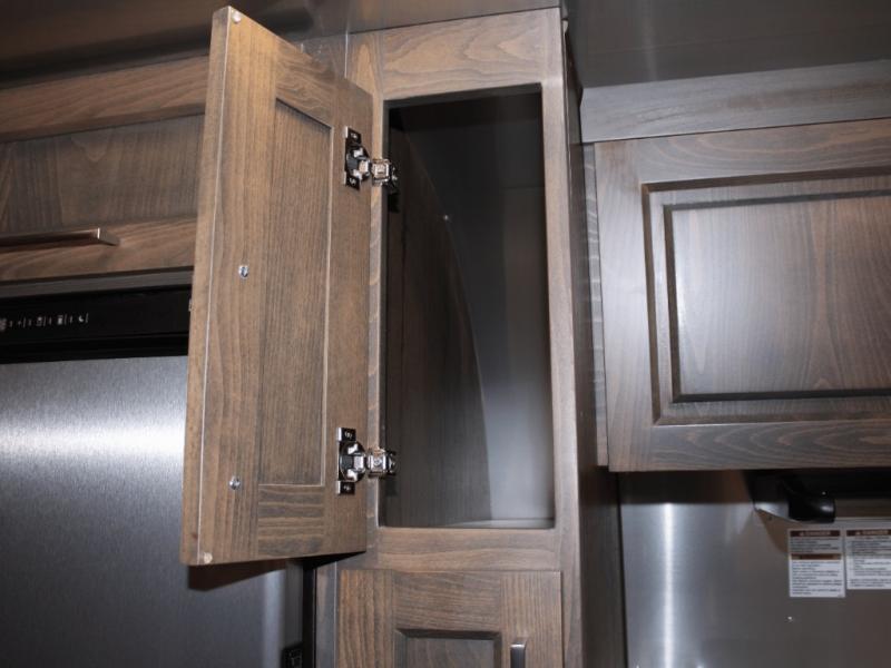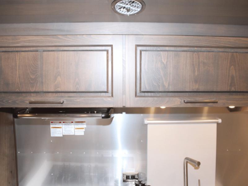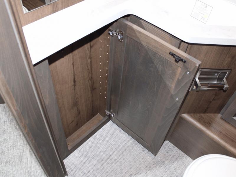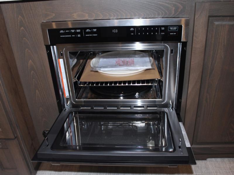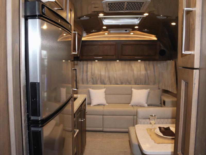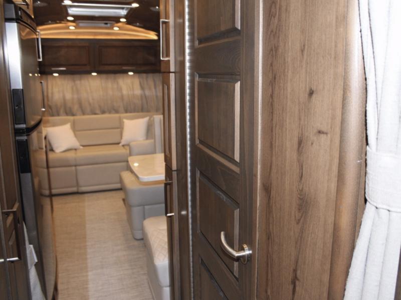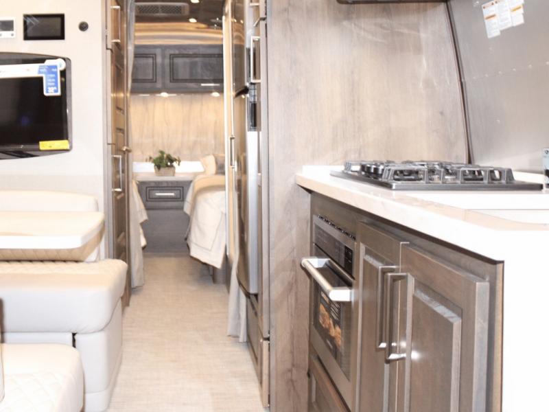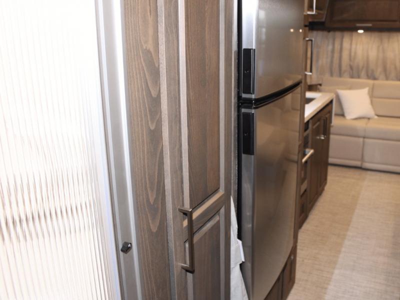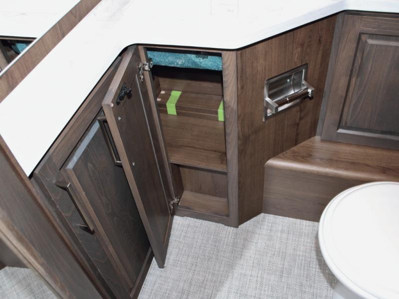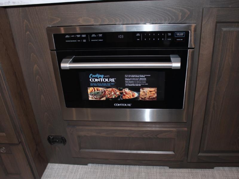 Cook in style with a three-burner cooktop, convection microwave, and an 8.2 cu. ft. 12V refrigerator that keeps your ingredients fresh and your meals delicious. The premium kitchen is crafted with top-tier appliances and handcrafted hardwood cabinetry, blending style with function.