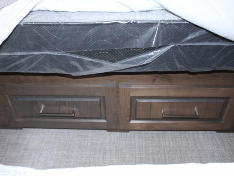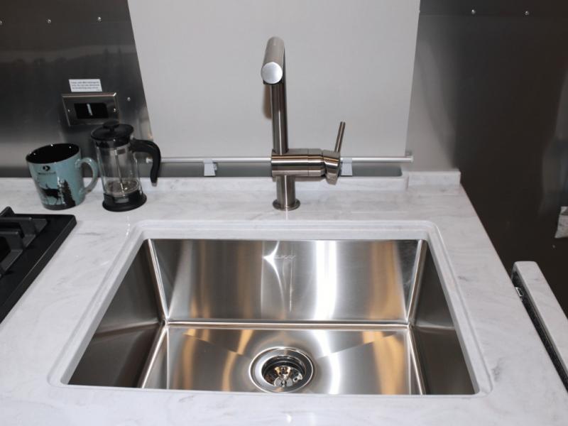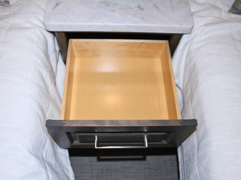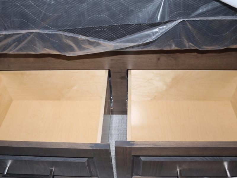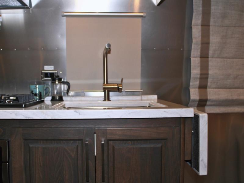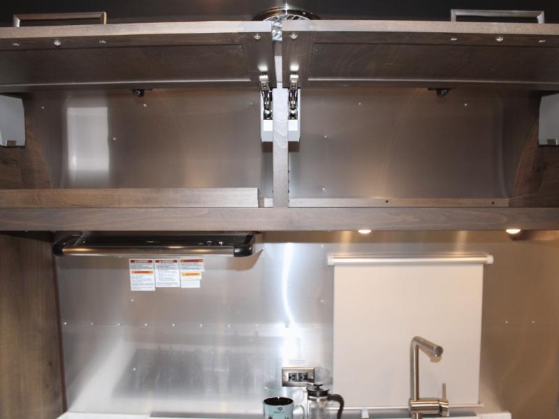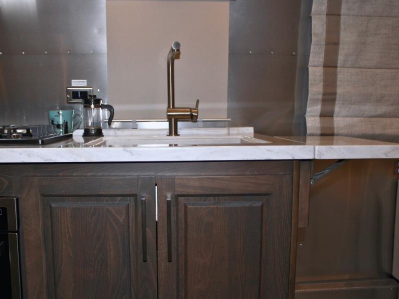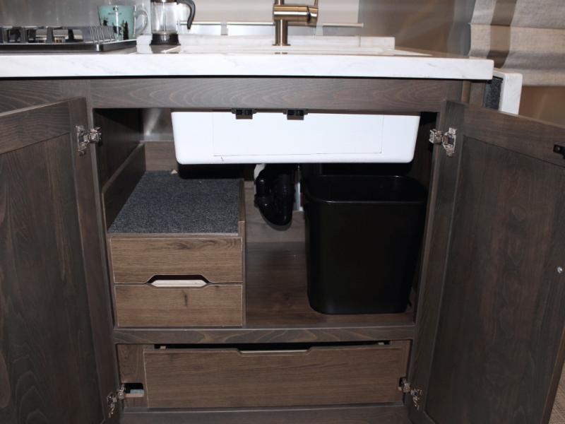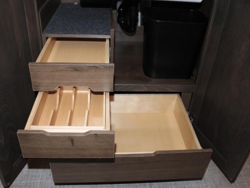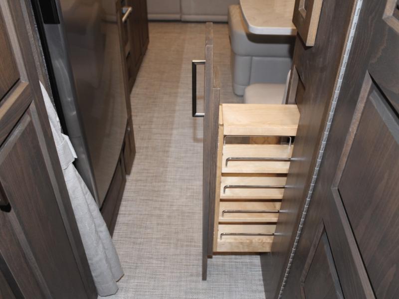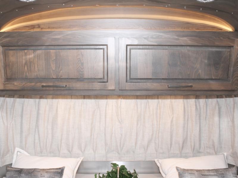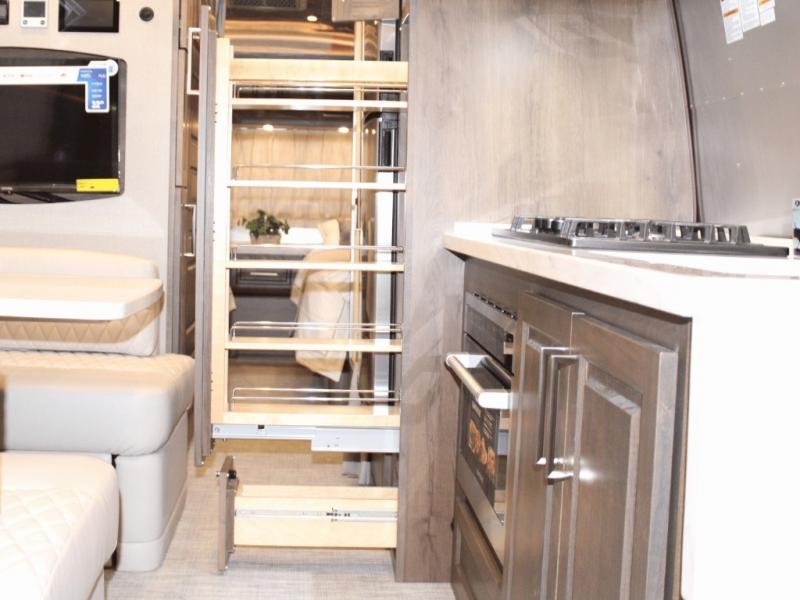 Cook in style with a three-burner cooktop, convection microwave, and an 8.2 cu. ft. 12V refrigerator that keeps your ingredients fresh and your meals delicious. The premium kitchen is crafted with top-tier appliances and handcrafted hardwood cabinetry, blending style with function.