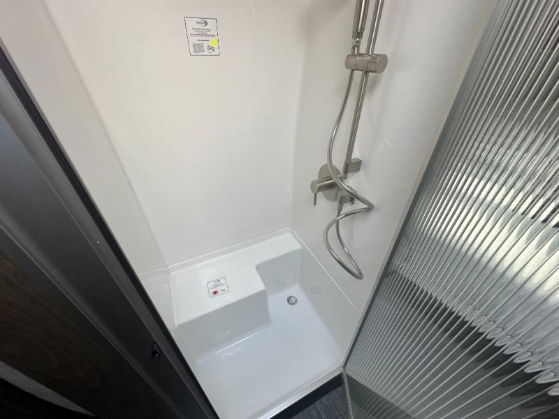 You'll have everything you need for a luxurious stay in this cozy travel trailer. The rear bedroom includes a power queen bed so you can adjust the head if you like to read at night, plus there are nightstands on either side of the bed for your phone, glasses, and a cup of water. You might also like to choose the optional twin beds in place of the queen bed, depending on your needs. The private toilet and vanity features plenty of counter space for your necessities, and the independent shower is just across the hall with its own door for privacy. Your crew will love to relax on the front powered lounge that has a perfect view of the 32" Smart TV with Bluetooth and this space can be converted to sleeping space for your guests, along with the powered dinette.