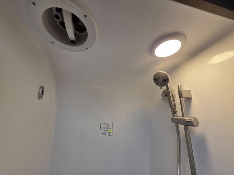 You'll have everything you need for a luxurious stay in this cozy travel trailer. The rear bedroom includes a power queen bed so you can adjust the head if you like to read at night, plus there are nightstands on either side of the bed for your phone, glasses, and a cup of water. You might also like to choose the optional twin beds in place of the queen bed, depending on your needs. The private toilet and vanity features plenty of counter space for your necessities, and the independent shower is just across the hall with its own door for privacy. Your crew will love to relax on the front powered lounge that has a perfect view of the 32" Smart TV with Bluetooth and this space can be converted to sleeping space for your guests, along with the powered dinette.