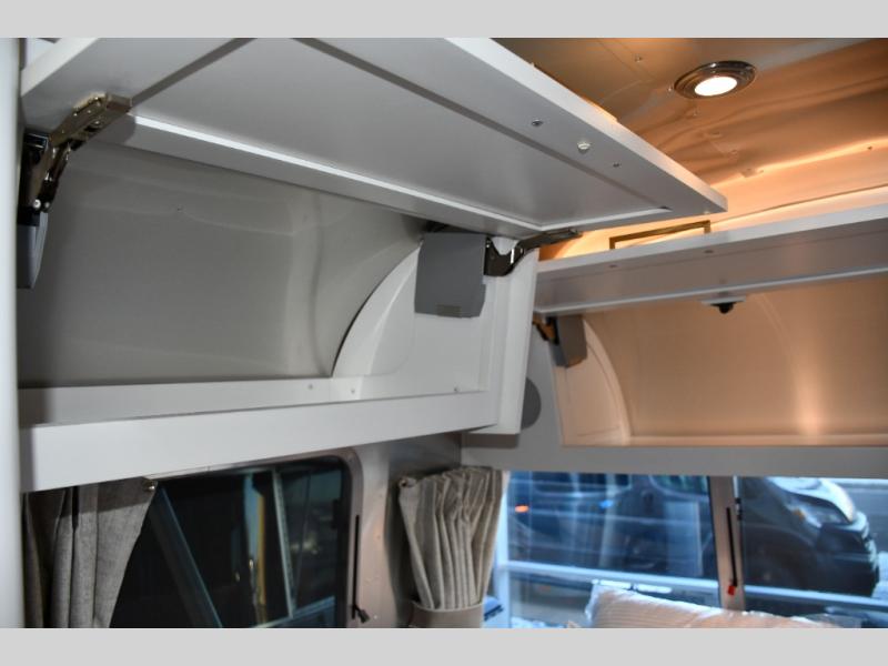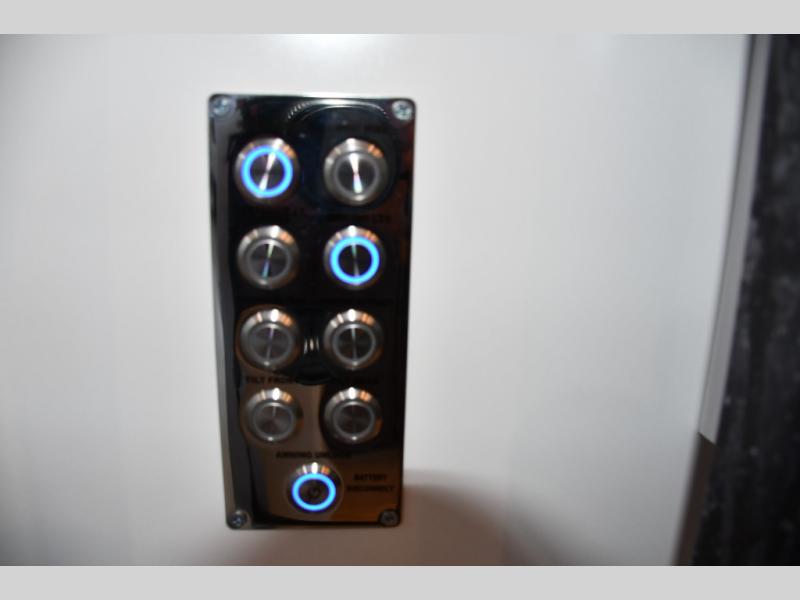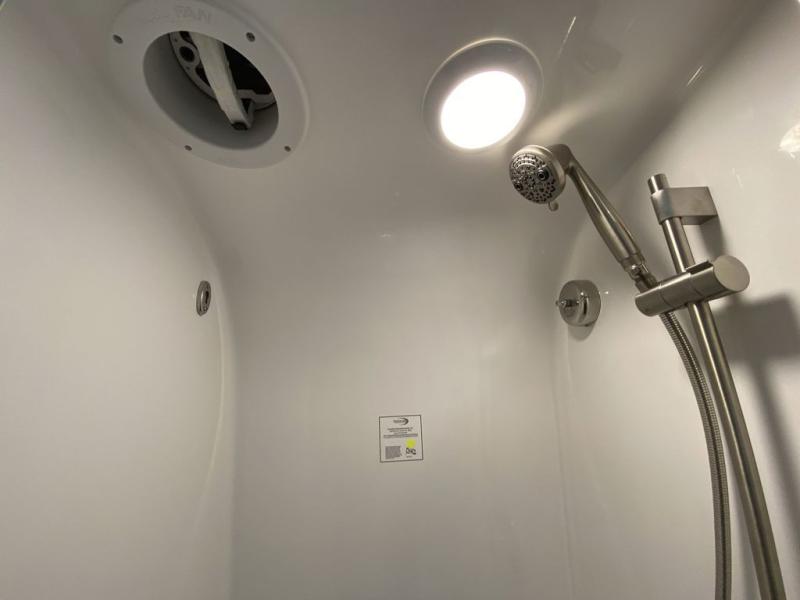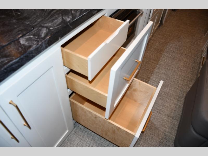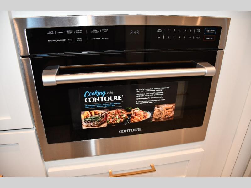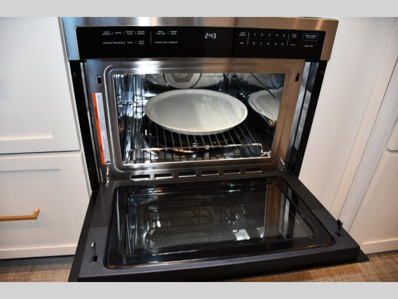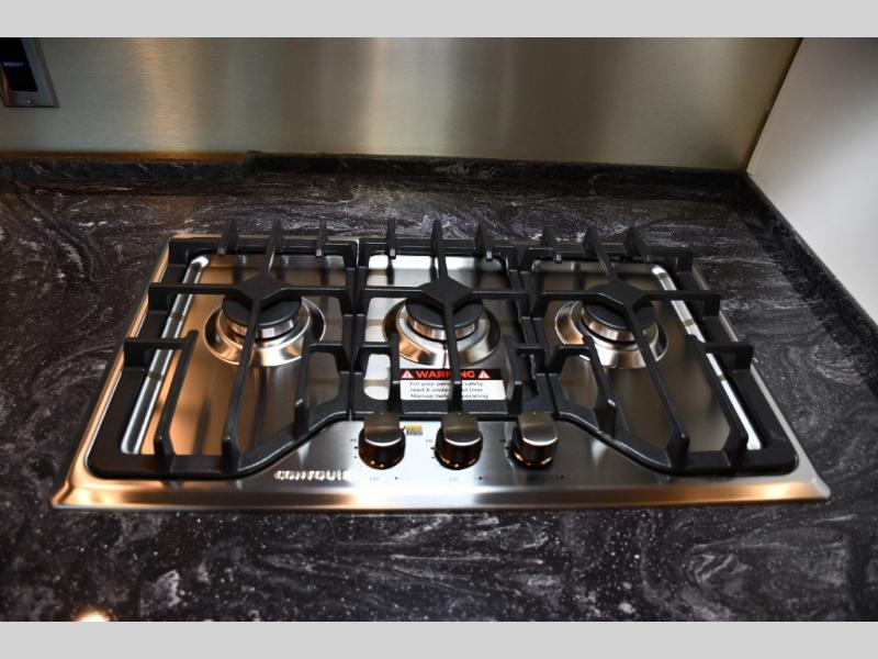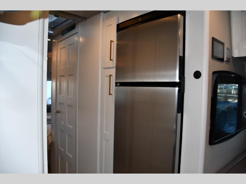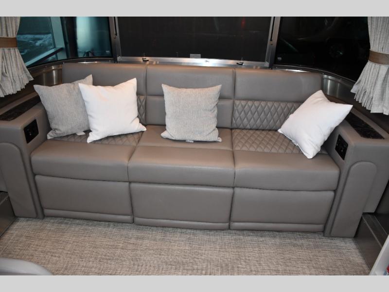 The front living area offers plush seating, generous windows, and a welcoming space for relaxing, entertaining, or enjoying a quiet evening indoors. The premium galley is equipped with high-end appliances, solid-surface countertops, and abundant cabinetry, making it perfect for travelers who enjoy cooking on the road. A spacious bathroom with upscale fixtures delivers true residential comfort.