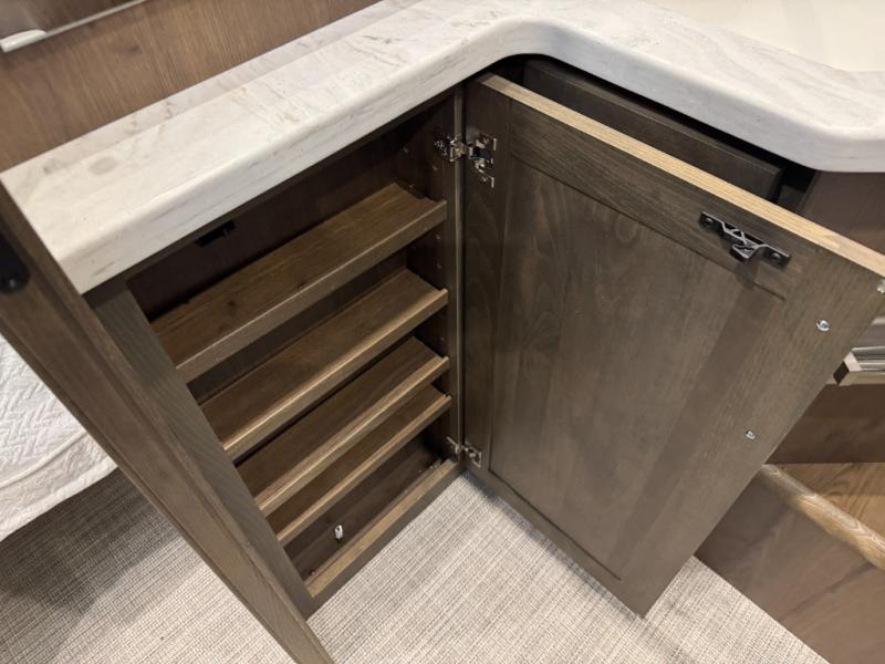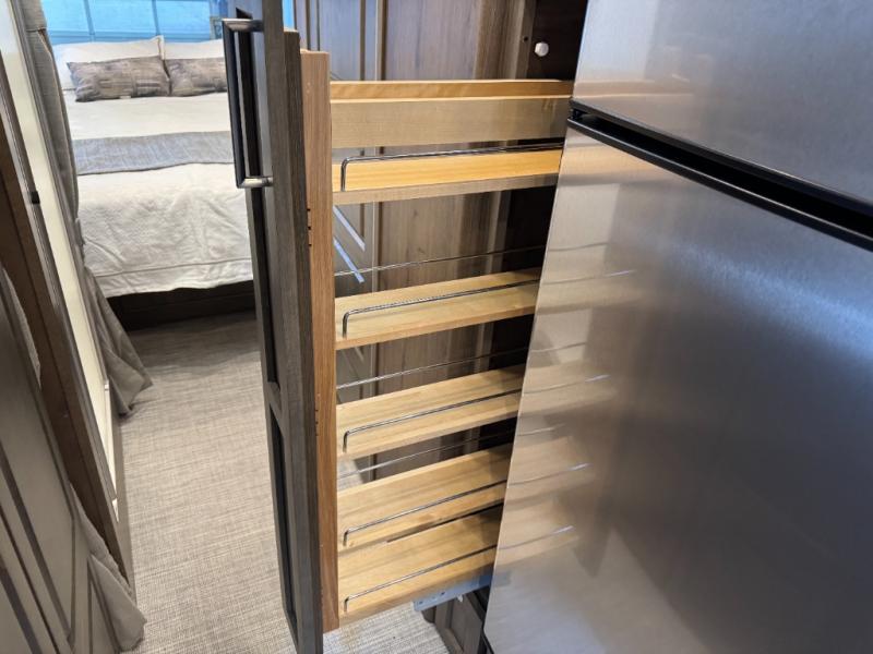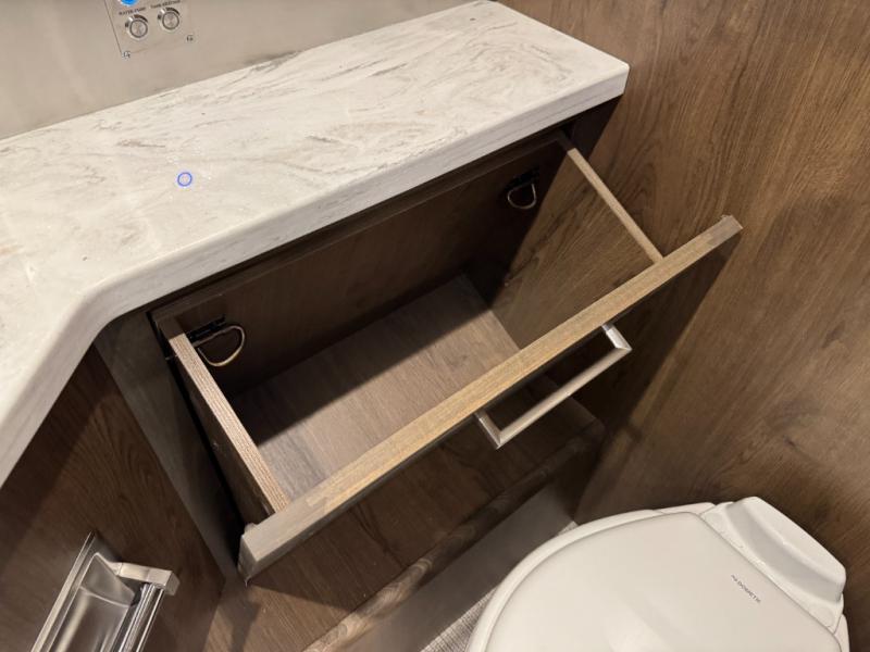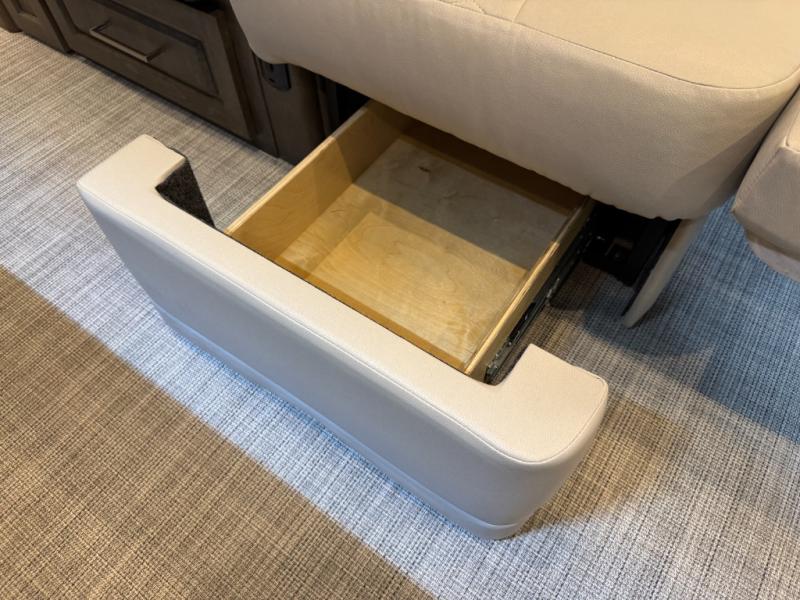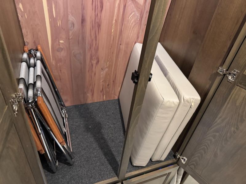 You'll have everything you need for a luxurious stay in this cozy travel trailer. The rear bedroom includes a power queen bed so you can adjust the head if you like to read at night, plus there are nightstands on either side of the bed for your phone, glasses, and a cup of water. You might also like to choose the optional twin beds in place of the queen bed, depending on your needs. The private toilet and vanity features plenty of counter space for your necessities, and the independent shower is just across the hall with its own door for privacy. Your crew will love to relax on the front powered lounge that has a perfect view of the 32" Smart TV with Bluetooth and this space can be converted to sleeping space for your guests, along with the powered dinette.
