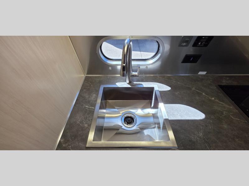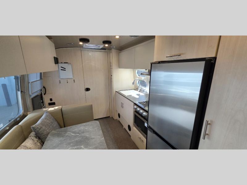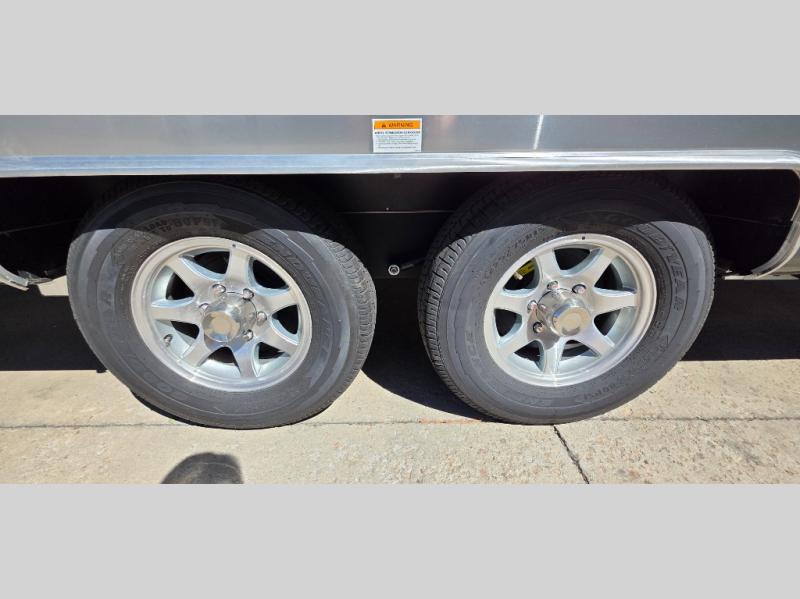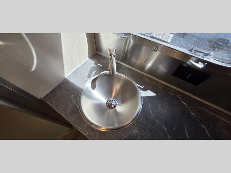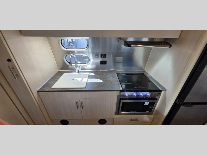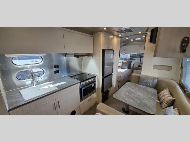 With each Flying Cloud travel trailer by Airstream, there are two axles, and each is built for ease of towing, plus there is a rear-view camera to make reversing and parking easier, and stainless steel front stone guards to protect the lower segments from road debris. The iconic Airstream design is created outside and inside by the semi-monocoque aluminum superstructure, the temperature reducing one-piece white aluminum roof, the panoramic front windows, and the stylish aluminum wheels. The interior will have you feeling right at home with handcrafted cabinetry, plenty of storage and counter space, sleek roller blinds and blackout curtains, plus residential style faucets!
