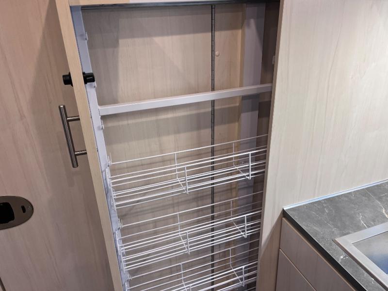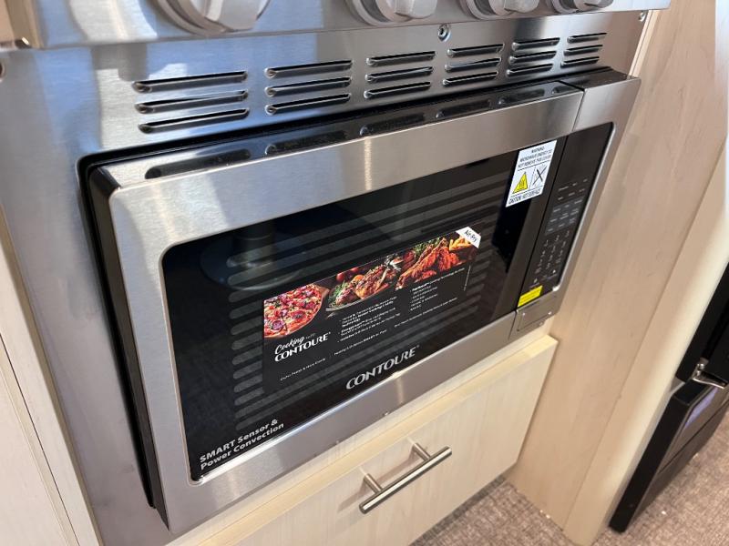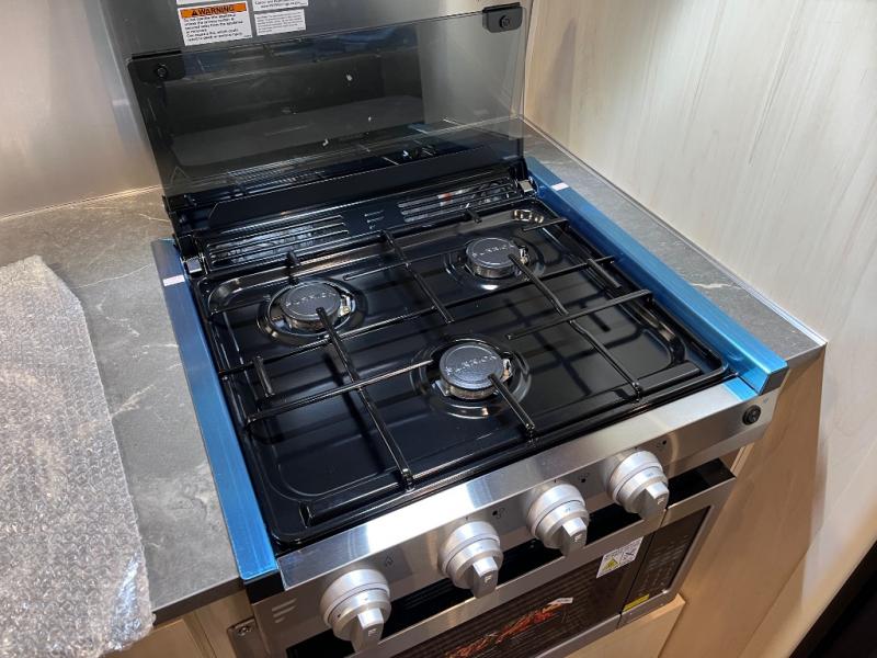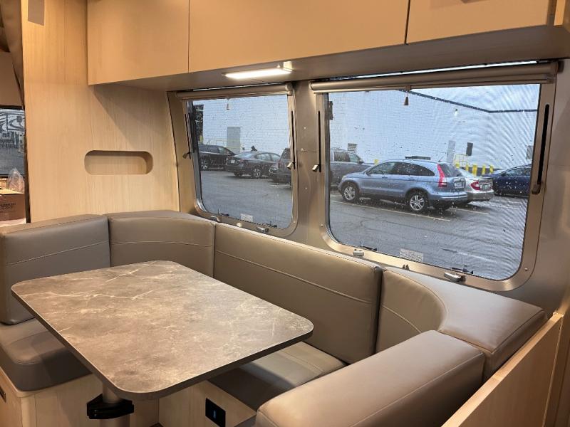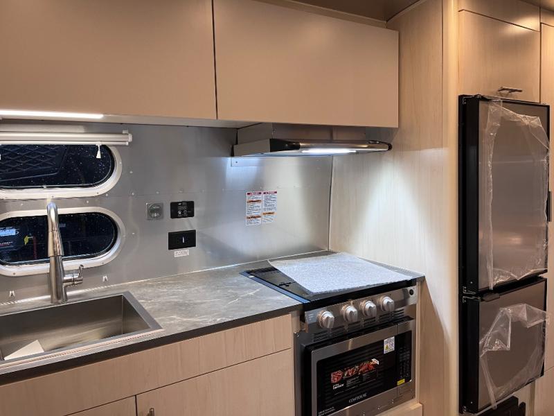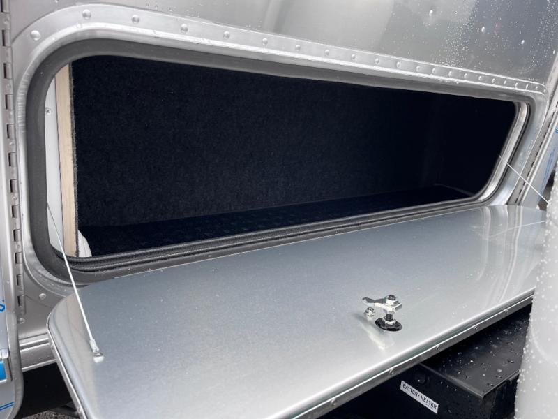With each Flying Cloud travel trailer by Airstream, there are two axles, and each is built for ease of towing, plus there is a rear-view camera to make reversing and parking easier, and stainless-steel front stone guards to protect the lower segments from road debris. The iconic Airstream design is created outside and inside by the semi-monocoque aluminum superstructure, the temperature reducing one-piece white aluminum roof, the panoramic front windows, and the stylish aluminum wheels. The interior will have you feeling right at home with handcrafted cabinetry, plenty of storage and counter space, sleek roller blinds and blackout curtains, plus residential style faucets!