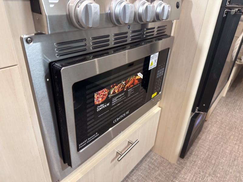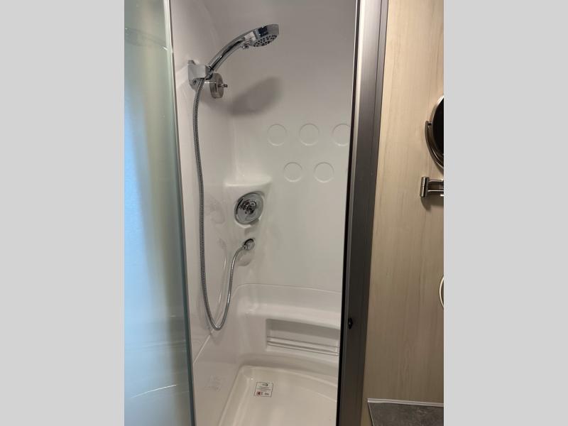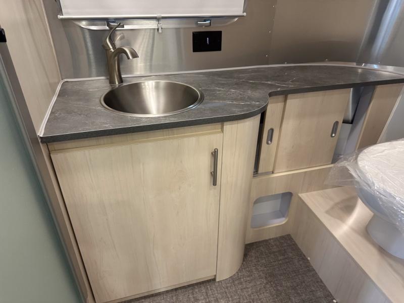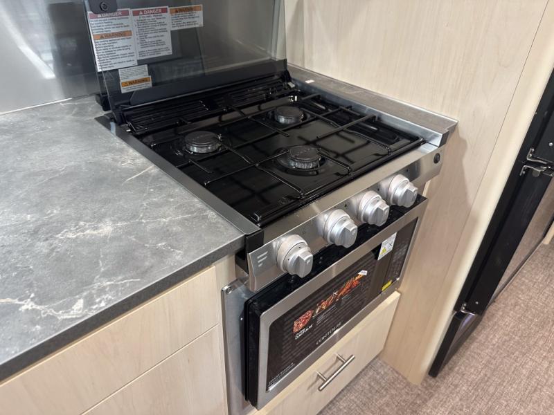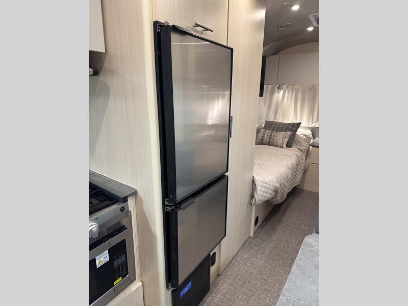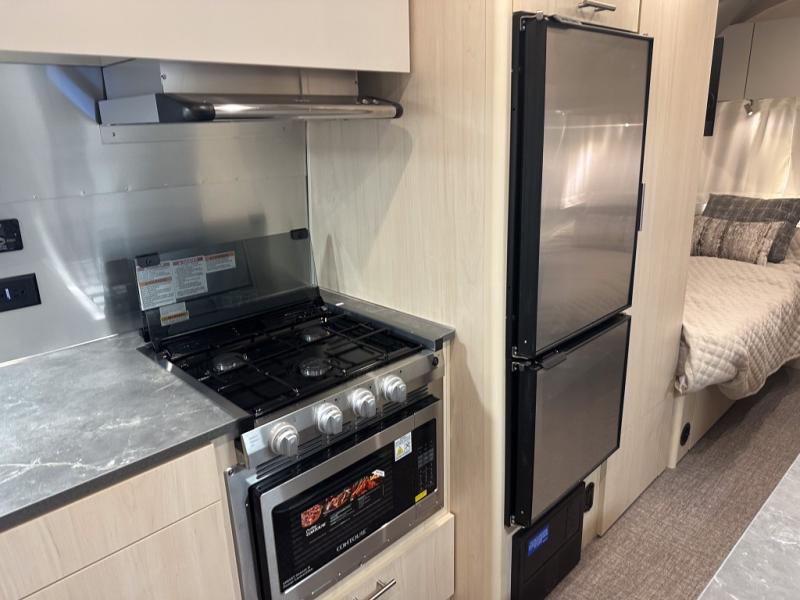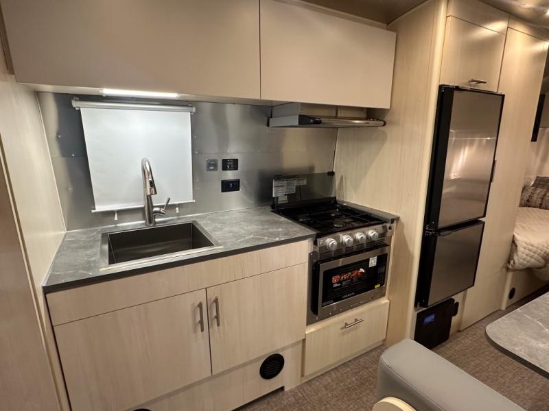 With each Flying Cloud travel trailer by Airstream, there are two axles, and each is built for ease of towing, plus there is a rear-view camera to make reversing and parking easier, and stainless-steel front stone guards to protect the lower segments from road debris. The iconic Airstream design is created outside and inside by the semi-monocoque aluminum superstructure, the temperature reducing one-piece white aluminum roof, the panoramic front windows, and the stylish aluminum wheels. The interior will have you feeling right at home with handcrafted cabinetry, plenty of storage and counter space, sleek roller blinds and blackout curtains, plus residential style faucets!