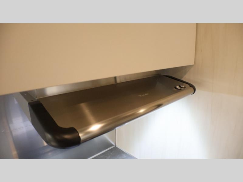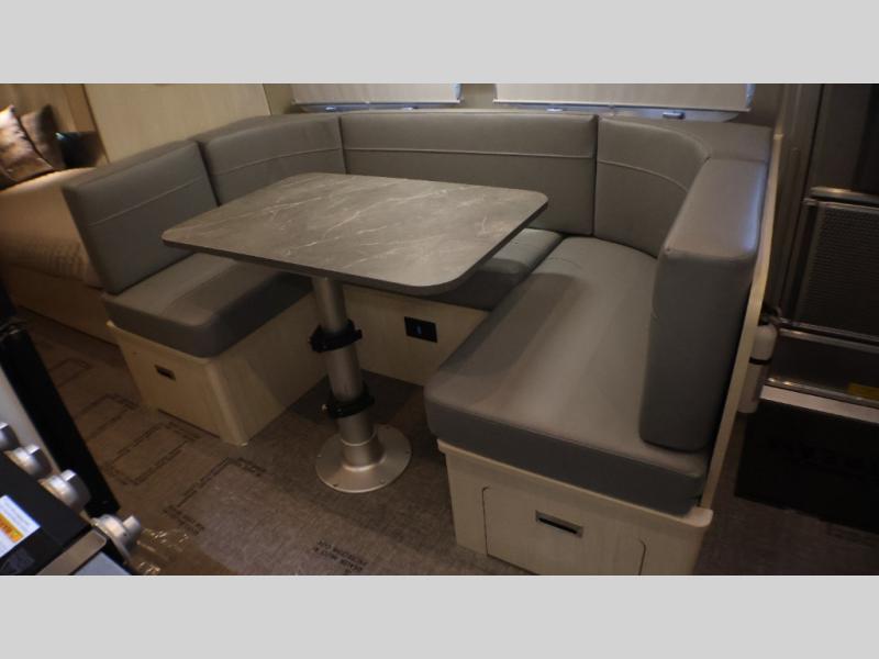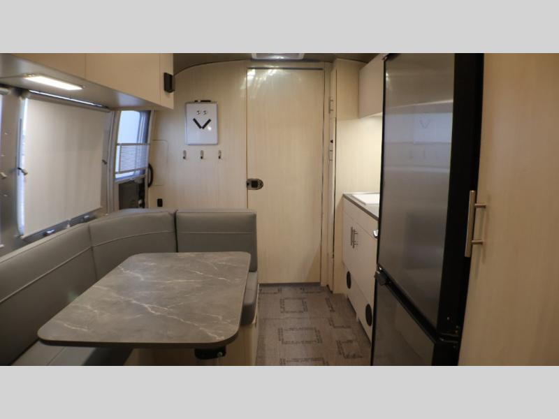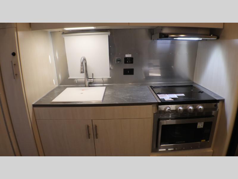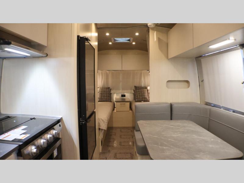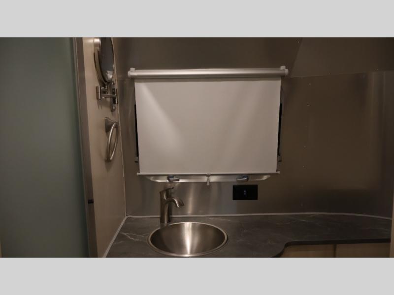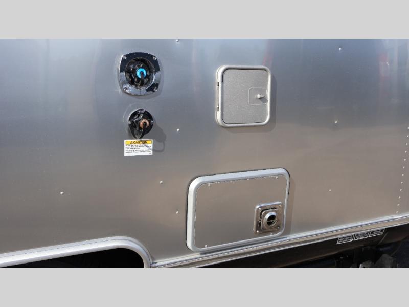With each Flying Cloud travel trailer by Airstream, there are two axles, and each is built for ease of towing, plus there is a rear-view camera to make reversing and parking easier, and stainless-steel front stone guards to protect the lower segments from road debris. The iconic Airstream design is created outside and inside by the semi-monocoque aluminum superstructure, the temperature reducing one-piece white aluminum roof, the panoramic front windows, and the stylish aluminum wheels. The interior will have you feeling right at home with handcrafted cabinetry, plenty of storage and counter space, sleek roller blinds and blackout curtains, plus residential style faucets!