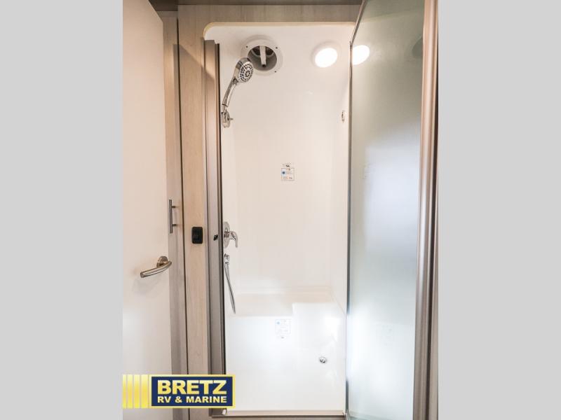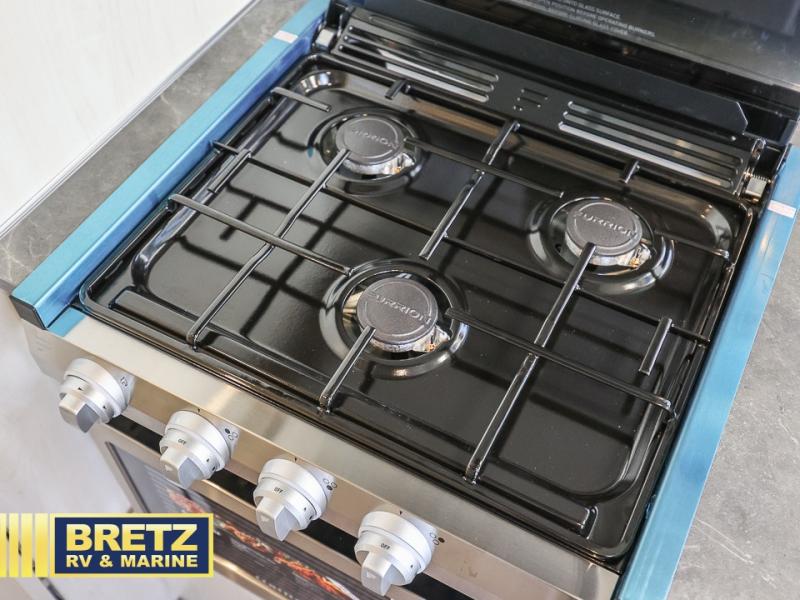 When you enjoy the finer things when traveling, this trailer will provide that for you plus lots of natural lighting and plenty of conveniences. The convertible rear dinette offers a place to dine and socialize for four, and there is a lounging area along the side. The table acts as a sturdy base below the cushions when you need some sleeping space. The front bedroom offers more panoramic windows and a comfortable queen bed or optional twin beds with a view each morning and night. You will find storage for your clothing, and a split bathroom with a private toilet and sink on one side and a shower that stands independently across the hall. And the kitchen offers everything you need to make meals including extra counter space and a 12V refrigerator for leftovers. The Midnight Flamingo optional upgrade is also available on this model for even more striking style and functional upgrades!