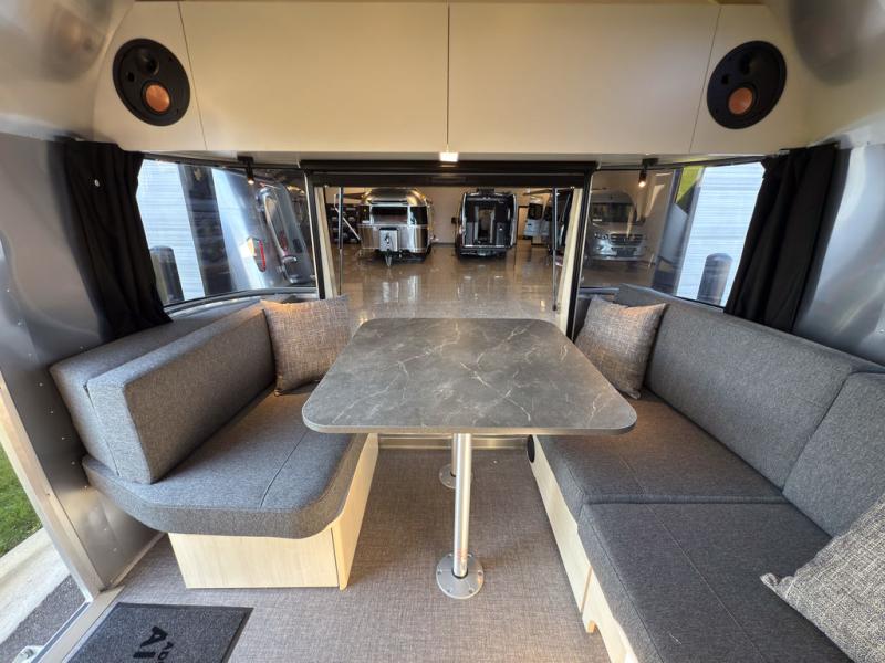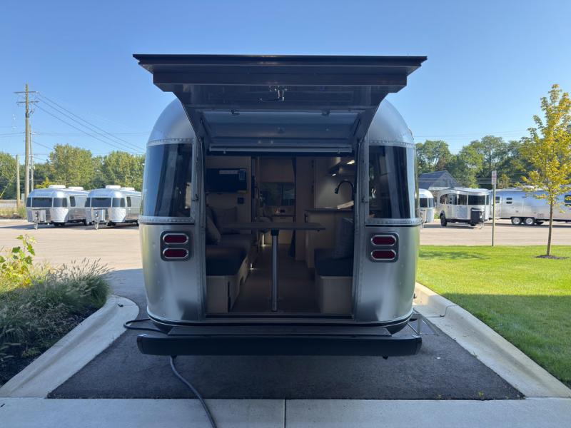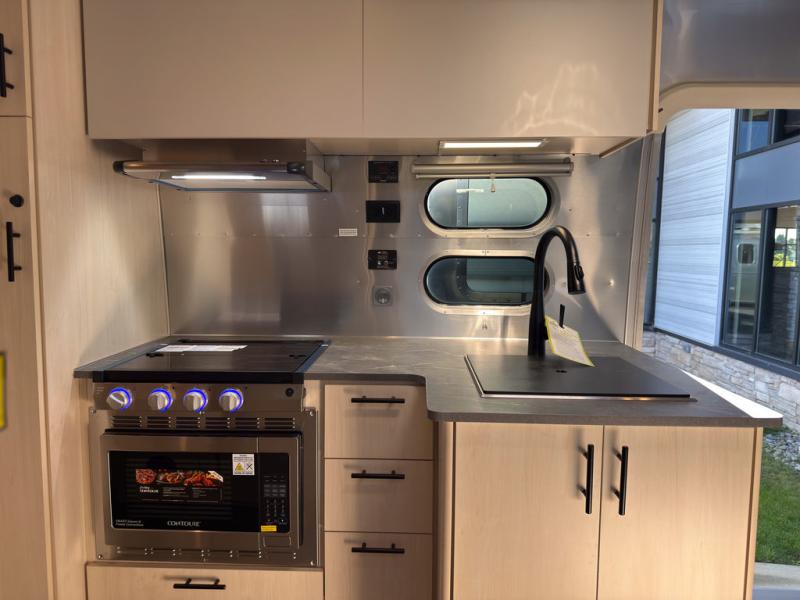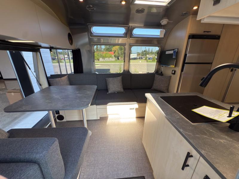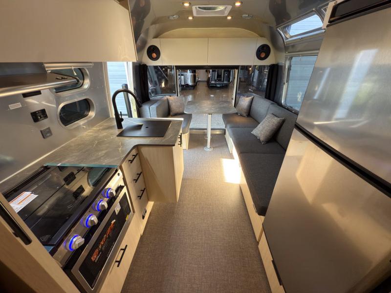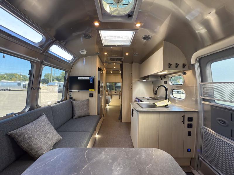 With each Flying Cloud travel trailer by Airstream, there are two axles, and each is built for ease of towing, plus there is a rear-view camera to make reversing and parking easier, and stainless-steel front stone guards to protect the lower segments from road debris. The iconic Airstream design is created outside and inside by the semi-monocoque aluminum superstructure, the temperature reducing one-piece white aluminum roof, the panoramic front windows, and the stylish aluminum wheels. The interior will have you feeling right at home with handcrafted cabinetry, plenty of storage and counter space, sleek roller blinds and blackout curtains, plus residential style faucets!