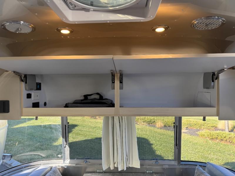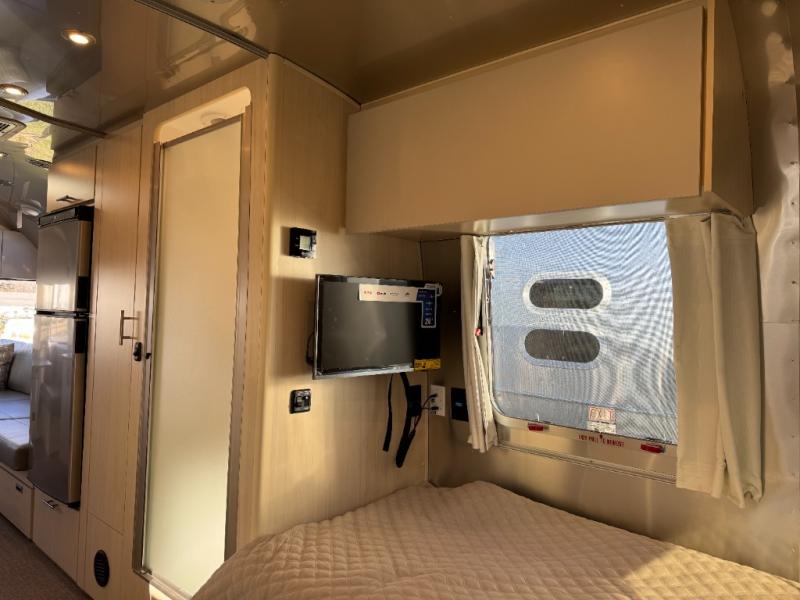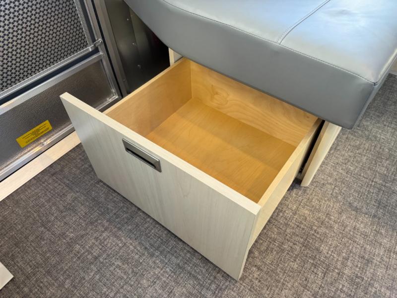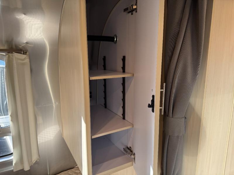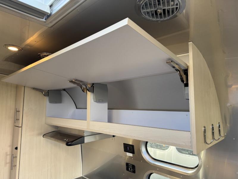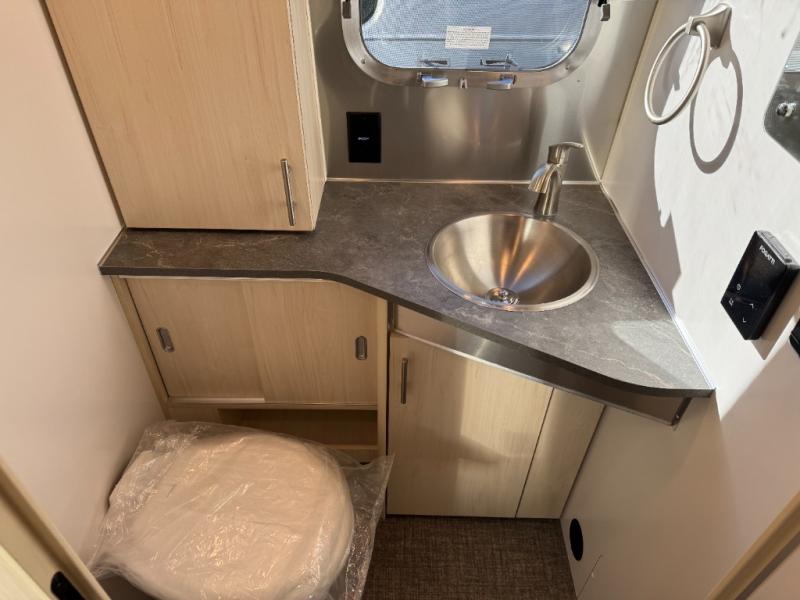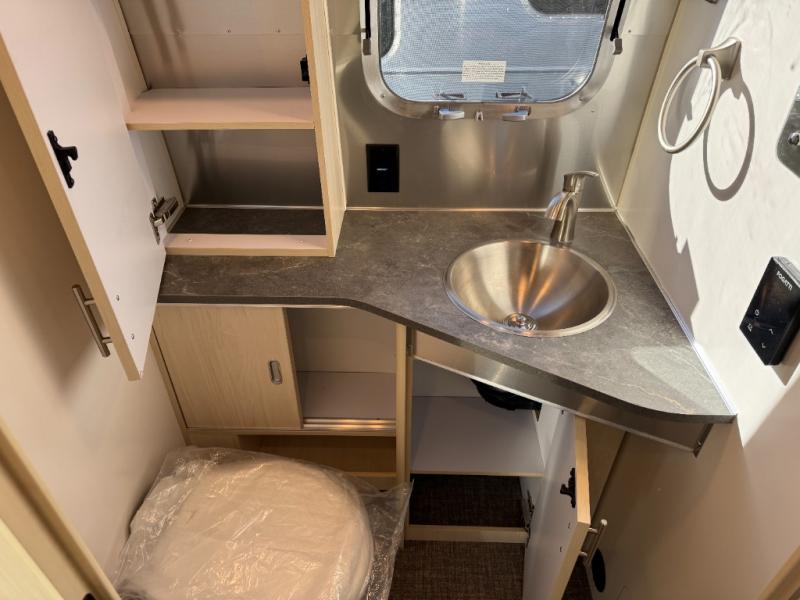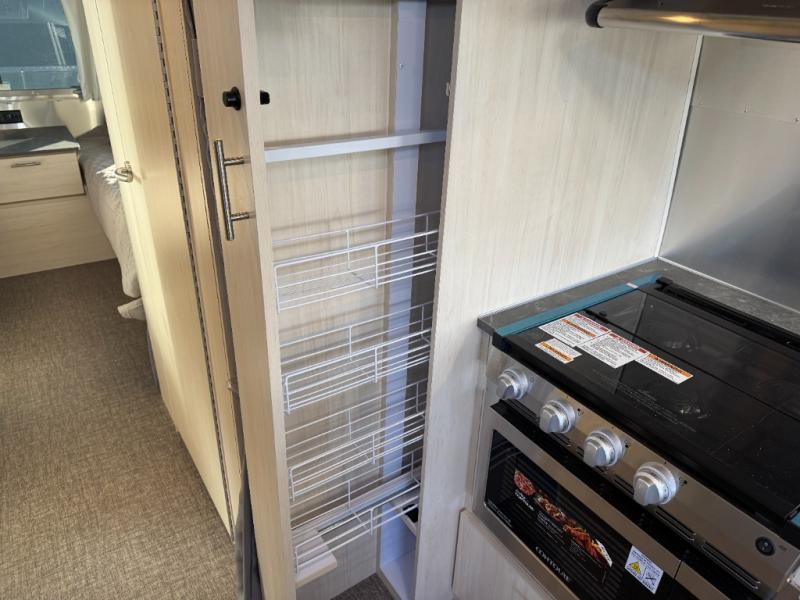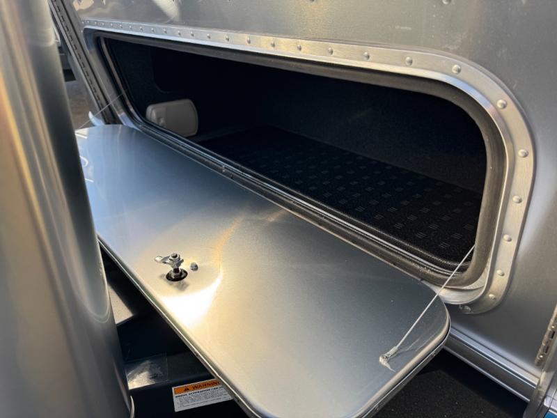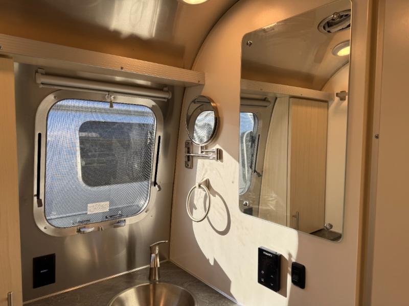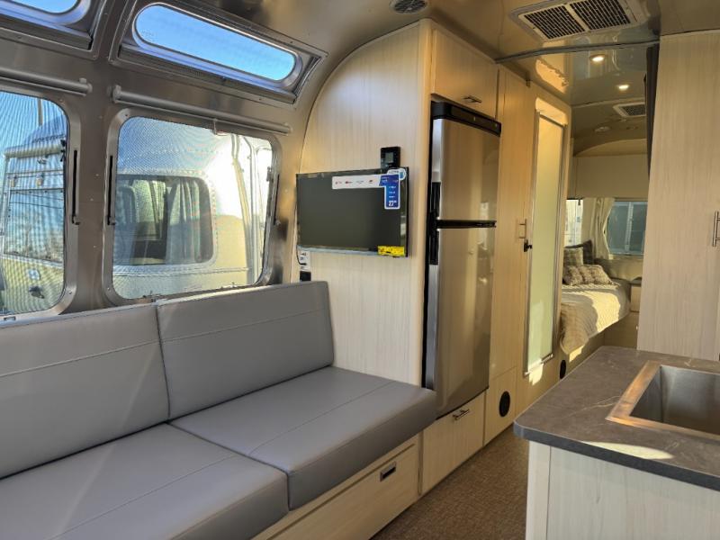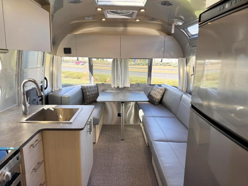 With each Flying Cloud travel trailer by Airstream, there are two axles, and each is built for ease of towing, plus there is a rear-view camera to make reversing and parking easier, and stainless-steel front stone guards to protect the lower segments from road debris. The iconic Airstream design is created outside and inside by the semi-monocoque aluminum superstructure, the temperature reducing one-piece white aluminum roof, the panoramic front windows, and the stylish aluminum wheels. The interior will have you feeling right at home with handcrafted cabinetry, plenty of storage and counter space, sleek roller blinds and blackout curtains, plus residential style faucets!