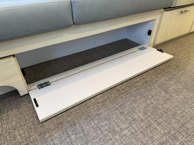 When you enjoy the finer things when traveling, this trailer will provide that for you plus lots of natural lighting and plenty of conveniences. The convertible rear dinette offers a place to dine and socialize for four, and there is a lounging area along the side with a TV on the wall. The table acts as a sturdy base below the cushions when you need some sleeping space. The front bedroom offers more panoramic windows and comfortable twin beds with a view each morning and night. You will find storage for your clothing, and a split bathroom with a half bath on one side and a shower that stands independently across the hall. And the kitchen offers everything you need to make meals including extra counter space and a 12V refrigerator for leftovers. The Midnight Flamingo optional upgrade is also available on this model for even more striking style and functional upgrades!