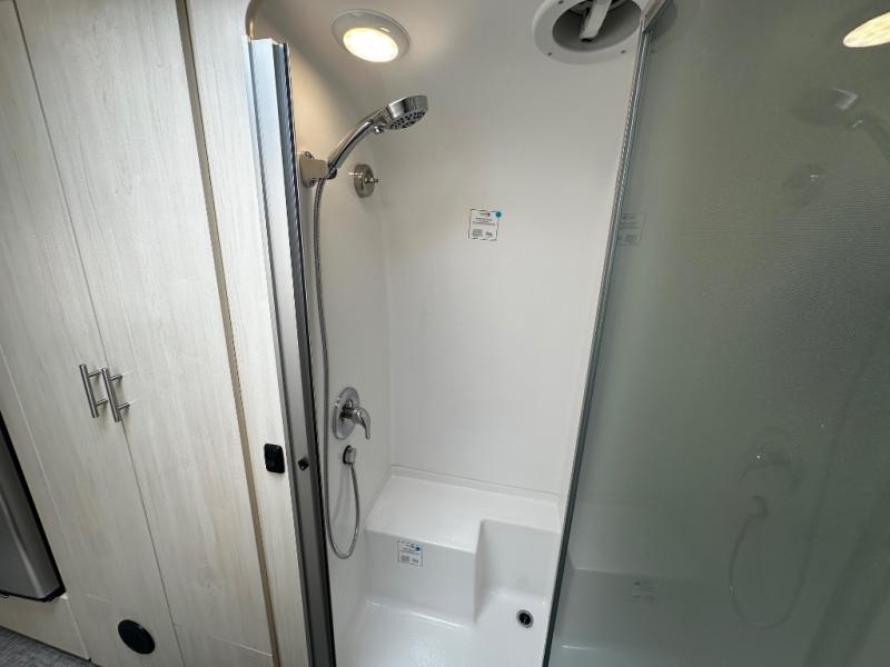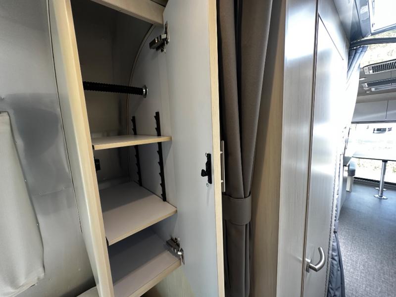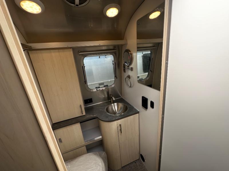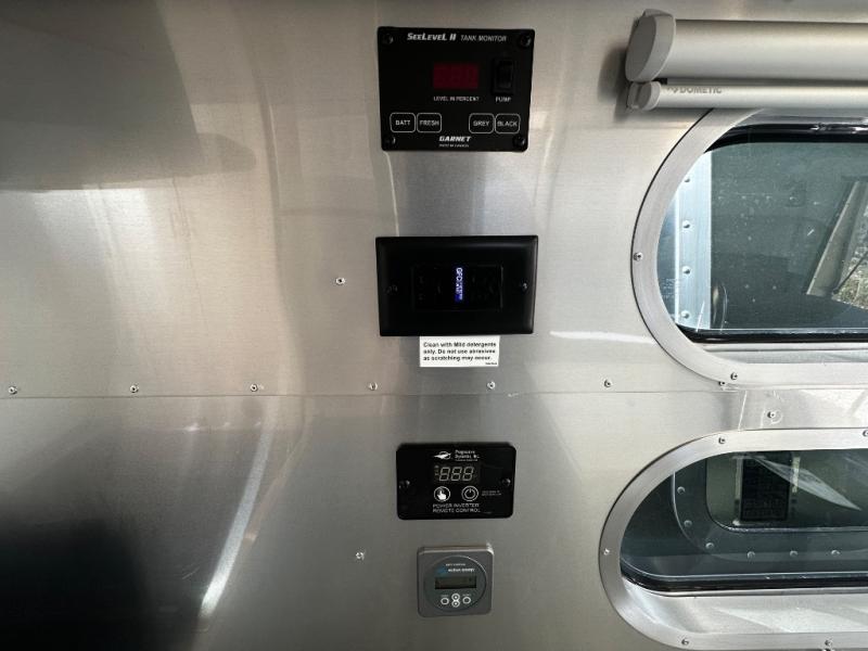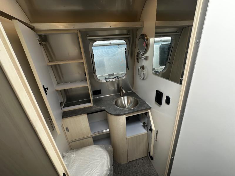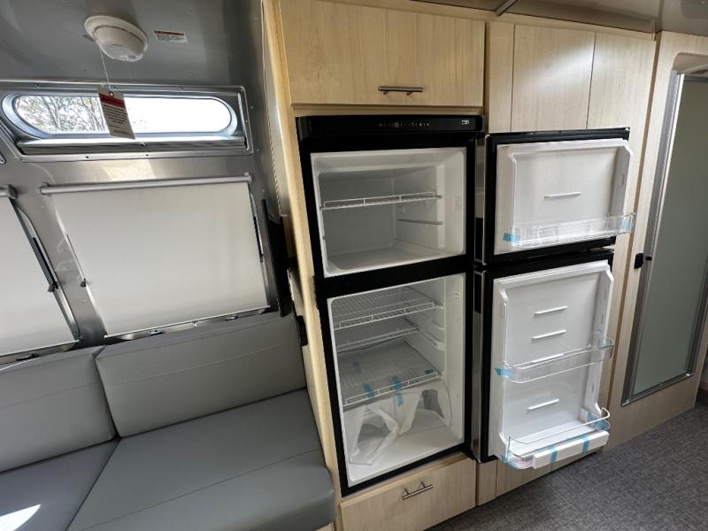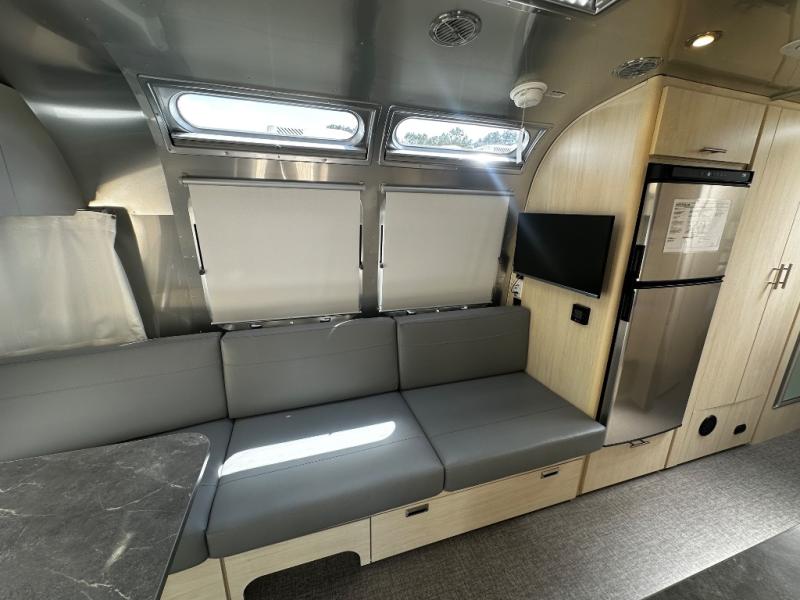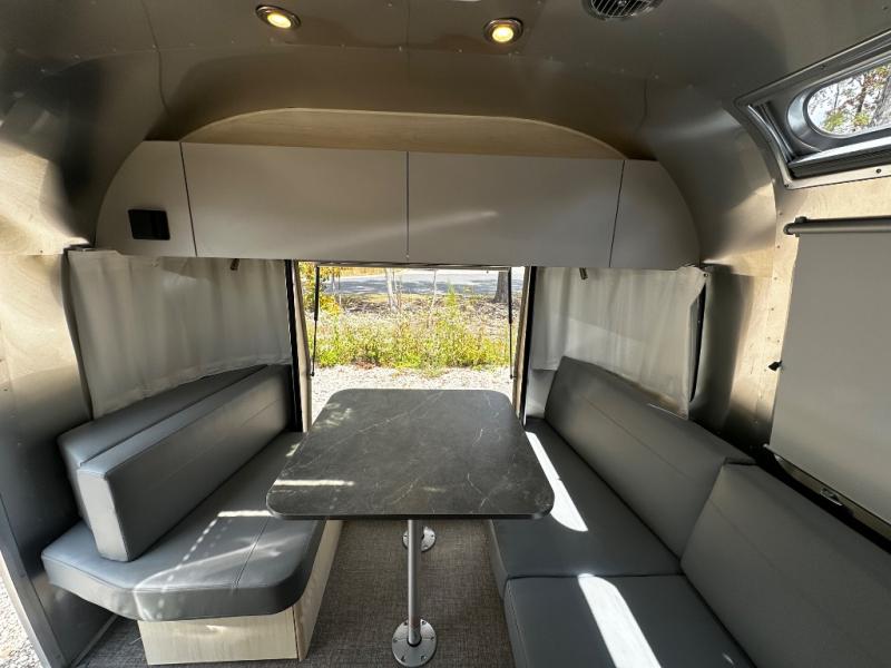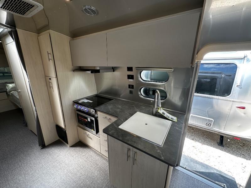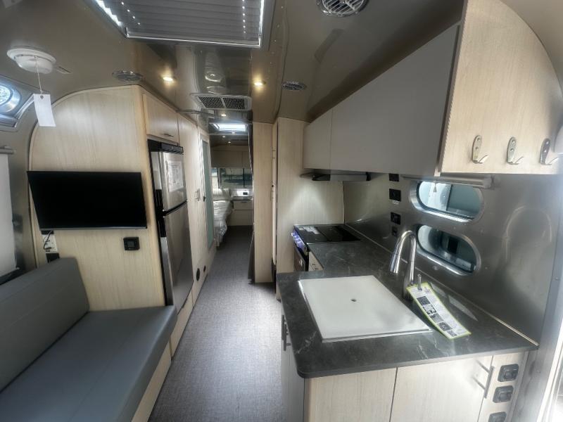 With each Flying Cloud travel trailer by Airstream, there are two axles, and each is built for ease of towing, plus there is a rear-view camera to make reversing and parking easier, and stainless steel front stone guards to protect the lower segments from road debris. The iconic Airstream design is created outside and inside by the semi-monocoque aluminum superstructure, the temperature reducing one-piece white aluminum roof, the panoramic front windows, and the stylish aluminum wheels. The interior will have you feeling right at home with handcrafted cabinetry, plenty of storage and counter space, sleek roller blinds and blackout curtains, plus residential style faucets!
