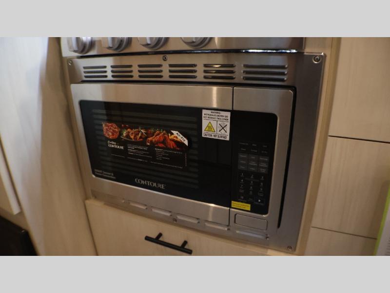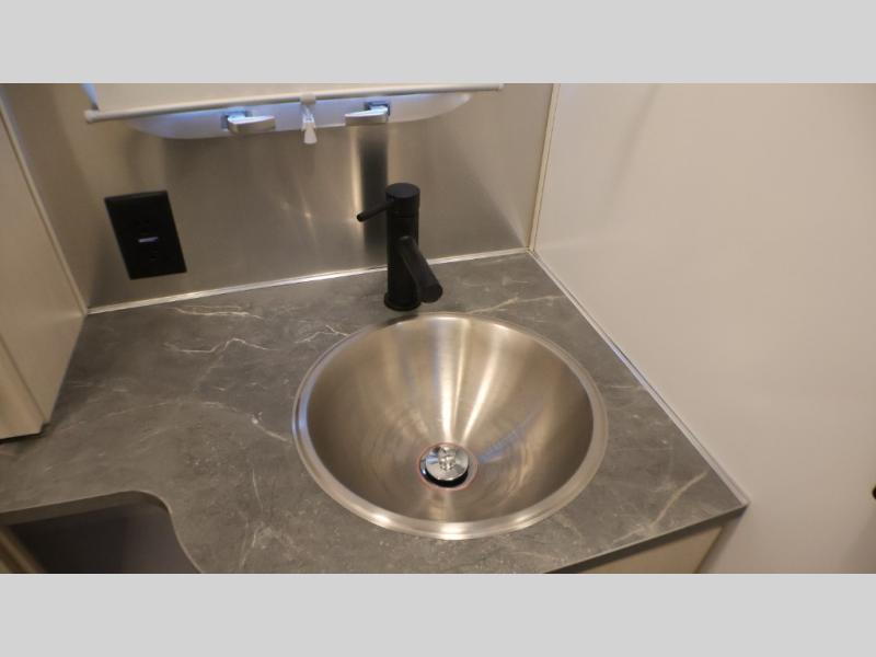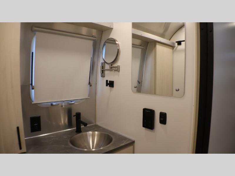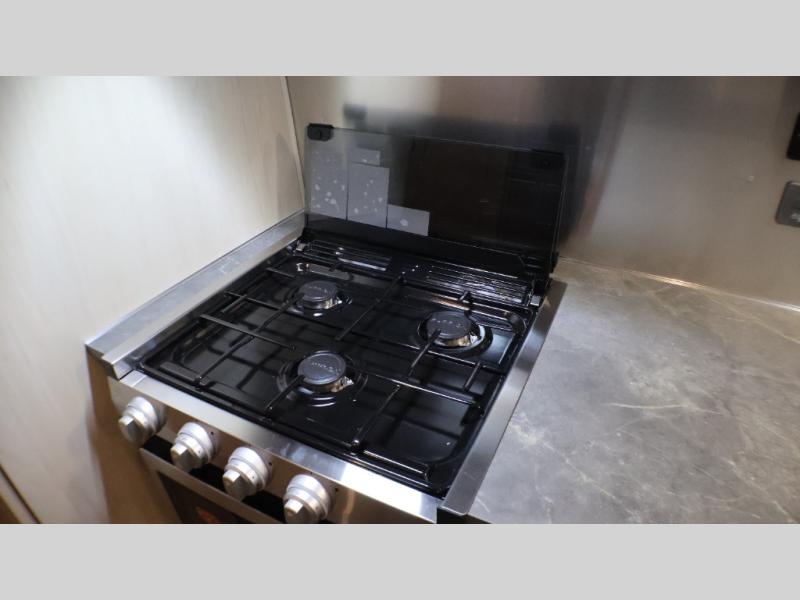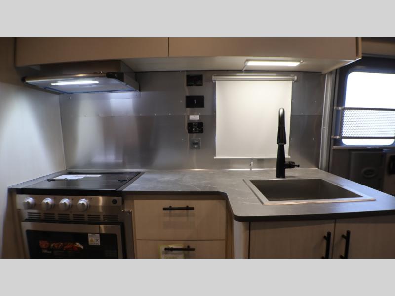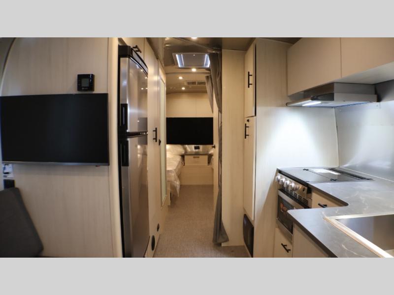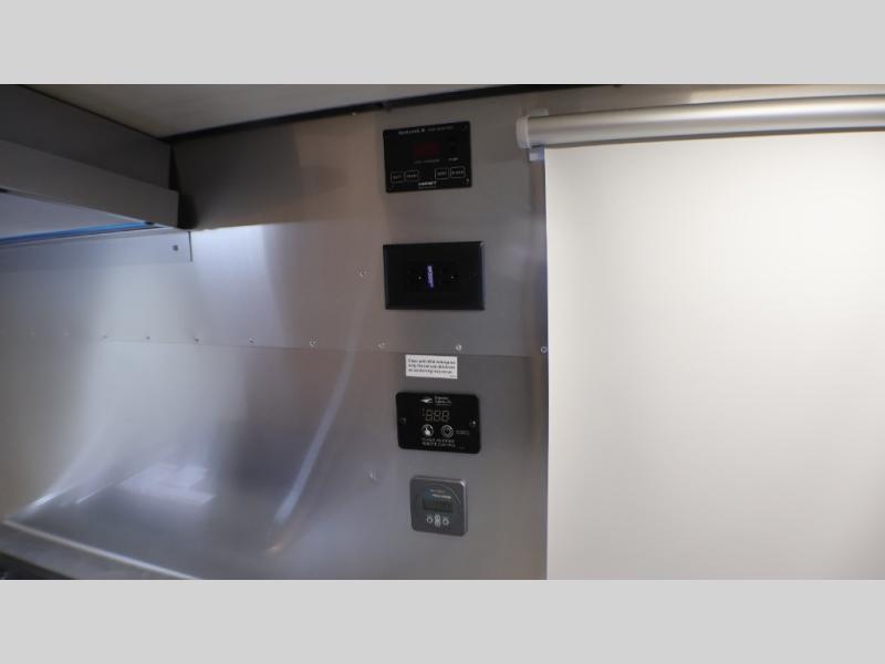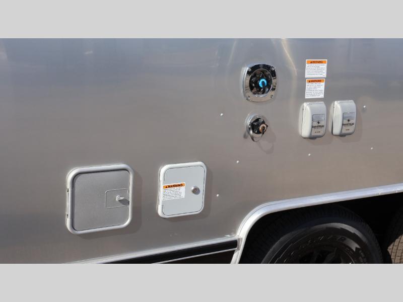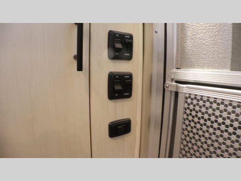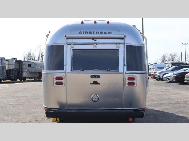 With each Flying Cloud travel trailer by Airstream, there are two axles, and each is built for ease of towing, plus there is a rear-view camera to make reversing and parking easier, and stainless-steel front stone guards to protect the lower segments from road debris. The iconic Airstream design is created outside and inside by the semi-monocoque aluminum superstructure, the temperature reducing one-piece white aluminum roof, the panoramic front windows, and the stylish aluminum wheels. The interior will have you feeling right at home with handcrafted cabinetry, plenty of storage and counter space, sleek roller blinds and blackout curtains, plus residential style faucets!