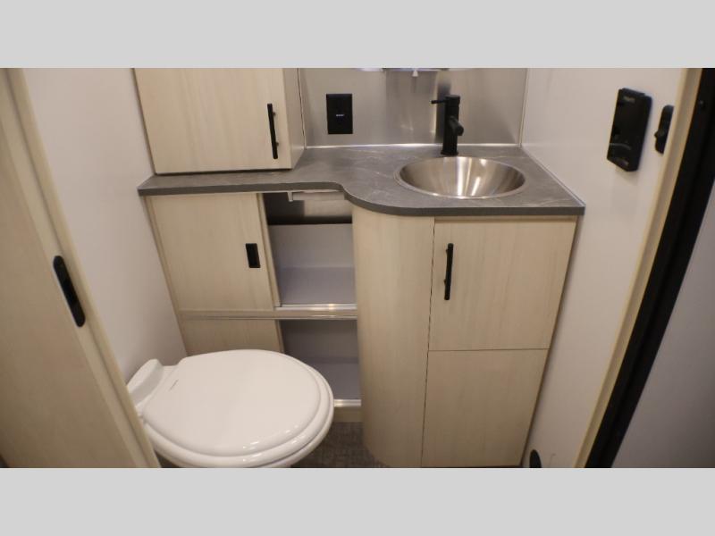 Whether you stay at a campground or an RV park, you will love relaxing inside on the comfortable furniture and the memory foam twin mattresses while gazing out all the windows and enjoying the natural lighting. The toilet and vanity are separate from the shower allowing two people to use the facilities at once. And the cook will have a spacious galley to make meals using the LP gas stove with a stainless-steel sink, and the refrigerator can hold the leftovers that is opposite the stove. And you might even like to add a few options such as a front bunk option over the twin beds, an optional rear hatch and/or a window awning package. The Midnight Flamingo optional upgrade is also available on this model for even more striking style and functional upgrades!