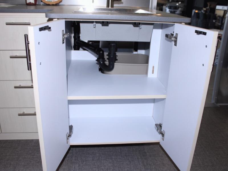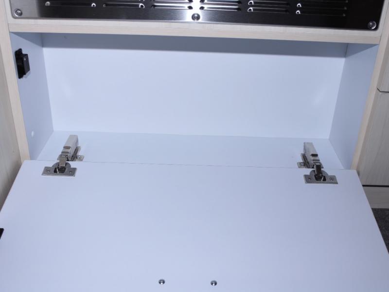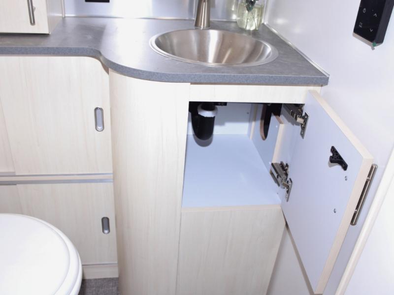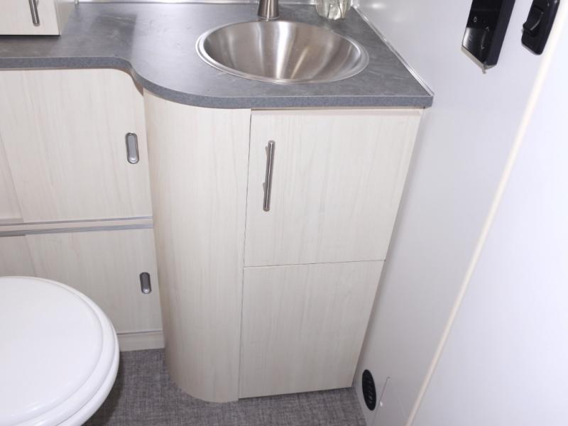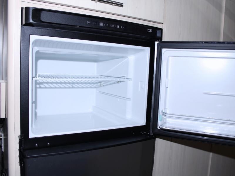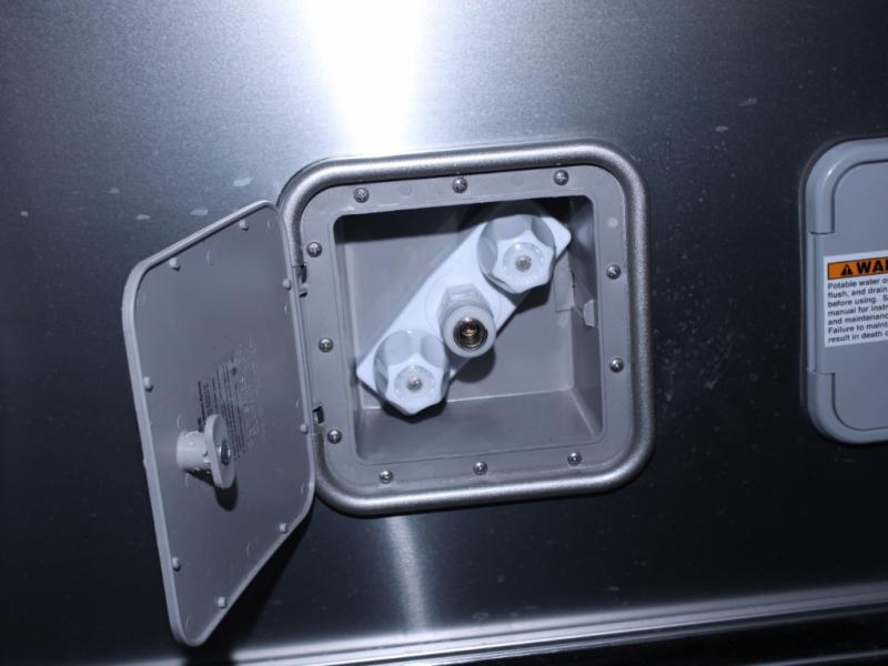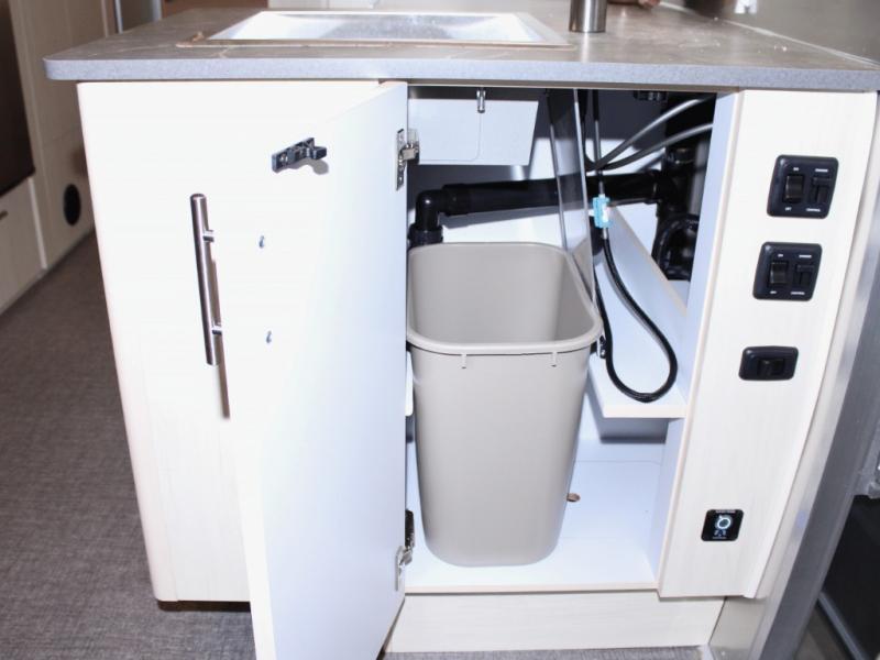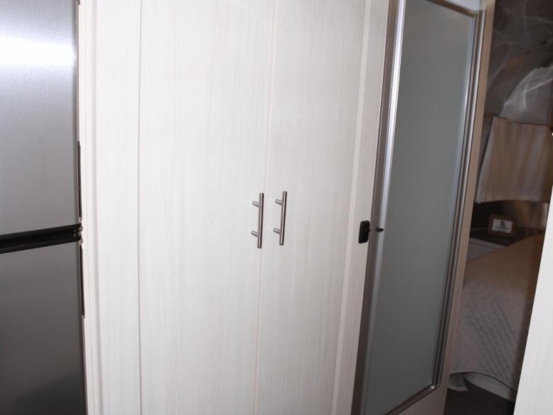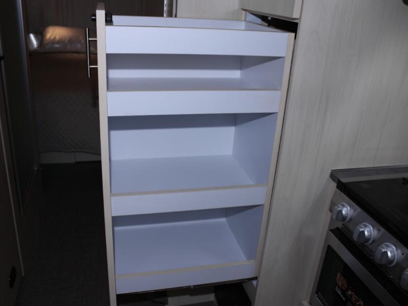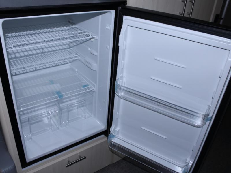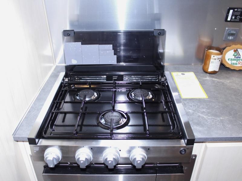 The split bathroom design is perfect for couples or families on the go—the toilet and vanity are separate from the independent shower, allowing two people to freshen up at once. In the spacious galley, the cook will love the LP gas stove, stainless steel sink, and the conveniently located refrigerator opposite the stove, making meal prep both easy and efficient.