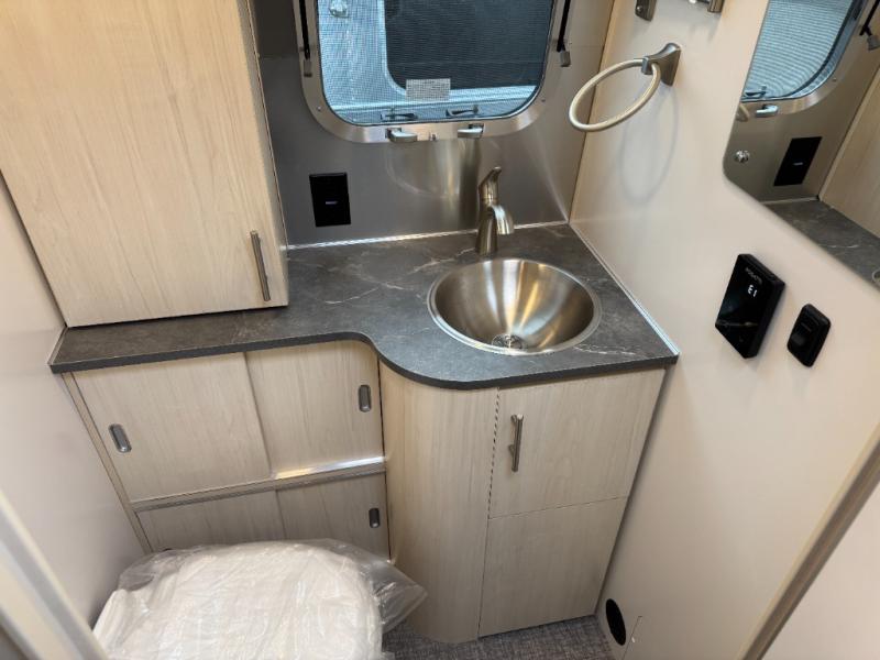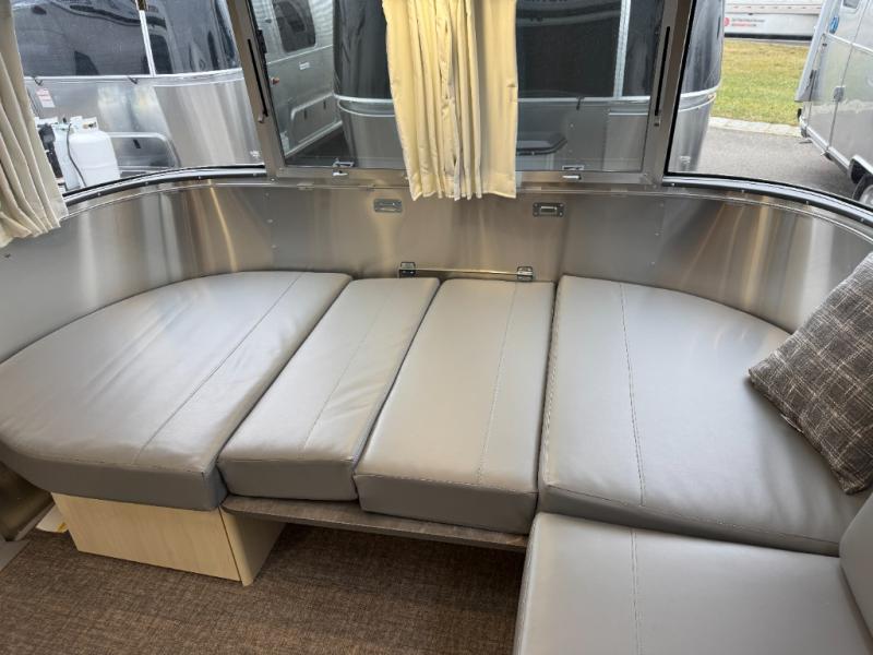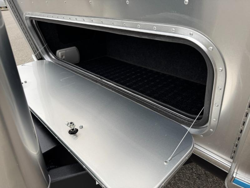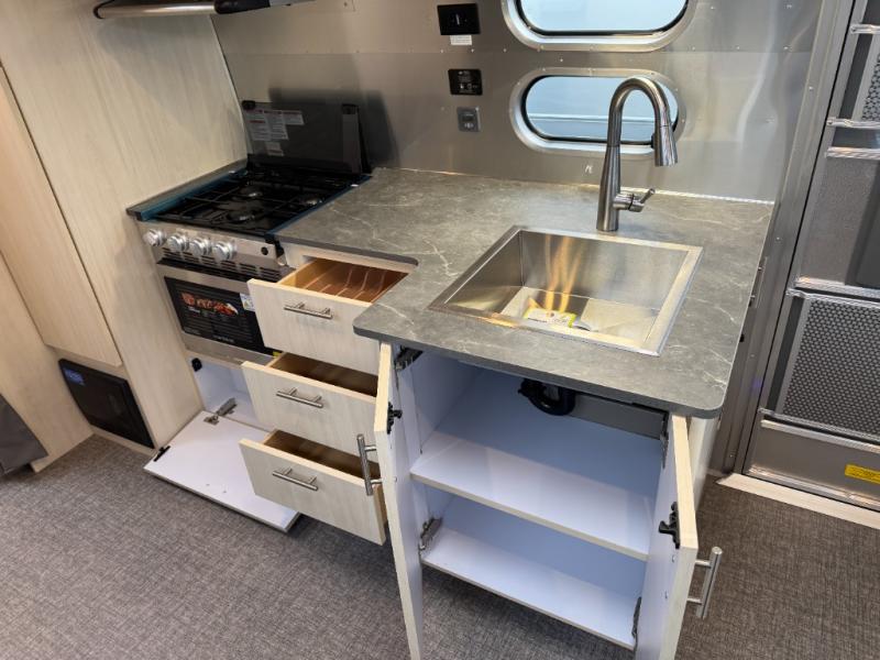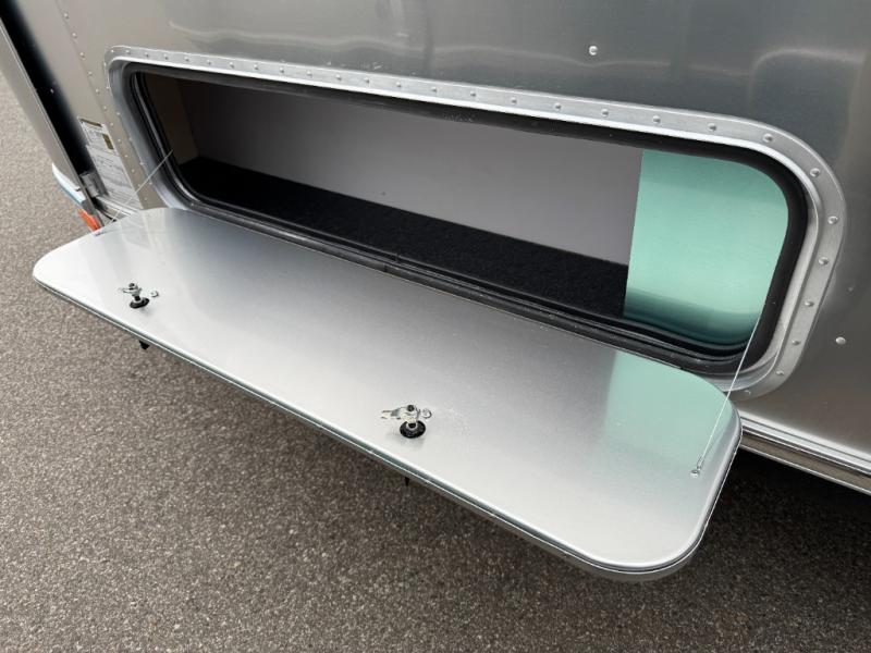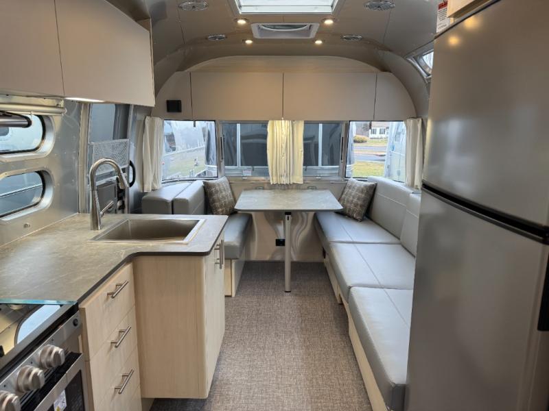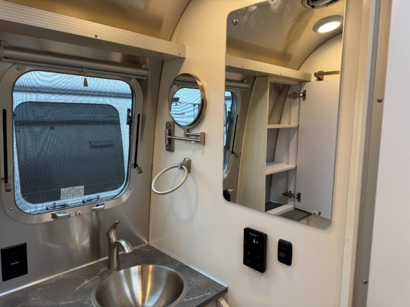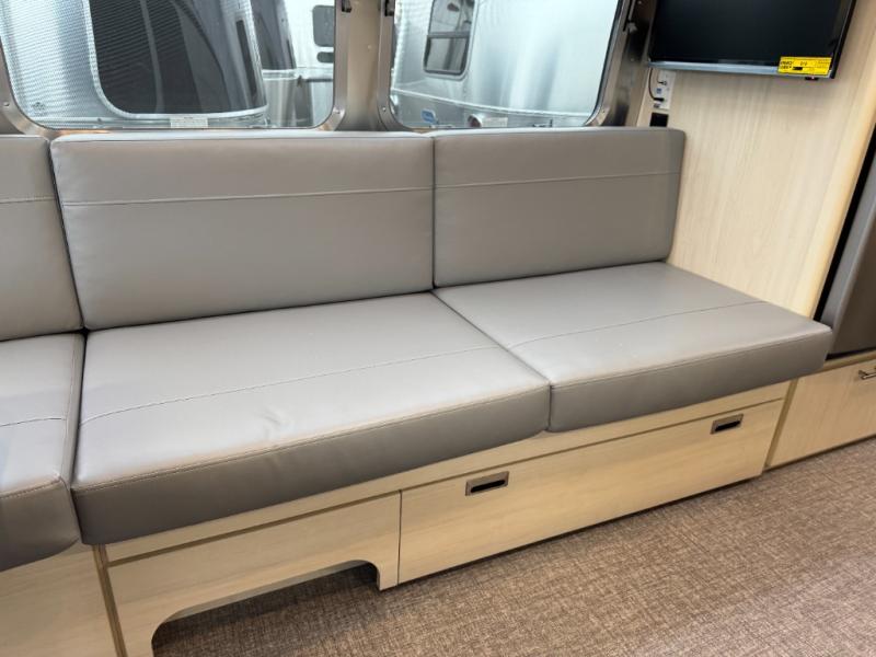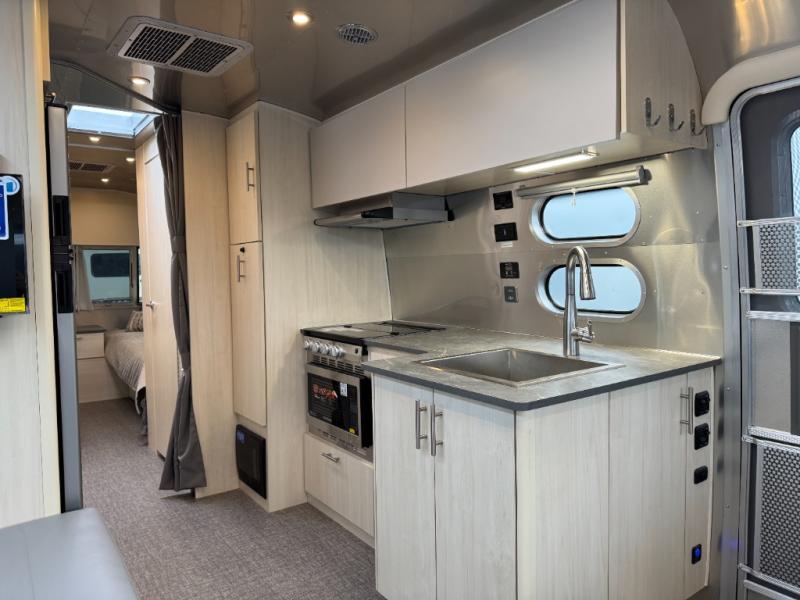 With each Flying Cloud travel trailer by Airstream, there are two axles, and each is built for ease of towing, plus there is a rear-view camera to make reversing and parking easier, and stainless-steel front stone guards to protect the lower segments from road debris. The iconic Airstream design is created outside and inside by the semi-monocoque aluminum superstructure, the temperature reducing one-piece white aluminum roof, the panoramic front windows, and the stylish aluminum wheels. The interior will have you feeling right at home with handcrafted cabinetry, plenty of storage and counter space, sleek roller blinds and blackout curtains, plus residential style faucets!