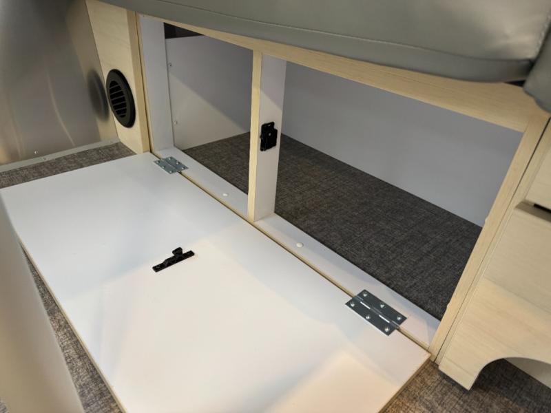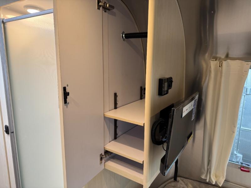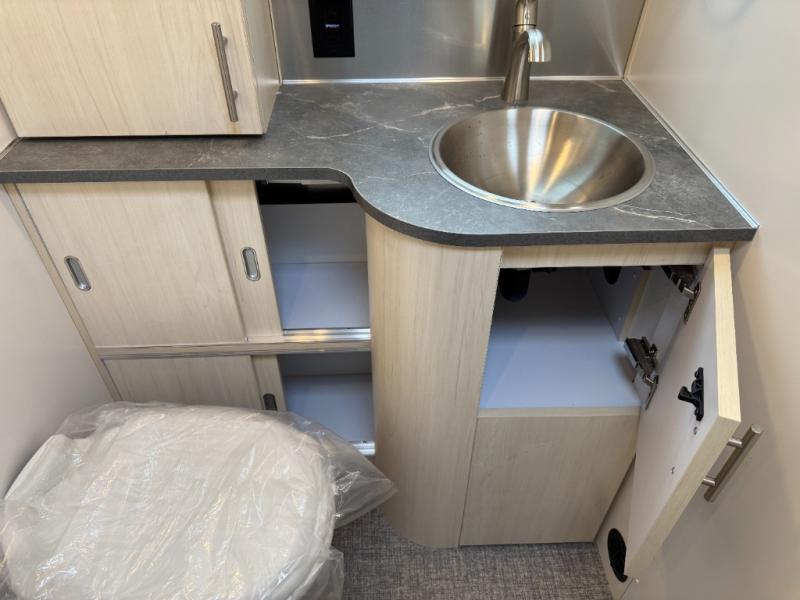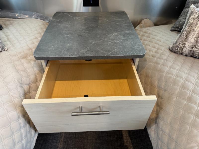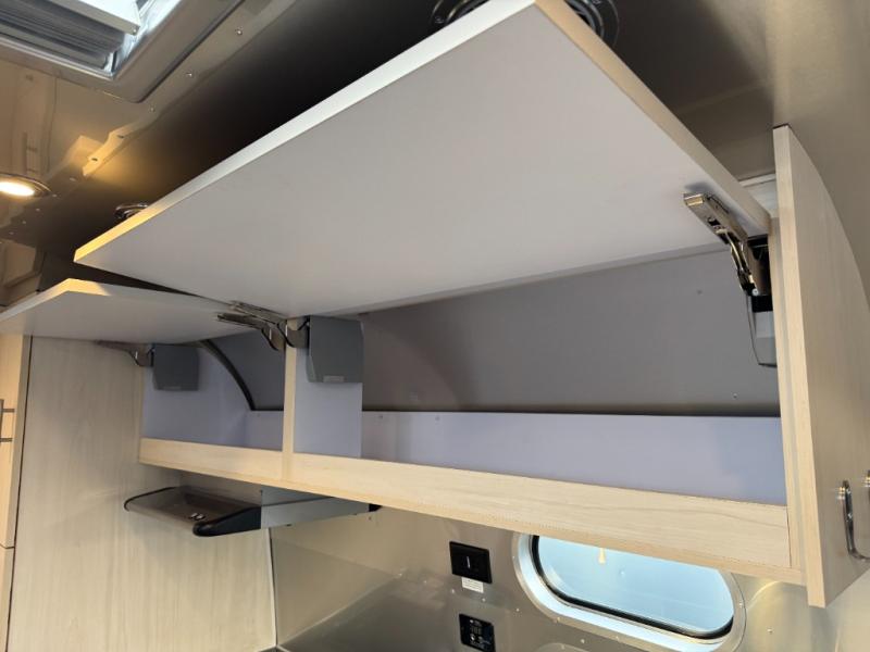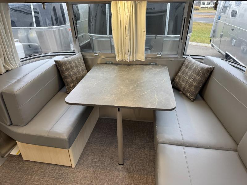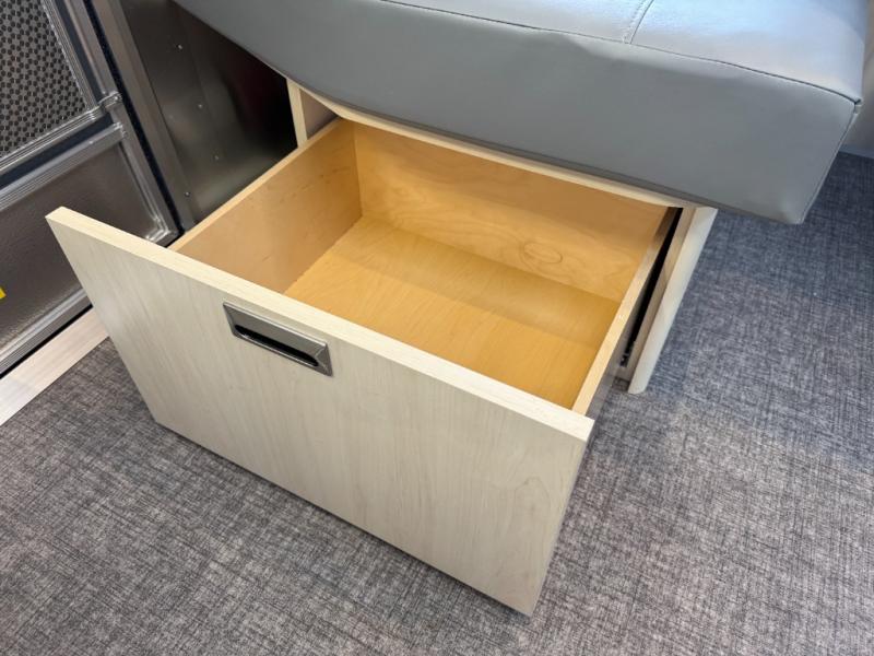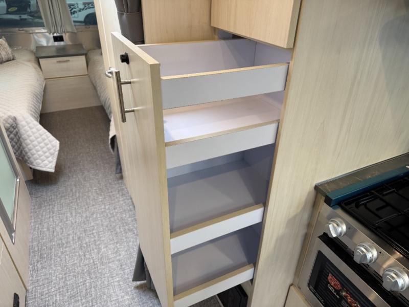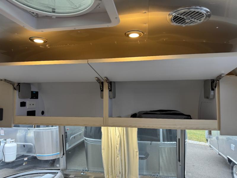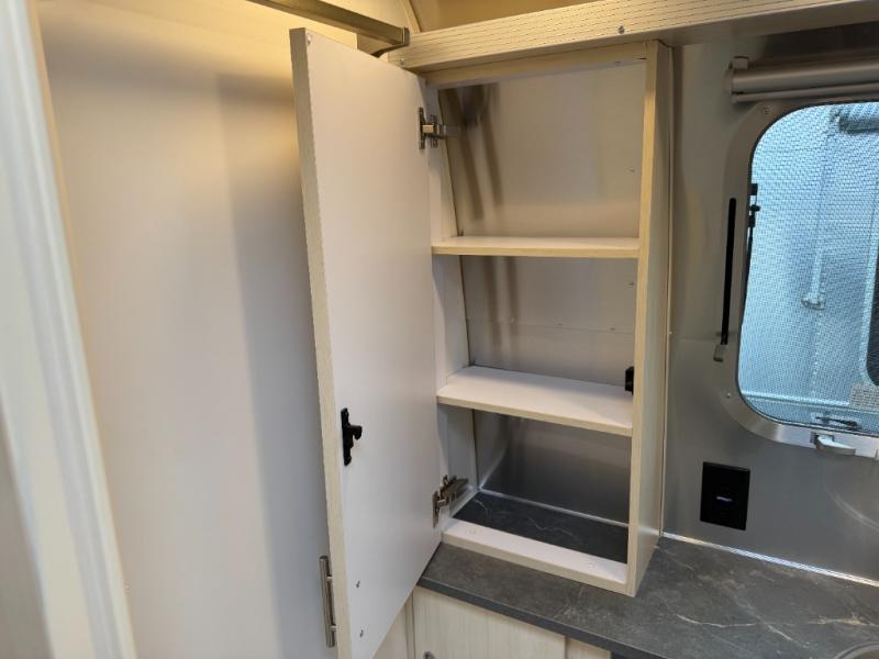 With each Flying Cloud travel trailer by Airstream, there are two axles, and each is built for ease of towing, plus there is a rear-view camera to make reversing and parking easier, and stainless-steel front stone guards to protect the lower segments from road debris. The iconic Airstream design is created outside and inside by the semi-monocoque aluminum superstructure, the temperature reducing one-piece white aluminum roof, the panoramic front windows, and the stylish aluminum wheels. The interior will have you feeling right at home with handcrafted cabinetry, plenty of storage and counter space, sleek roller blinds and blackout curtains, plus residential style faucets!