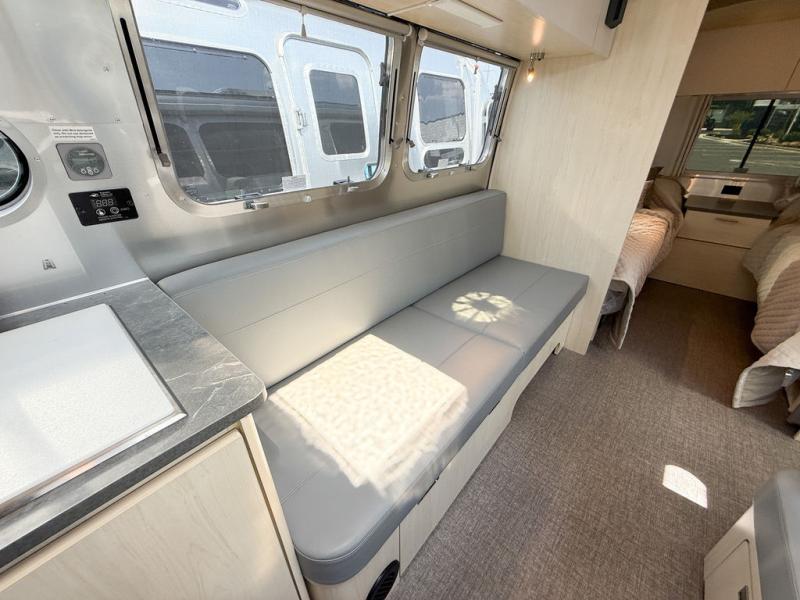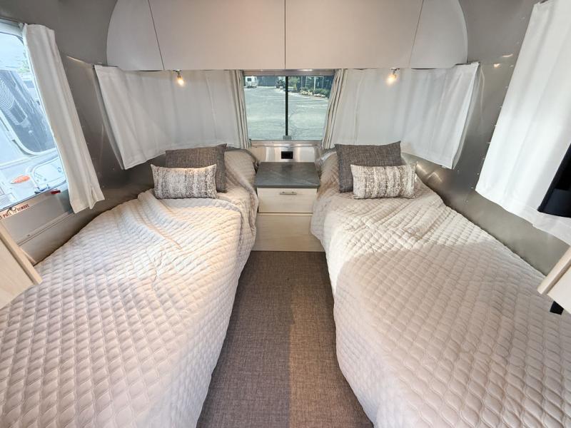 Looking for maximum interior space, a place for eight to sleep at night, plus plenty of storage for your big group? This trailer offers all of that plus so much more! The front private bedroom offers a queen bed with underbed storage. The main living and kitchen area offers a U-shaped dinette for total comfort when dining, playing games and visiting with everyone. And the sofa offers more relaxation seating, while both furnishings provide extra sleeping space. The rear corner bunks offer a twin above a queen mattress that are designed to fit the curves of the Airstream perfectly. The full bathroom will keep you refreshed, and the kitchen is loaded with everything you need to feed the group. This model is also available with optional twin beds which replace the front queen bed!