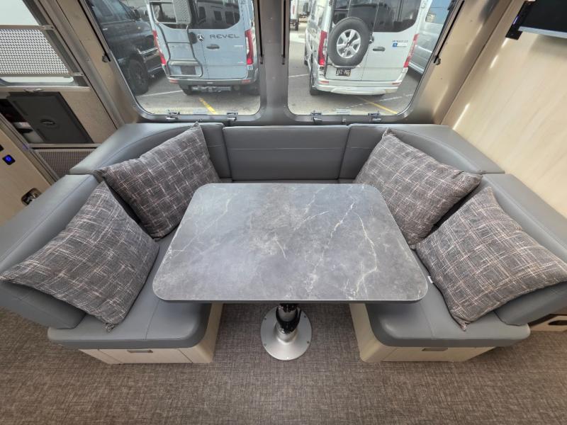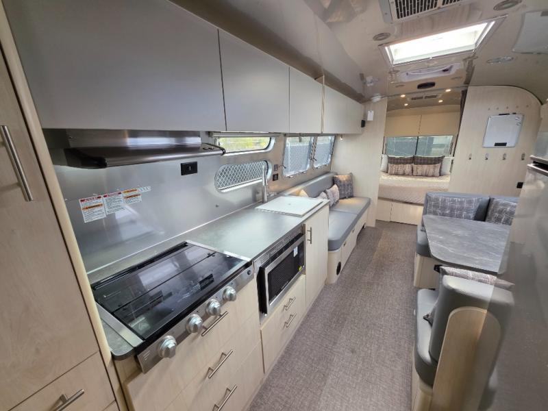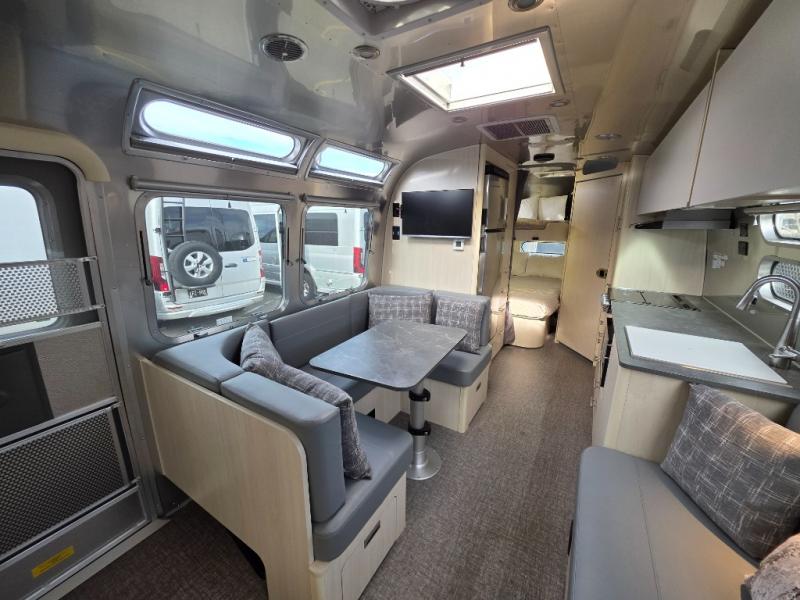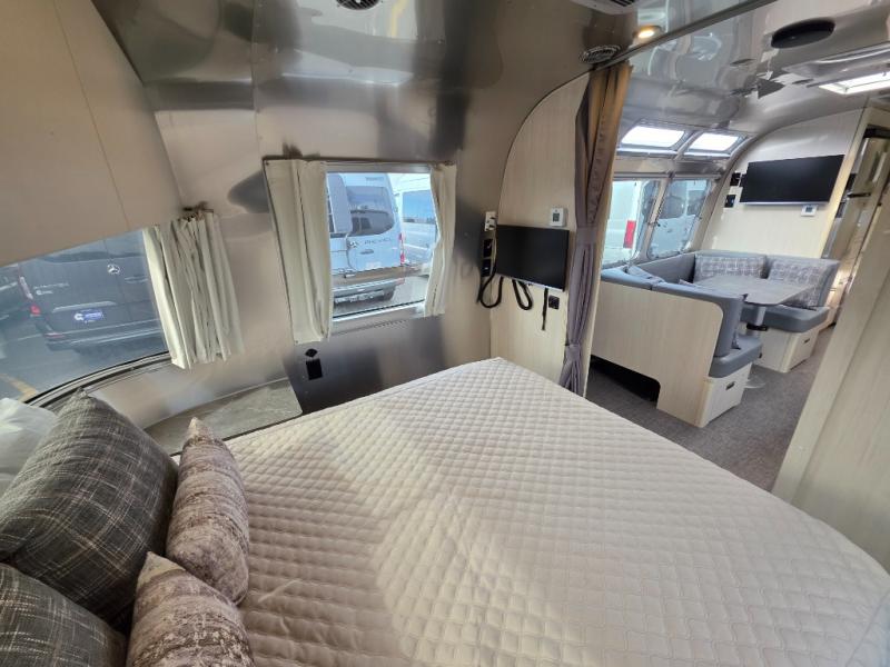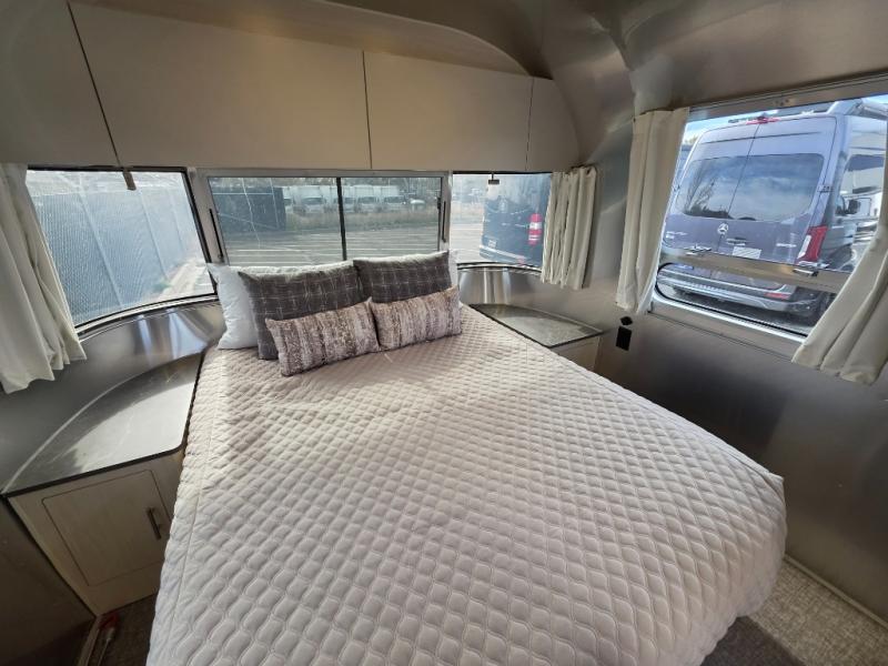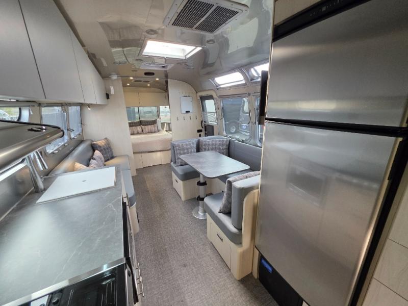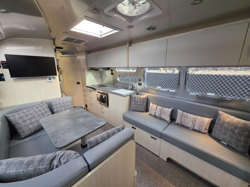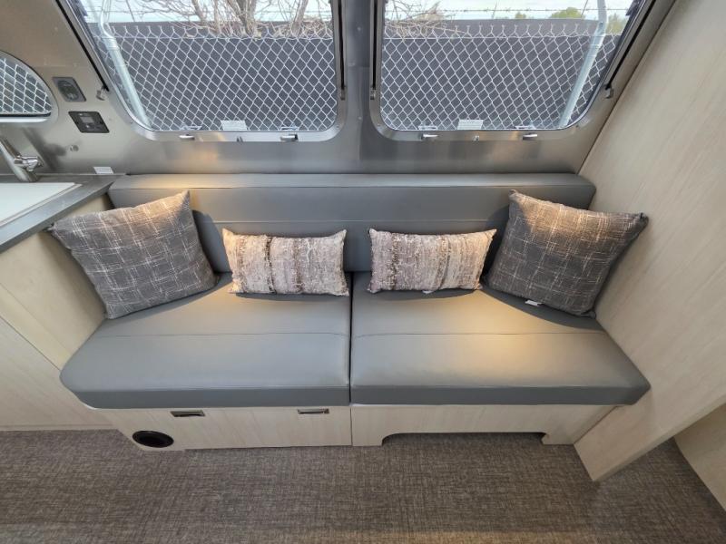 Looking for maximum interior space, a place for eight to sleep at night, plus plenty of storage for your big group? This trailer offers all of that plus so much more! The front private bedroom offers a queen bed with underbed storage. The main living and kitchen area offers a U-shaped dinette for total comfort when dining, playing games and visiting with everyone. And the sofa offers more relaxation seating, while both furnishings provide extra sleeping space. The rear corner bunks offer a twin above a queen mattress that are designed to fit the curves of the Airstream perfectly. The full bathroom will keep you refreshed, and the kitchen is loaded with everything you need to feed the group. This model is also available with optional twin beds which replace the front queen bed!