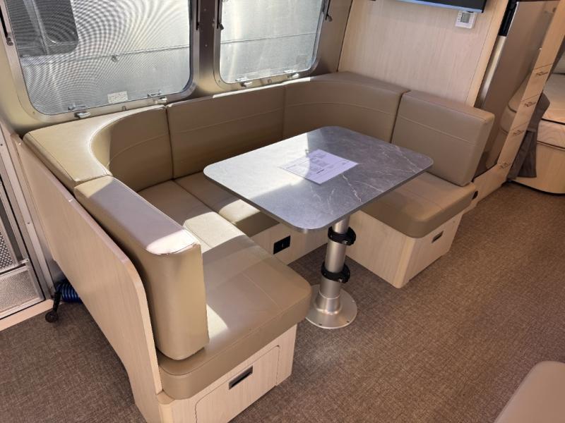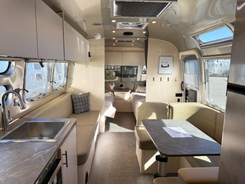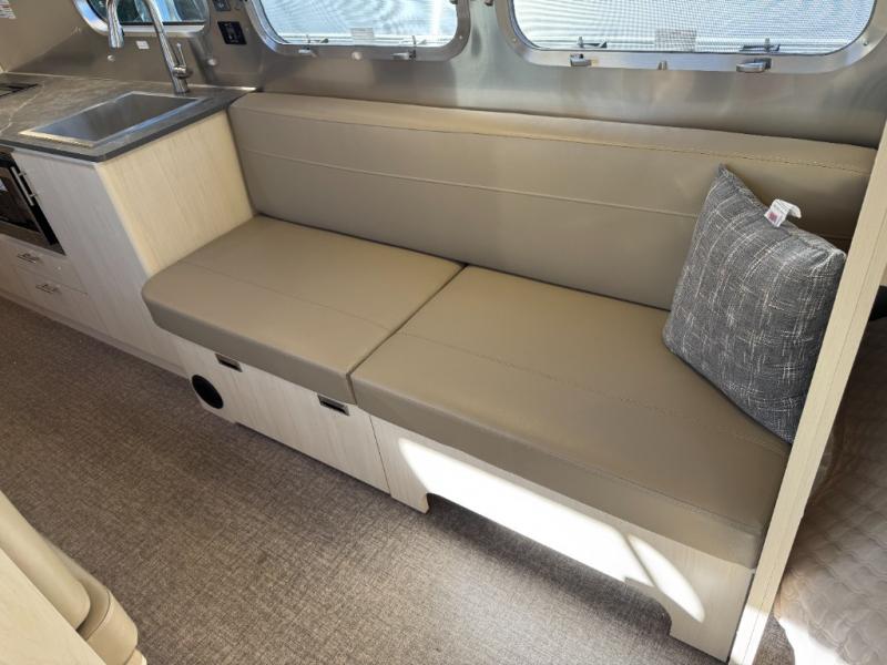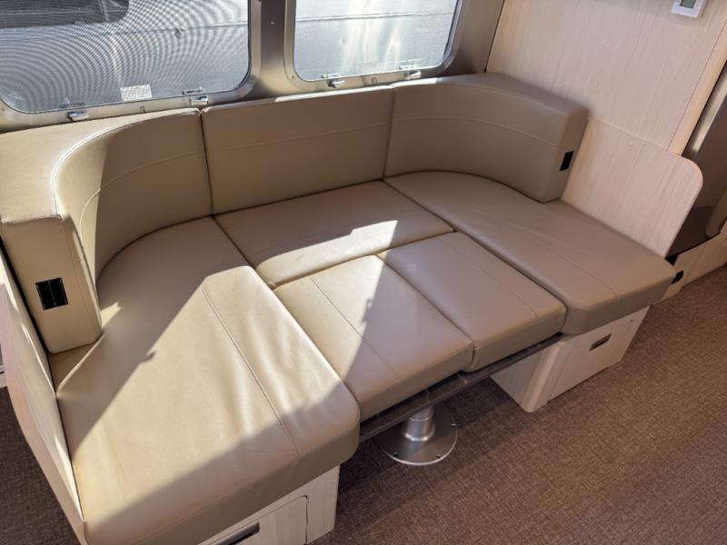 Looking for maximum interior space, a place for eight to sleep at night, plus plenty of storage for your big group? This trailer offers all of that plus so much more! The front private bedroom offers twin beds so you can easily get into bed each night. The main living and kitchen area offers a U-shaped dinette for total comfort when dining, playing games and visiting with everyone. And the sofa offers more relaxation seating, while both furnishings provide extra sleeping space. The rear corner bunks offer a twin above a queen mattress that are designed to fit the curves of the Airstream perfectly. The full bathroom will keep you refreshed, and the kitchen is loaded with everything you need to feed the group.