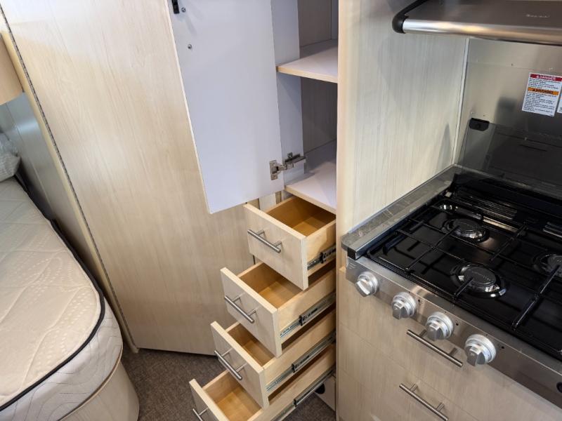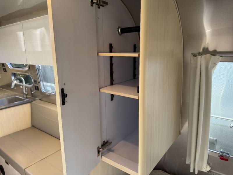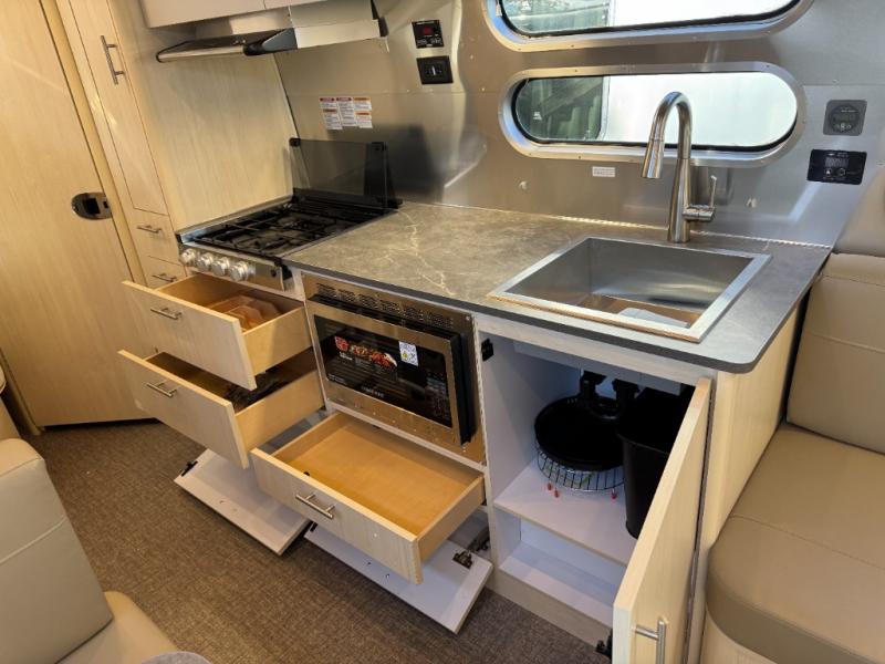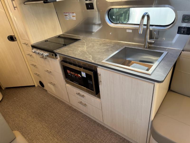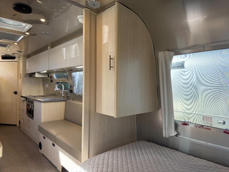The family-friendly and popular Flying Cloud travel trailers by Airstream are built for ease of towing with a rear-view camera to make reversing and parking easier and stainless steel front stone guards to protect the lower segments from road debris. The iconic Airstream design is created outside and inside by the semi-monocoque aluminum superstructure, the temperature reducing one-piece white aluminum roof, the panoramic front windows, and the stylish aluminum wheels. The interior will have you feeling right at home with handcrafted cabinetry, plenty of storage and counter space, sleek roller blinds and blackout curtains, plus residential style faucets!