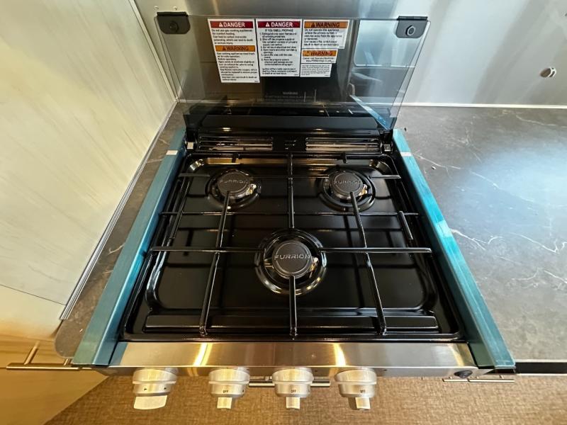 The fully equipped galley kitchen includes a three-burner cooktop, microwave, refrigerator, and stainless-steel sink, making it easy to prepare meals on the go. The luxurious wet bath features a full shower, vanity, and toilet, combining practicality with modern style. Premium materials, clever storage solutions, and thoughtful lighting throughout the trailer enhance the living experience.