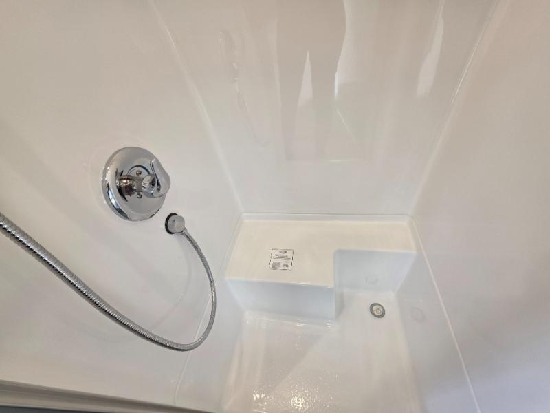 Enjoy a home away from home with this travel trailer! The L-shaped lounge provides a comfortable place to enjoy a meal, play a card game, and even transform into an extra sleeping space for a guest or two smaller guests. The ultra-modern kitchen has a stainless steel three burner cooktop, a Baraldi vent, a 6.8 cu. ft. 12V refrigerator, and a deep stainless steel Moen sink to make clean up easier. The bright white DuPont Corian countertops help light bounce off of the aluminum walls making for a brighter atmosphere and they also have built-in multifunctional storage bins that are flush with the surface behind the sink. Up front there is a queen bed with a memory foam mattress for you to enjoy a good night's rest or you can chose the optional twin beds, depending on your needs. The separated bathroom allows one person to freshen up in the shower with a seat while another uses the private toilet and vanity!
