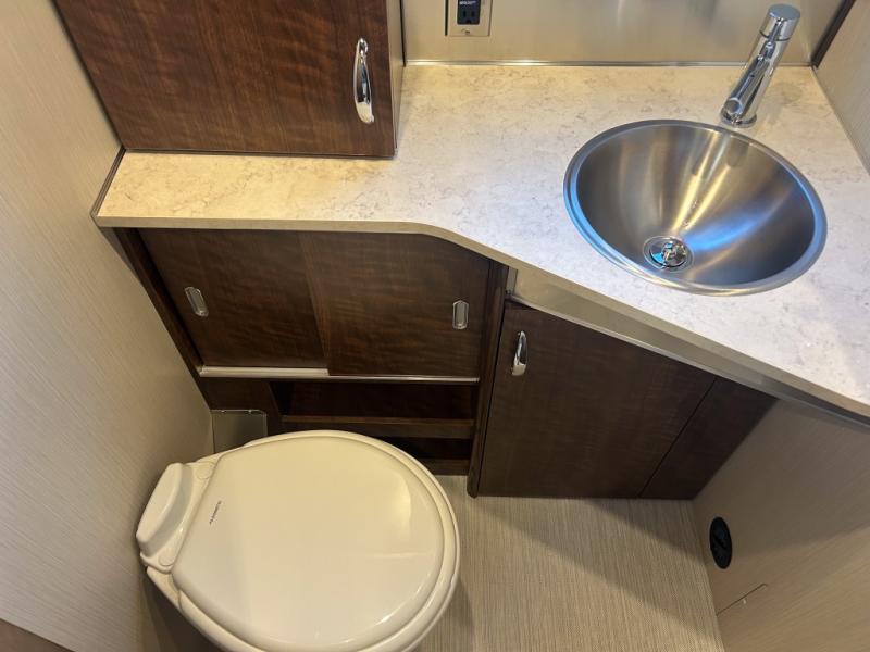 Enjoy a home away from home with this travel trailer! The L-shaped lounge provides a comfortable place to enjoy a meal, play a card game, and even transform into an extra sleeping space for a guest or two smaller guests. The ultra-modern kitchen has a stainless steel three burner cooktop, a Baraldi vent, a 6.8 cu. ft. refrigerator, and a deep stainless steel Moen sink to make clean up easier. The bright white DuPont Corian countertops help light bounce off of the aluminum walls making for a brighter atmosphere and they also have built-in multifunctional storage bins that are flush with the surface behind the sink. Up front there are twin beds with AdaptaFlex memory foam mattresses for you to enjoy a good night's rest or watch a movie with the LG LED TV. The separated bathroom allows one person to freshen up in the shower with a seat while another uses the private toilet and vanity!