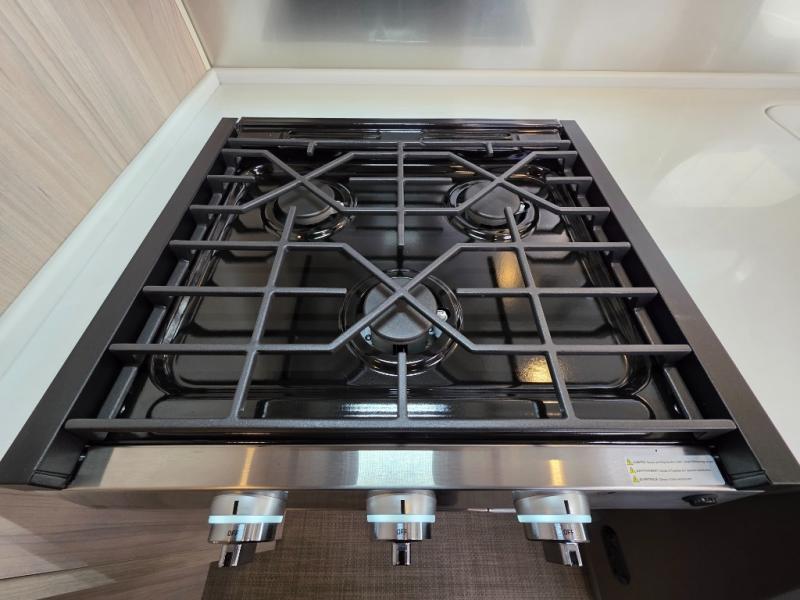 Enjoy a home away from home with this travel trailer! The L-shaped lounge provides a comfortable place to enjoy a meal, play a card game, and even transform into an extra sleeping space for a guest or two smaller guests. The ultra-modern kitchen has a stainless steel three burner cooktop, a Baraldi vent, a 6.8 cu. ft. refrigerator, and a deep stainless steel Moen sink to make clean up easier. The bright white DuPont Corian countertops help light bounce off of the aluminum walls making for a brighter atmosphere and they also have built-in multifunctional storage bins that are flush with the surface behind the sink. Up front there are twin beds with AdaptaFlex memory foam mattresses for you to enjoy a good night's rest or watch a movie with the LG LED TV. The separated bathroom allows one person to freshen up in the shower with a seat while another uses the private toilet and vanity!