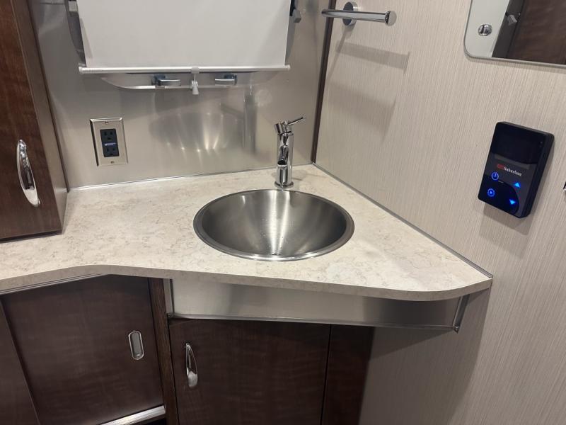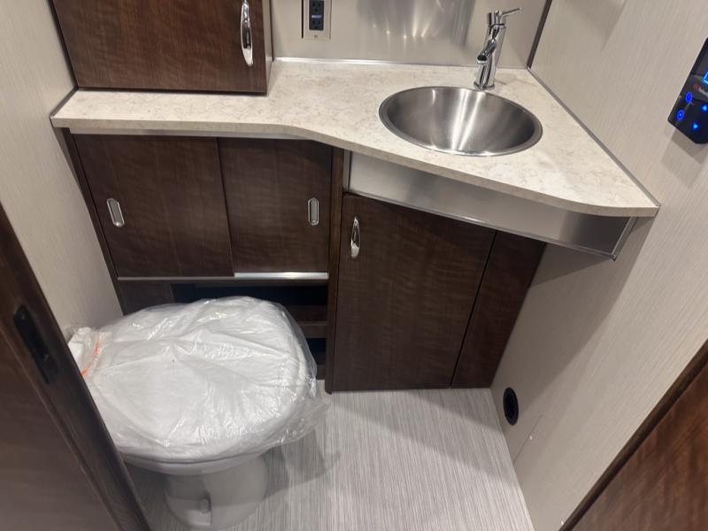 Enjoy a home away from home with this travel trailer! The L-shaped lounge provides a comfortable place to enjoy a meal, play a card game, and even transform into an extra sleeping space for a guest or two smaller guests. The ultra-modern kitchen has a stainless steel three burner cooktop, a Baraldi vent, a 6.8 cu. ft. refrigerator, and a deep stainless steel Moen sink to make clean up easier. The bright white DuPont Corian countertops help light bounce off of the aluminum walls making for a brighter atmosphere and they also have built-in multifunctional storage bins that are flush with the surface behind the sink. Up front there are twin beds with AdaptaFlex memory foam mattresses for you to enjoy a good night's rest or watch a movie with the LG LED TV. The separated bathroom allows one person to freshen up in the shower with a seat while another uses the private toilet and vanity!