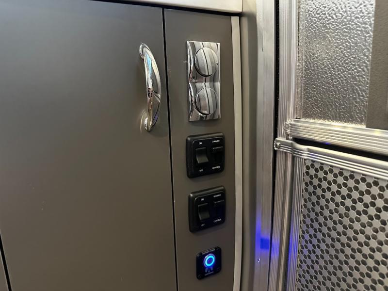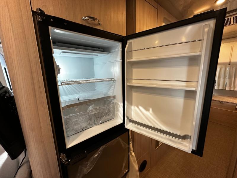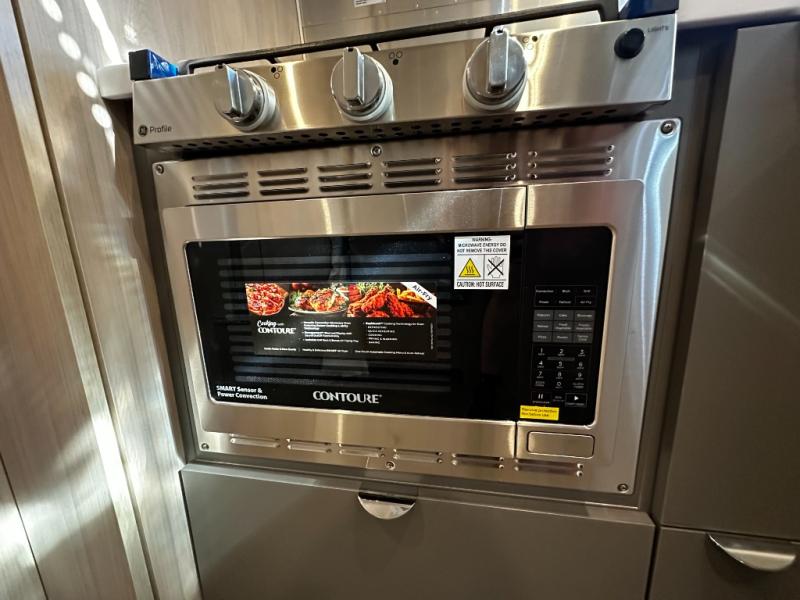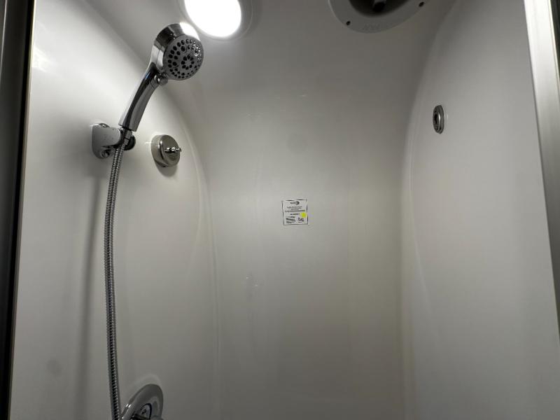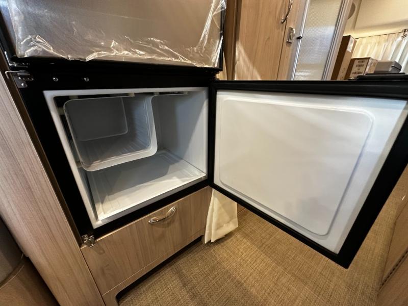 The fully equipped galley kitchen includes a two-burner cooktop, microwave, refrigerator, and stainless-steel sink, allowing you to prepare meals wherever your travels take you. The wet bath is compact yet fully functional, providing privacy and convenience without sacrificing interior space. Premium materials, high-quality finishes, and well-placed lighting make the interior inviting and practical.