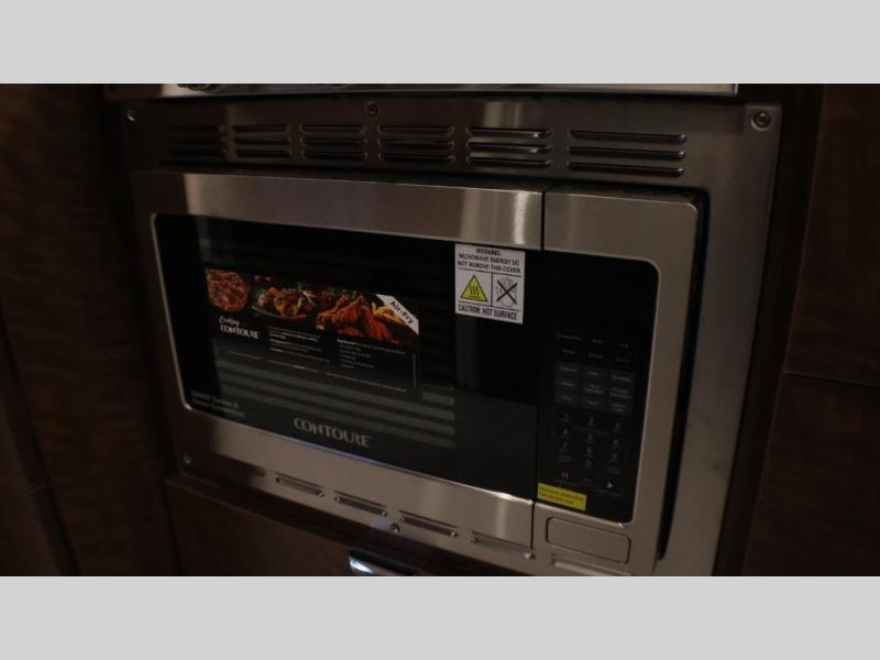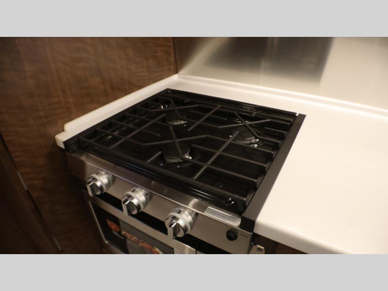 You will find comfort and luxury all throughout this travel trailer! From the front twin beds with AdaptaFlex memory foam mattresses and nightstands on either side, to the rear L-shaped lounge that you can enjoy your meals at and convert into an extra sleeping space. The separated bathroom has a private toilet and vanity together across from an independent shower with a seat to freshen up each morning. You can prepare your best meals in the ultra-modern kitchen with the stainless steel three burner cooktop, the oven, the deep stainless steel Moen sink, and the DuPont Corian countertops will be easy to clean, plus they have multifunctional storage bins that are flush to the surface behind the sink.