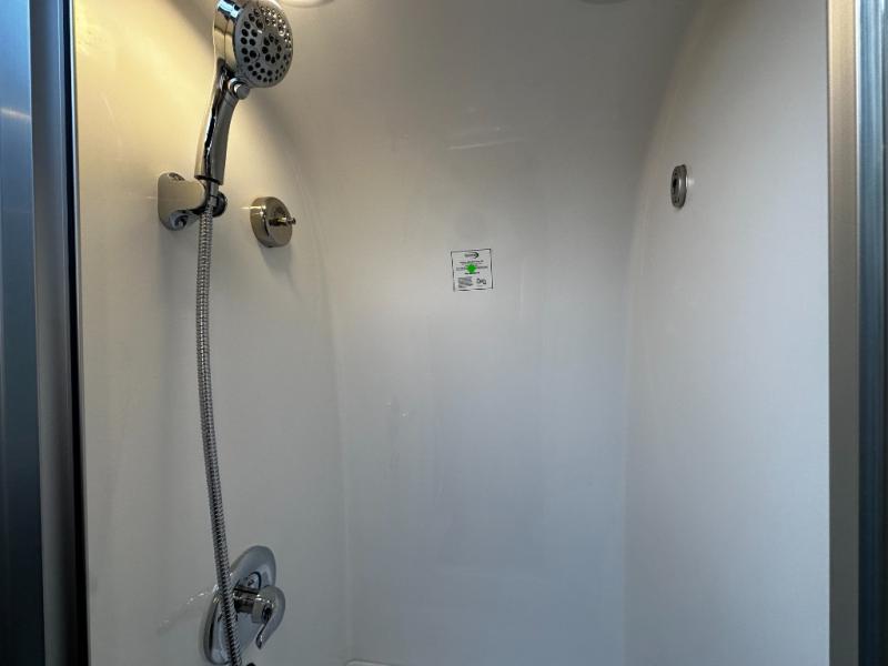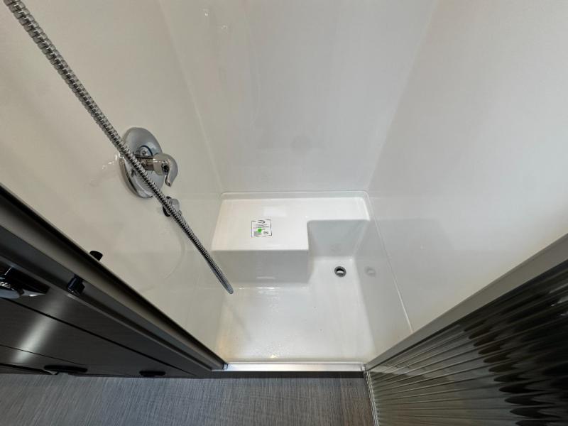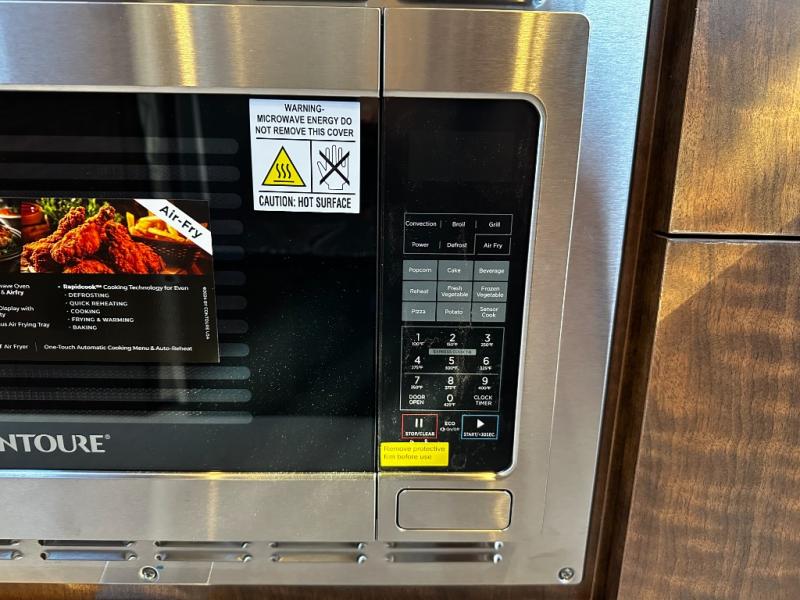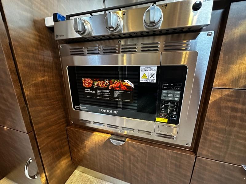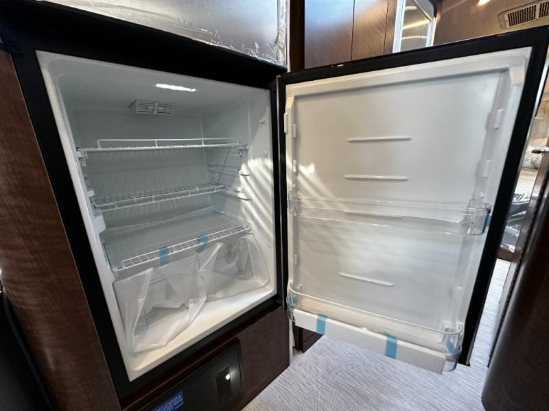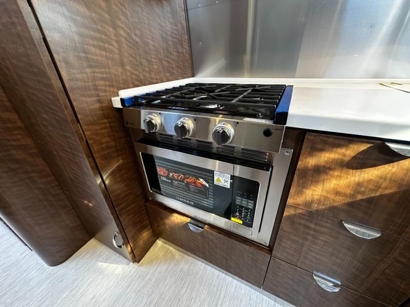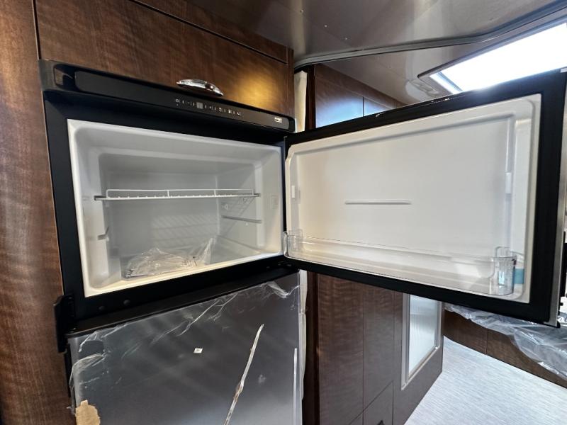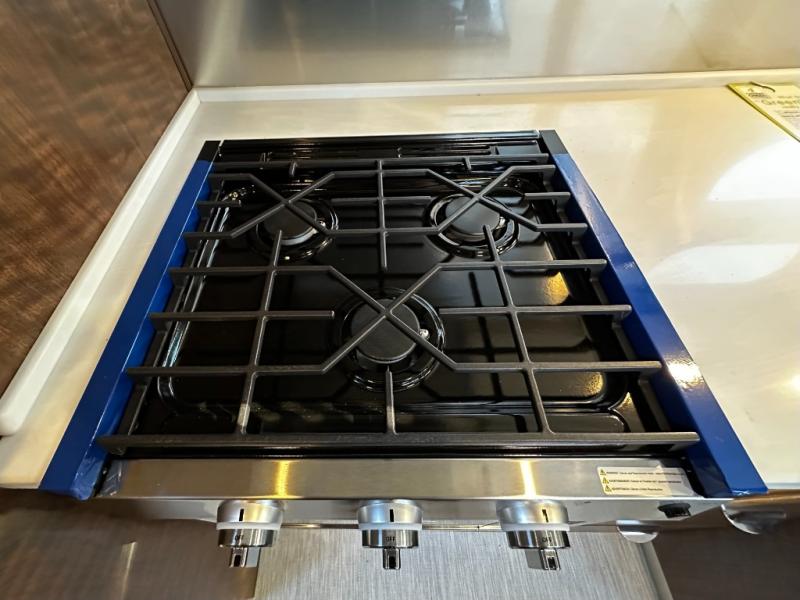 The fully equipped galley kitchen features a three-burner cooktop, microwave, refrigerator, and stainless-steel sink, making cooking on the road convenient and enjoyable. The luxurious wet bath offers a full shower, vanity, and toilet, combining comfort with efficiency. Premium finishes, thoughtful lighting, and durable materials throughout the interior elevate the travel experience.