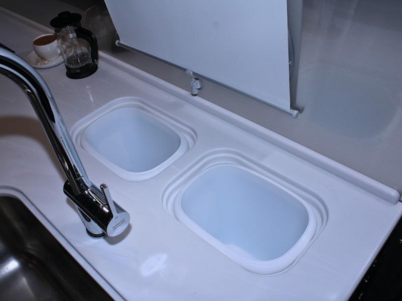 Cook like you never left home in a galley designed for both beauty and function. It includes a three-burner stainless steel cooktop, oven, deep Moen sink, and Corian countertops with flush multifunctional storage bins. Clean lines and premium materials make meal prep effortless and elegant.