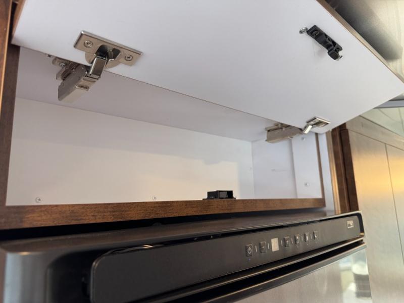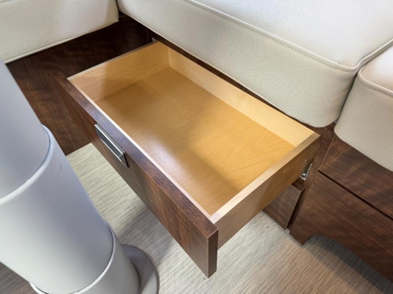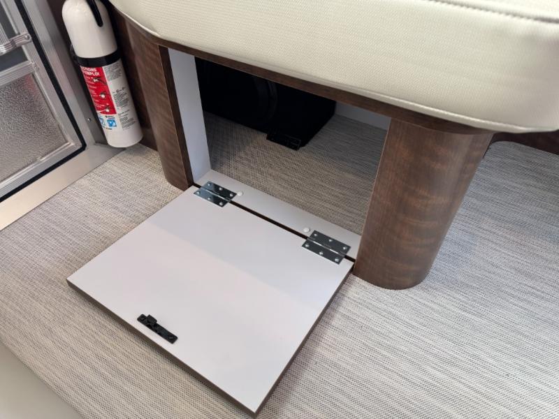 You will find comfort and luxury all throughout this travel trailer! There is a queen bed with a memory foam mattress, nightstands on either side, and a 24" 12V DC Smart TV with Bluetooth. You can also choose the optional twin beds, depending on your needs. The separated bathroom has a private toilet and vanity together across from an independent shower with a seat to freshen up each morning. You can prepare your best meals in the ultra-modern kitchen with the stainless steel three burner cooktop, the oven, the deep stainless steel Moen sink, and the Dupont Corian countertops will be easy to clean, plus they have multifunctional storage bins that are flush to the surface behind the sink.