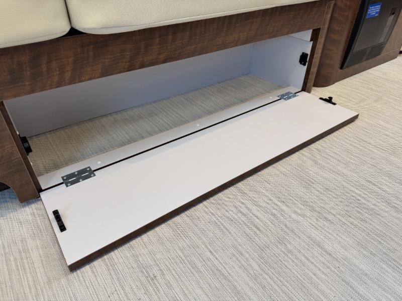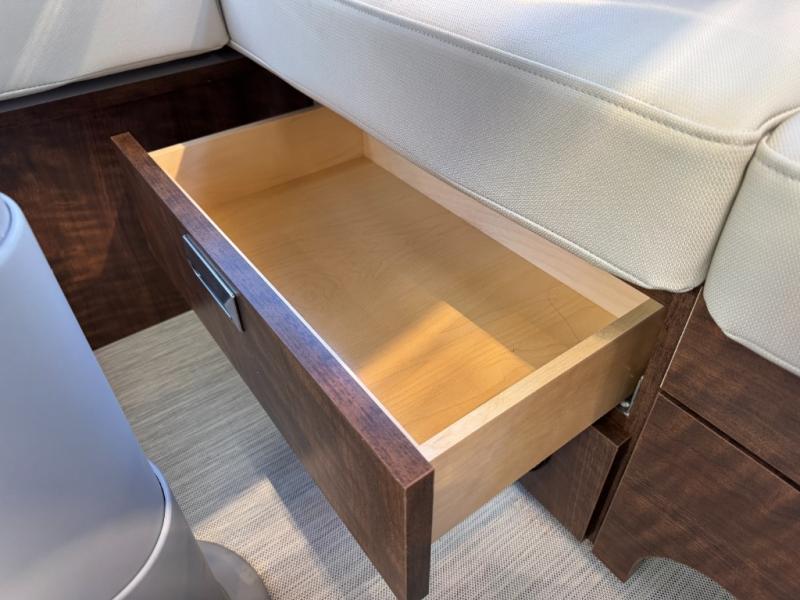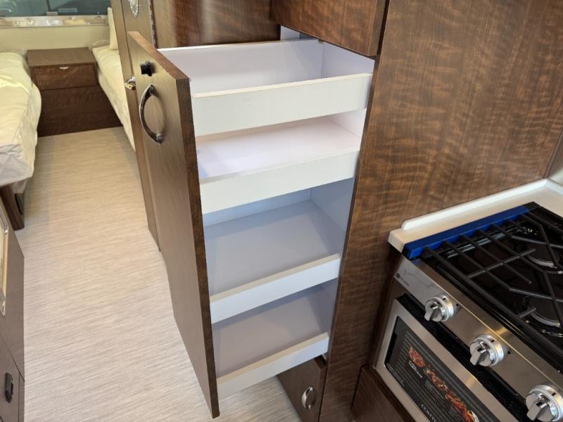 You will find comfort and luxury all throughout this travel trailer! From the front twin beds with AdaptaFlex memory foam mattresses and nightstands on either side, to the rear L-shaped lounge that you can enjoy your meals at and convert into an extra sleeping space. The separated bathroom has a private toilet and vanity together across from an independent shower with a seat to freshen up each morning. You can prepare your best meals in the ultra-modern kitchen with the stainless steel three burner cooktop, the oven, the deep stainless steel Moen sink, and the DuPont Corian countertops will be easy to clean, plus they have multifunctional storage bins that are flush to the surface behind the sink.