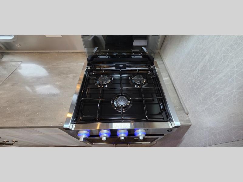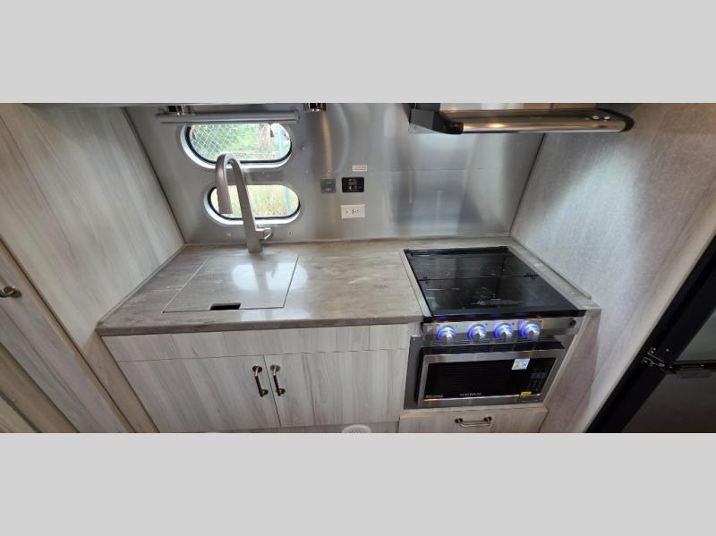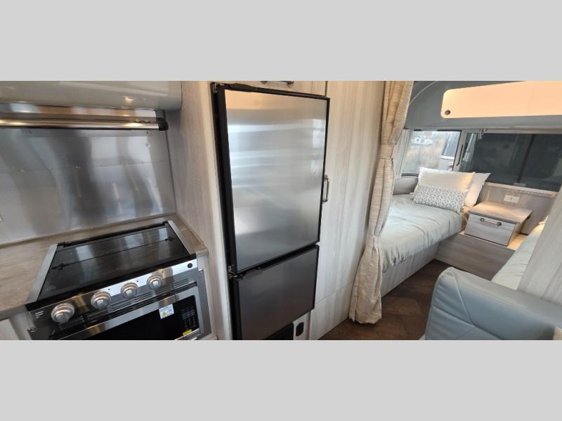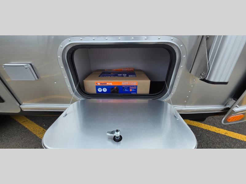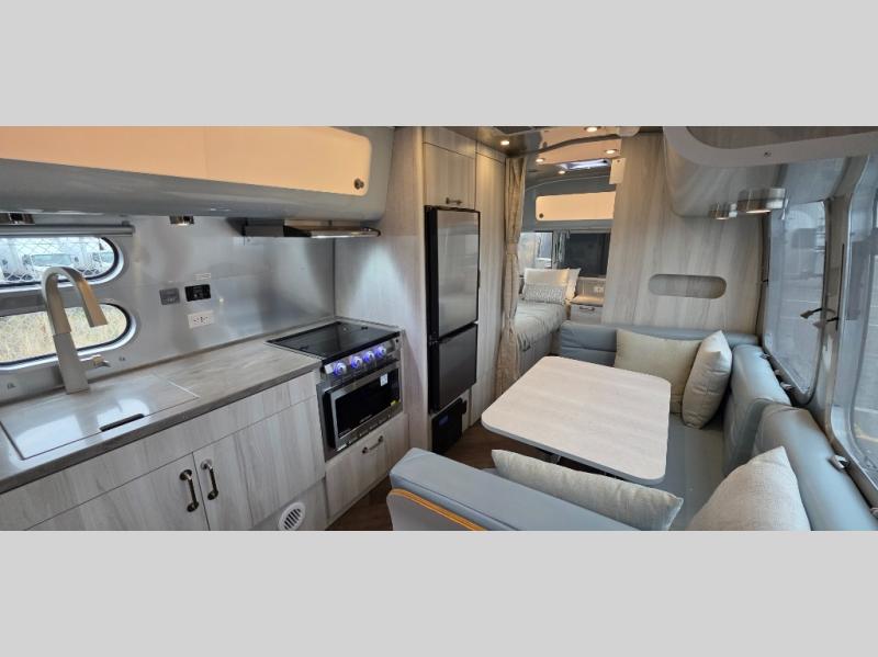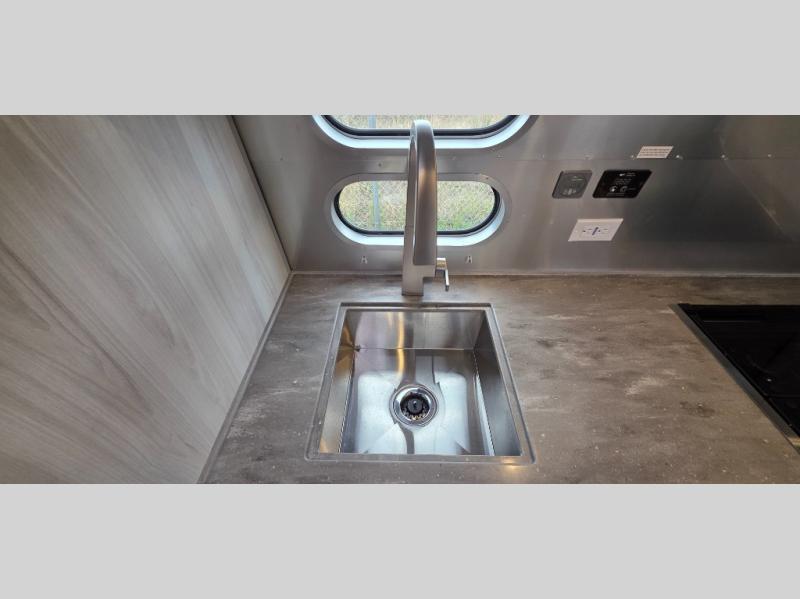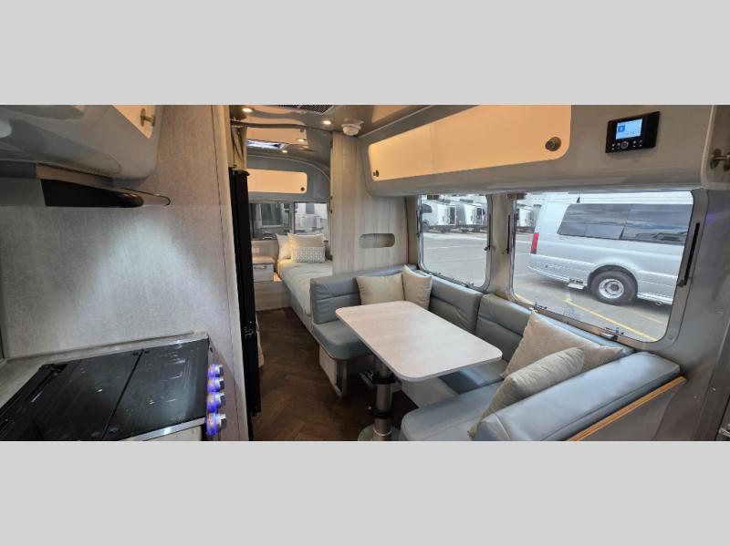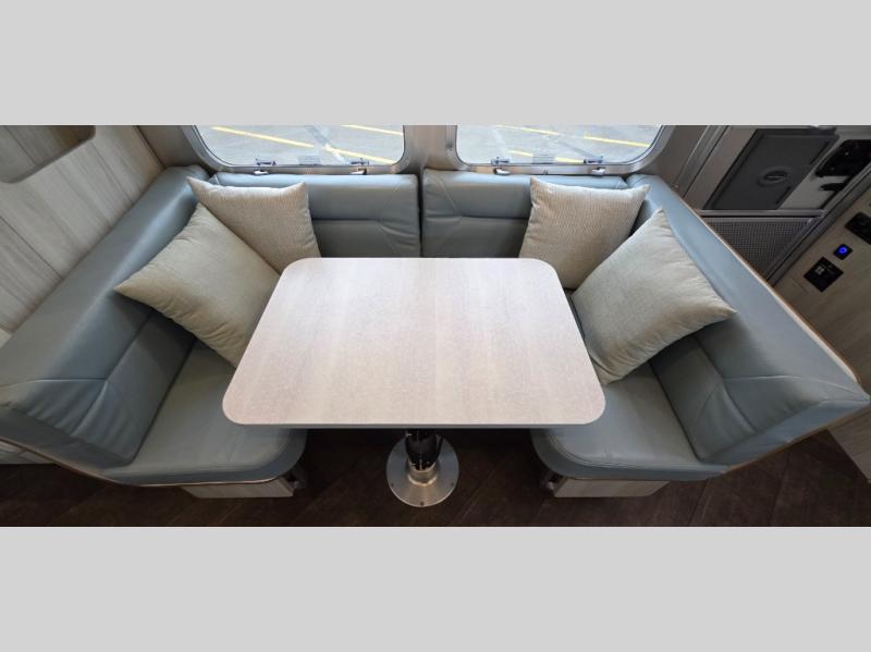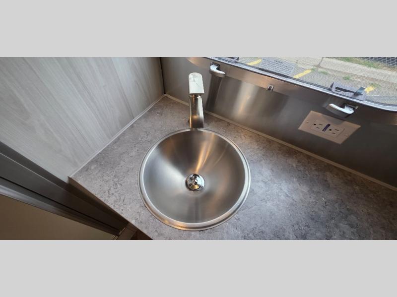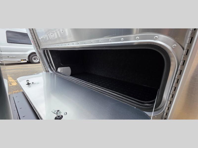 Every time you step foot into the Airstream International travel trailer, you will feel as if you are breathing in a breath of fresh air! The fresh coastal décor was inspired by the waterfront, and the stylish interior delivers a relaxing environment and comfortable luxury. The panoramic windows increase the amount of natural sunlight that streams through to the interior, but they also have blackout shades that you can close whenever you need a darkened room. The beautiful handcrafted marine-grade Lite-Ply laminated cabinetry is an attractive base for the overhead storage lockers that have sliding doors and LED lighting. The dimmable interior LED lighting will create the perfect amount of illumination for you as you spend time indoors. The exterior has excellent features as well with its enclosed aluminum insulated heated underbelly, unique front door key with heavy-duty deadbolt, optional solar package, solar front window protection, and exterior shower with hot and cold water.