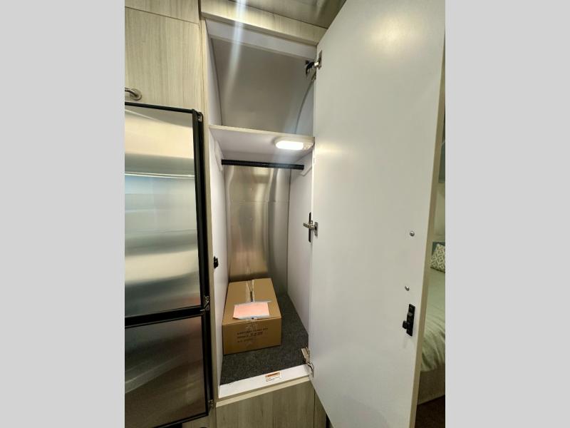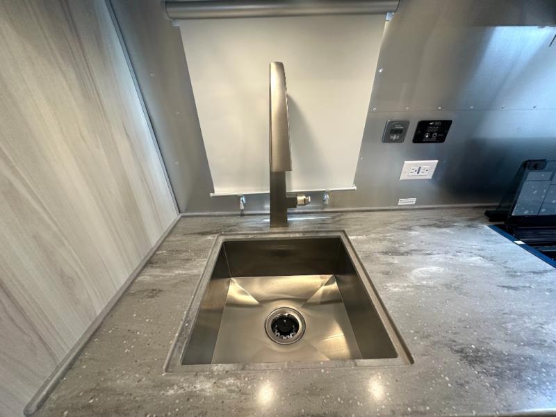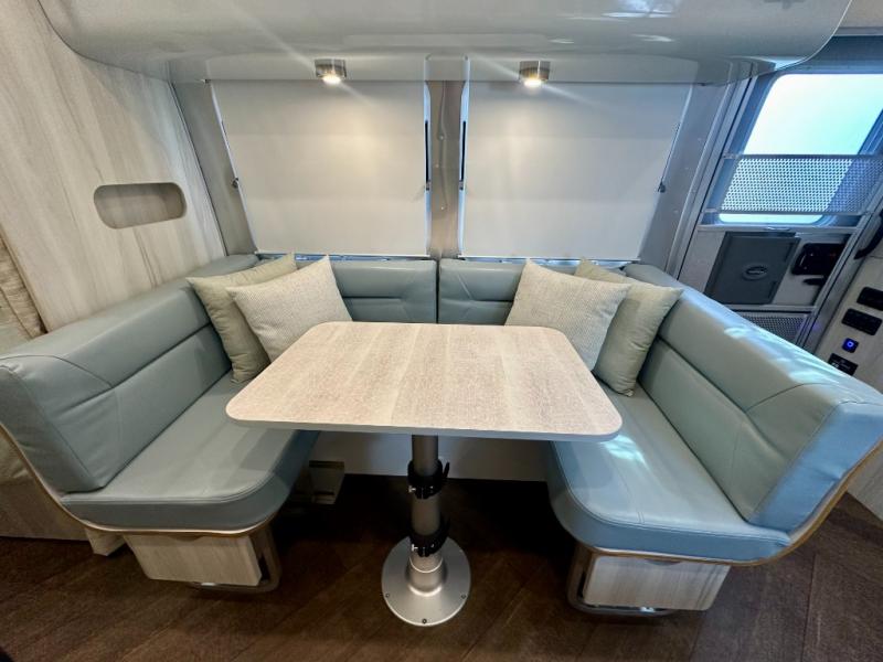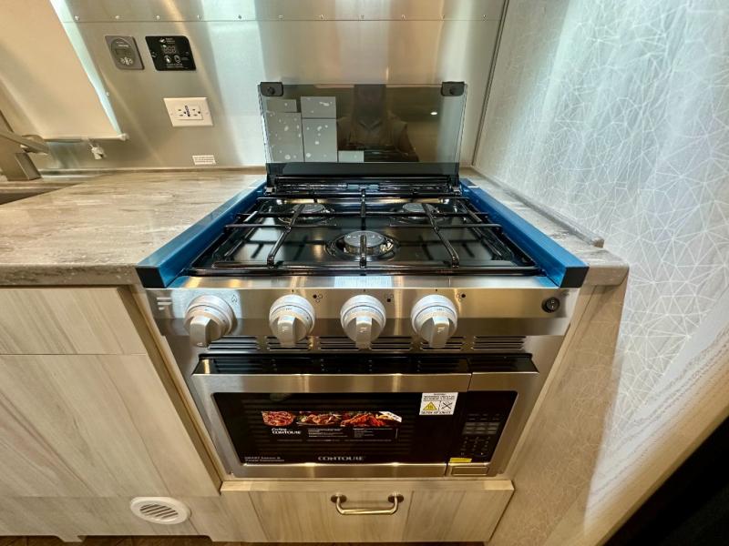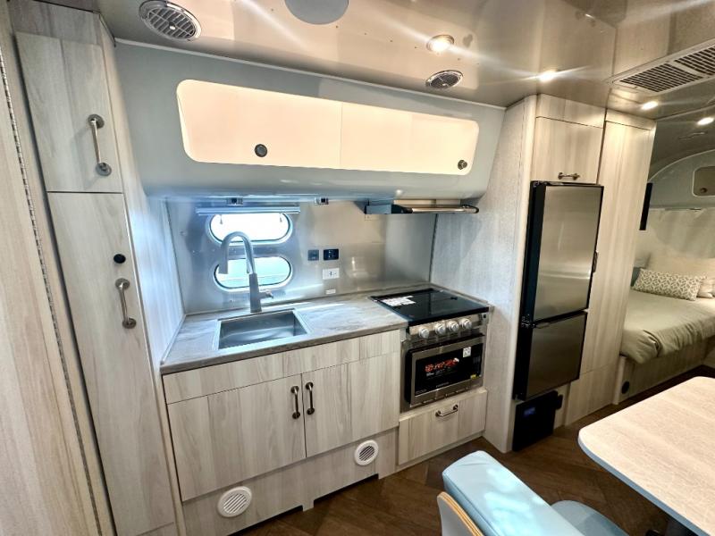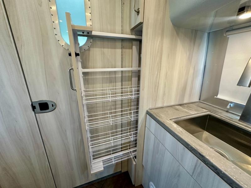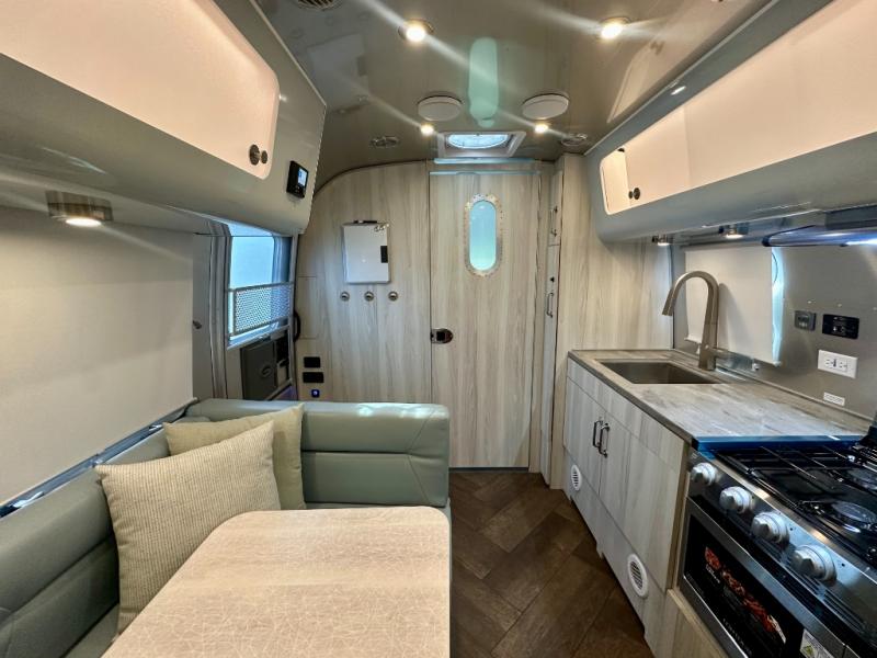 Every time you step foot into the Airstream International travel trailer, you will feel as if you are breathing in a breath of fresh air! The fresh coastal décor was inspired by the waterfront, and the stylish interior delivers a relaxing environment and comfortable luxury. The panoramic windows increase the amount of natural sunlight that streams through to the interior, but they also have blackout shades that you can close whenever you need a darkened room. The beautiful handcrafted marine-grade Lite-Ply laminated cabinetry is an attractive base for the overhead storage lockers that have sliding doors and LED lighting. The dimmable interior LED lighting will create the perfect amount of illumination for you as you spend time indoors. The exterior has excellent features as well with its enclosed aluminum insulated heated underbelly, unique front door key with heavy-duty deadbolt, optional solar package, solar front window protection, and exterior shower with hot and cold water.