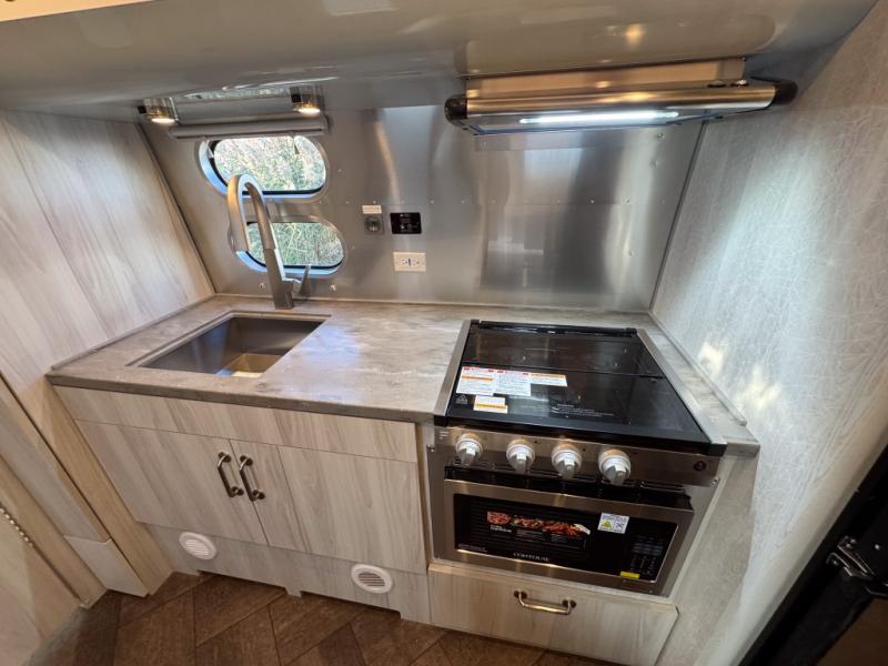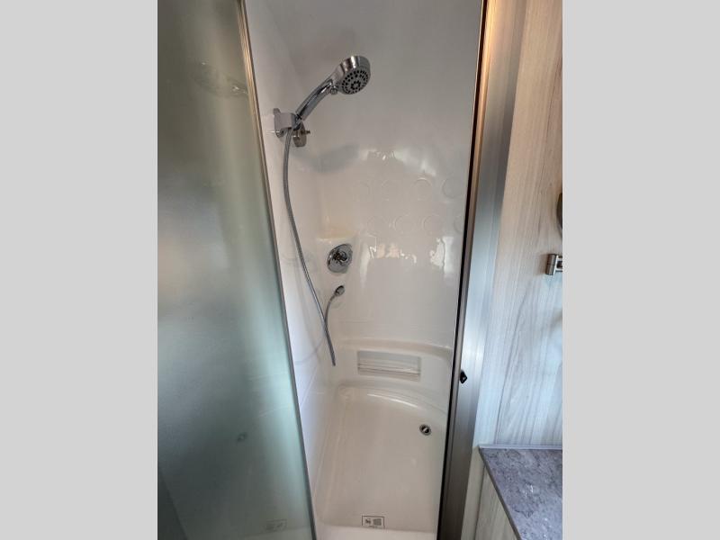 Every time you step foot into the Airstream International travel trailer, you will feel as if you are breathing in a breath of fresh air! The fresh coastal décor was inspired by the waterfront, and the stylish interior delivers a relaxing environment and comfortable luxury. The panoramic windows increase the amount of natural sunlight that streams through to the interior, but they also have blackout shades that you can close whenever you need a darkened room. The beautiful handcrafted marine-grade Lite-Ply laminated cabinetry is an attractive base for the overhead storage lockers that have sliding doors and LED lighting. The dimmable interior LED lighting will create the perfect amount of illumination for you as you spend time indoors. The exterior has excellent features as well with its enclosed aluminum insulated heated underbelly, unique front door key with heavy-duty deadbolt, optional solar package, solar front window protection, and exterior shower with hot and cold water.
