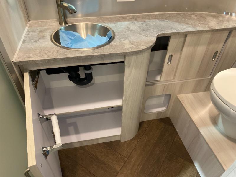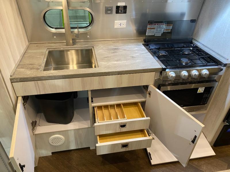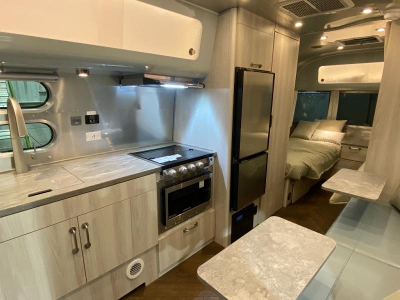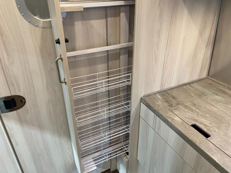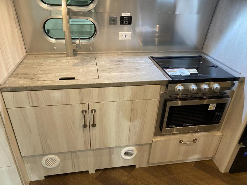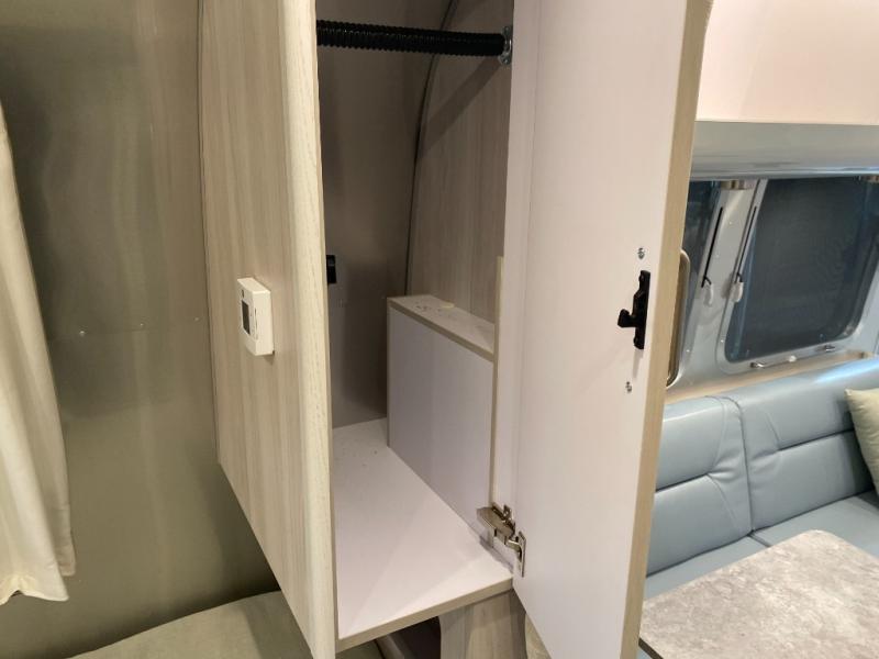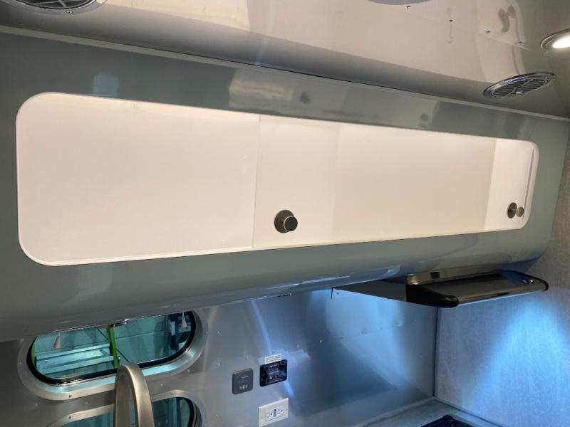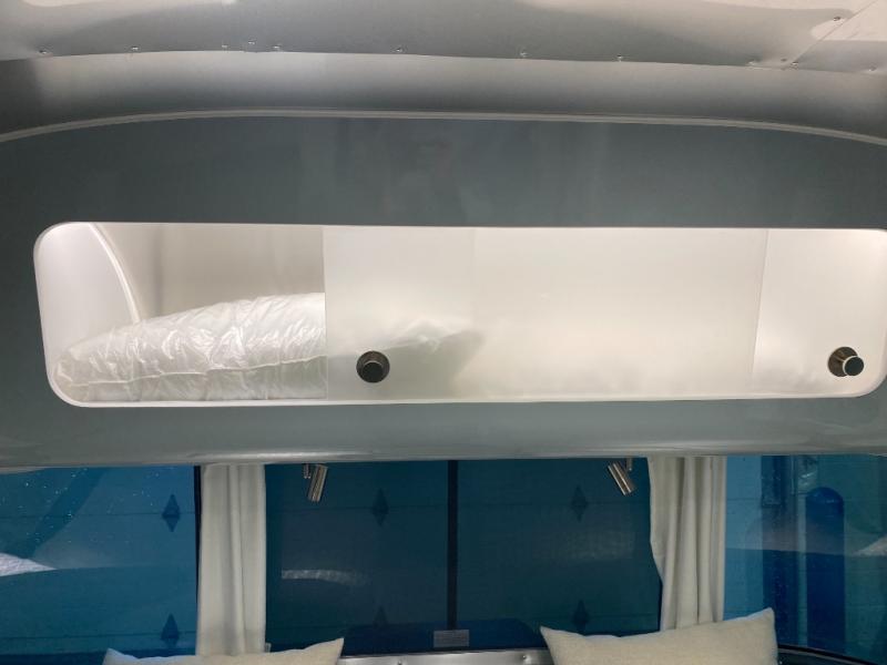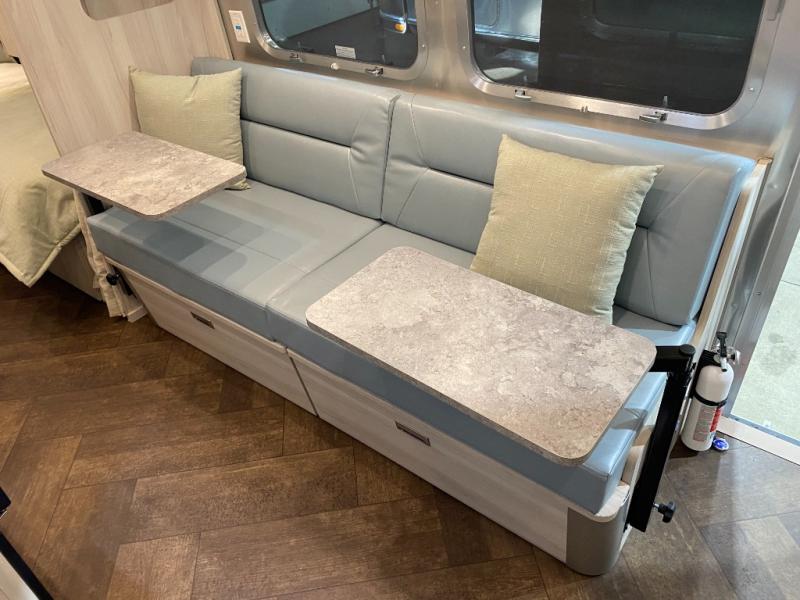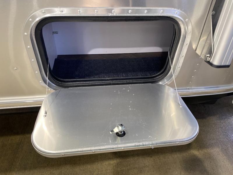 Every time you step foot into the Airstream International travel trailer, you will feel as if you are breathing in a breath of fresh air! The fresh coastal décor was inspired by the waterfront, and the stylish interior delivers a relaxing environment and comfortable luxury. The panoramic windows increase the amount of natural sunlight that streams through to the interior, but they also have blackout shades that you can close whenever you need a darkened room. The beautiful handcrafted marine-grade Lite-Ply laminated cabinetry is an attractive base for the overhead storage lockers that have sliding doors and LED lighting. The dimmable interior LED lighting will create the perfect amount of illumination for you as you spend time indoors. The exterior has excellent features as well with its enclosed aluminum insulated heated underbelly, unique front door key with heavy-duty deadbolt, optional solar package, solar front window protection, and exterior shower with hot and cold water.