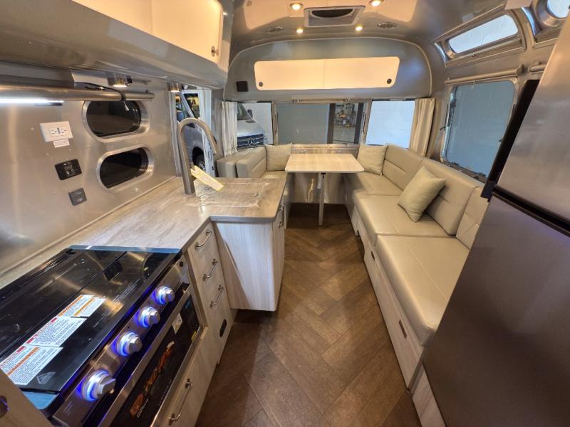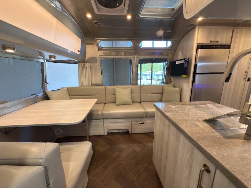 Every time you step foot into the Airstream International travel trailer, you will feel as if you are breathing in a breath of fresh air! The fresh coastal décor was inspired by the waterfront, and the stylish interior delivers a relaxing environment and comfortable luxury. The panoramic windows increase the amount of natural sunlight that streams through to the interior, but they also have blackout shades that you can close whenever you need a darkened room. The beautiful, handcrafted marine-grade Lite-Ply laminated cabinetry is an attractive base for the overhead storage lockers that have sliding doors and LED lighting. The dimmable interior LED lighting will create the perfect amount of illumination for you as you spend time indoors. The exterior has excellent features as well with its enclosed aluminum insulated heated underbelly, unique front door key with heavy-duty deadbolt, optional solar package, solar front window protection, and exterior shower with hot and cold water.