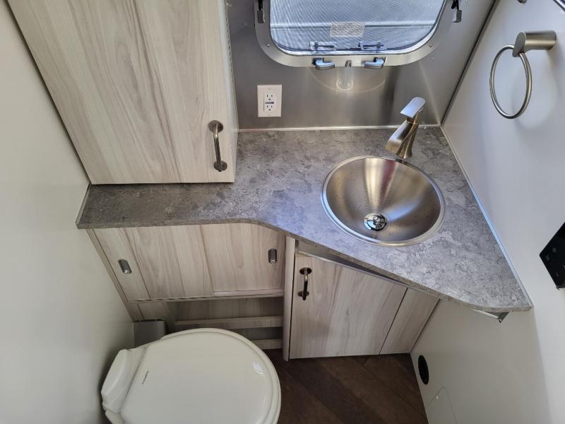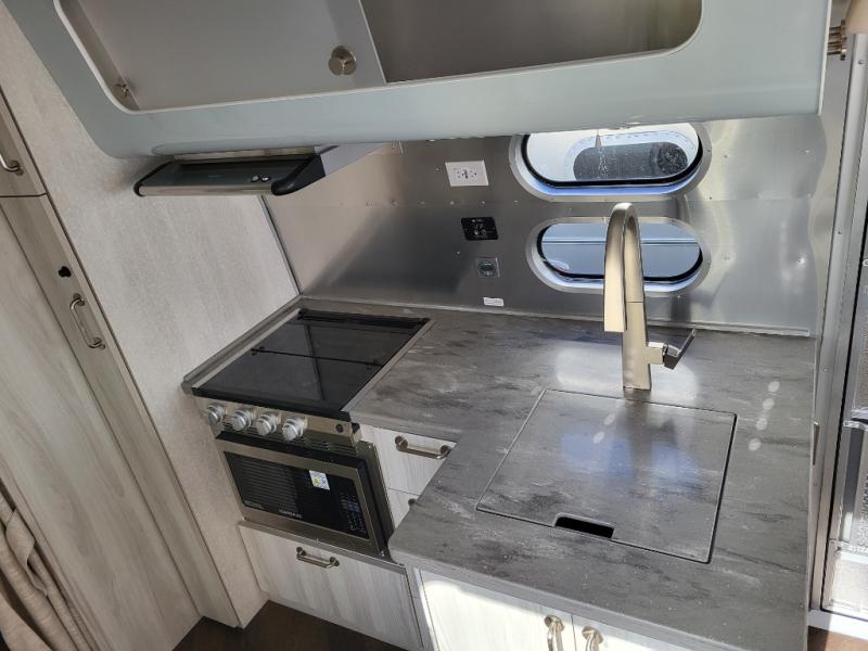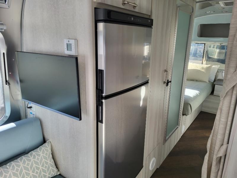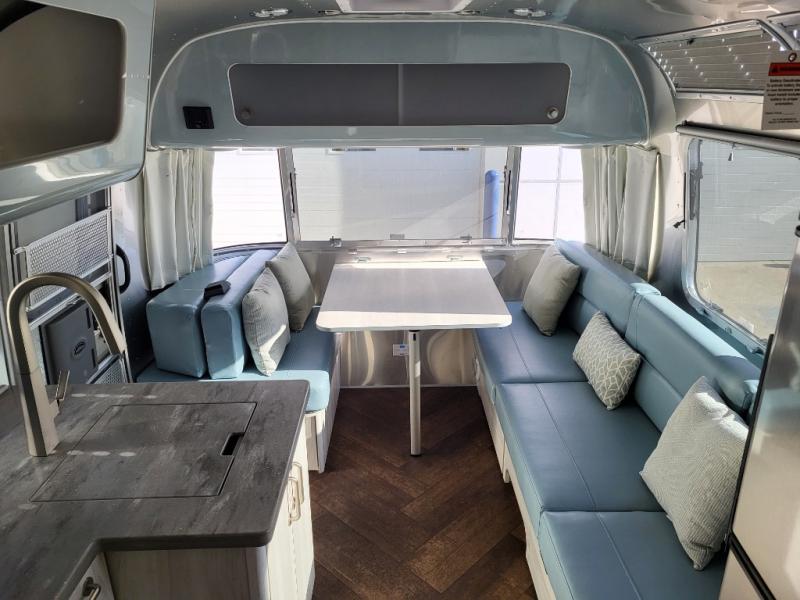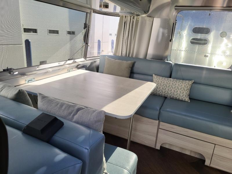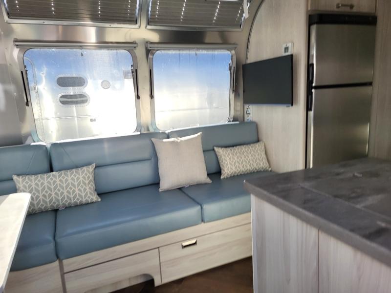 Every time you step foot into the Airstream International travel trailer, you will feel as if you are breathing in a breath of fresh air! The fresh coastal décor was inspired by the waterfront, and the stylish interior delivers a relaxing environment and comfortable luxury. The panoramic windows increase the amount of natural sunlight that streams through to the interior, but they also have blackout shades that you can close whenever you need a darkened room. The beautiful, handcrafted marine-grade Lite-Ply laminated cabinetry is an attractive base for the overhead storage lockers that have sliding doors and LED lighting. The dimmable interior LED lighting will create the perfect amount of illumination for you as you spend time indoors. The exterior has excellent features as well with its enclosed aluminum insulated heated underbelly, unique front door key with heavy-duty deadbolt, optional solar package, solar front window protection, and exterior shower with hot and cold water.