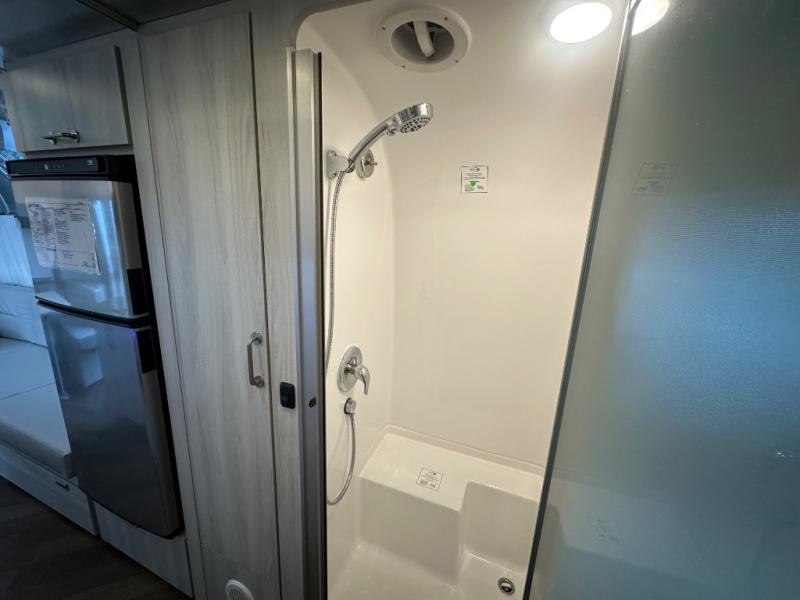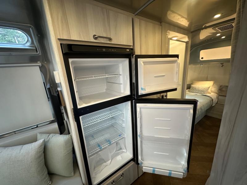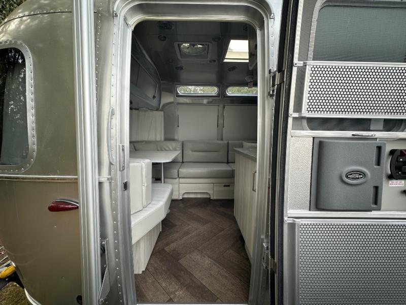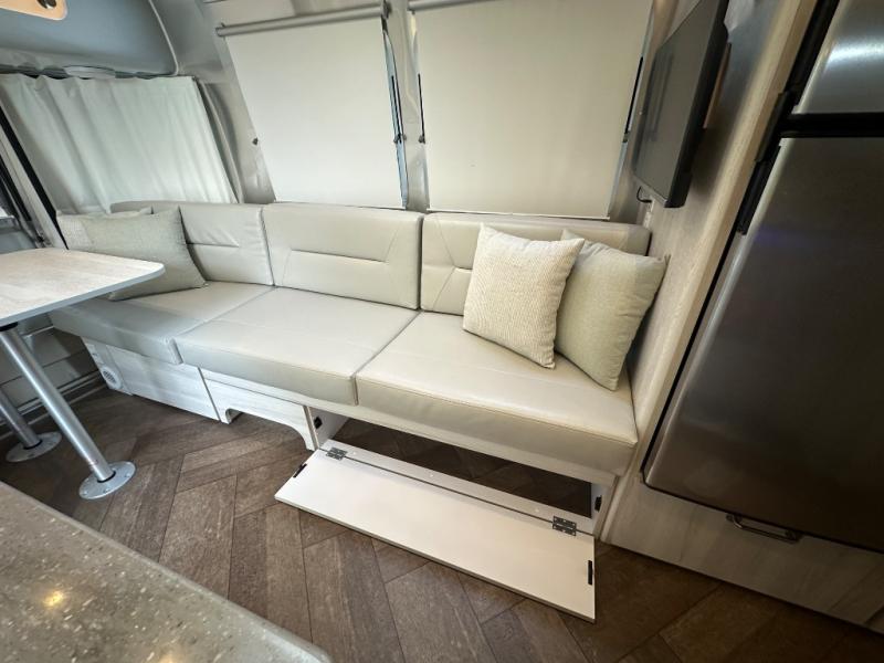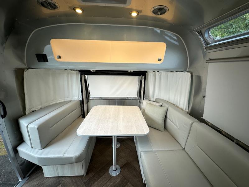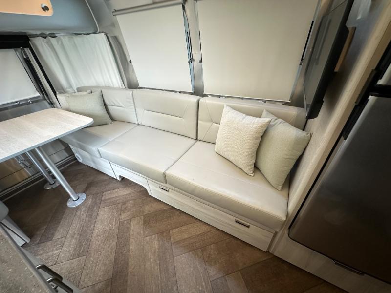 Every time you step foot into the Airstream International travel trailer, you will feel as if you are breathing in a breath of fresh air! The fresh coastal décor was inspired by the waterfront, and the stylish interior delivers a relaxing environment and comfortable luxury. The panoramic windows increase the amount of natural sunlight that streams through to the interior, but they also have blackout shades that you can close whenever you need a darkened room. The beautiful, handcrafted marine-grade Lite-Ply laminated cabinetry is an attractive base for the overhead storage lockers that have sliding doors and LED lighting. The dimmable interior LED lighting will create the perfect amount of illumination for you as you spend time indoors. The exterior has excellent features as well with its enclosed aluminum insulated heated underbelly, unique front door key with heavy-duty deadbolt, optional solar package, solar front window protection, and exterior shower with hot and cold water.