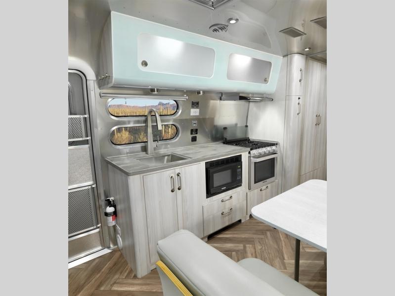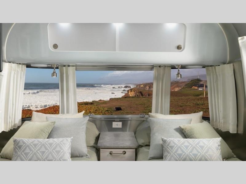 Every time you step foot into the Airstream International travel trailer, you will feel as if you are breathing in a breath of fresh air! The fresh coastal décor was inspired by the waterfront, and the stylish interior delivers a relaxing environment and comfortable luxury. The panoramic windows increase the amount of natural sunlight that streams through to the interior, but they also have blackout shades that you can close whenever you need a darkened room. The beautiful handcrafted marine-grade Lite-Ply laminated cabinetry is an attractive base for the overhead storage lockers that have sliding doors and LED lighting. The dimmable interior LED lighting will create the perfect amount of illumination for you as you spend time indoors. The exterior has excellent features as well with its enclosed aluminum insulated heated underbelly, unique front door key with heavy-duty deadbolt, optional solar package, solar front window protection, and exterior shower with hot and cold water.