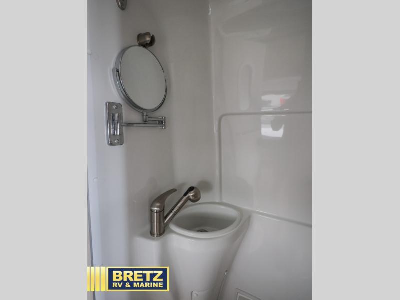 Your adventures are made complete in this 19' coach that can sleep two comfortably. When you arrive at the campground, you can prepare lunch on the single burner induction cooktop, or use the roof locker microwave. There is also a slide out pantry and a 3.2 cu. ft. 12V refrigerator and freezer for your food storage. The rear sofa/bed and side seats convert to a lay-flat bed, giving you the largest best in its class, plus there is a convenient wet bath on board to stay clean throughout your trip.