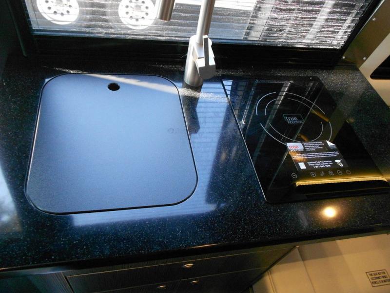 Your adventures are made complete in this 19' coach that can sleep two comfortably. When you arrive at the campground, you can prepare lunch on the single burner induction cooktop, or use the roof locker microwave. There is also a slide out pantry and a 3.2 cu. ft. 12V refrigerator and freezer for your food storage. The rear sofa/bed and side seats convert to a lay-flat bed, giving you the largest best in its class, plus there is a convenient wet bath on board to stay clean throughout your trip.
