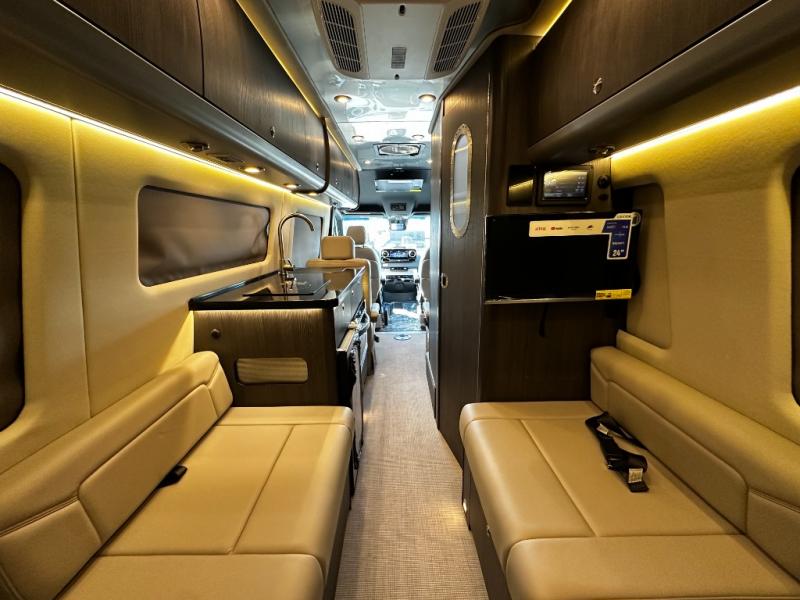 Step inside the 24GL and experience a beautifully crafted interior with handcrafted cabinetry, premium upholstery, and modern finishes. The thoughtfully designed floorplan features a comfortable lounge area, a fully equipped galley kitchen, and a luxurious wet bath. Swivel front seats and a rear seating area convert into a sleeping space, offering flexibility for solo travelers, couples, or small families.